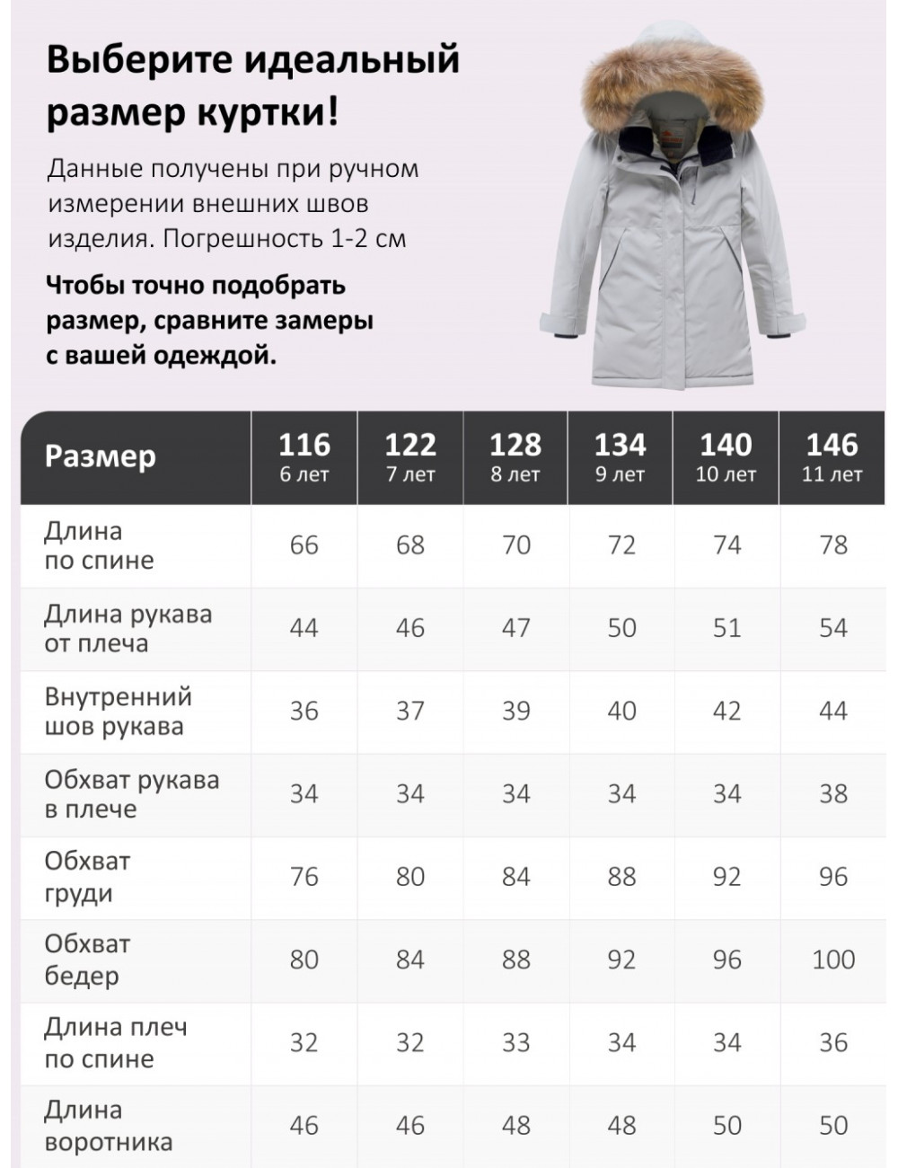 При выборе размера рекомендуется измерить основные параметры: длину куртки, длину рукава, внутренний шов рукава, обхват рукава в плече, обхват груди и обхват бёдер. Используйте сантиметровую ленту для точности измерений.