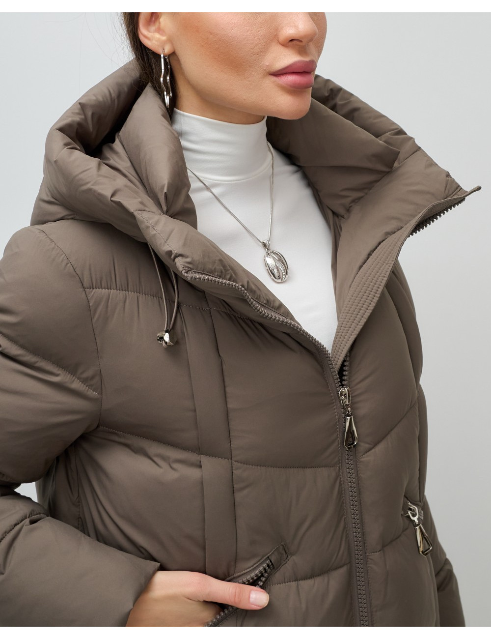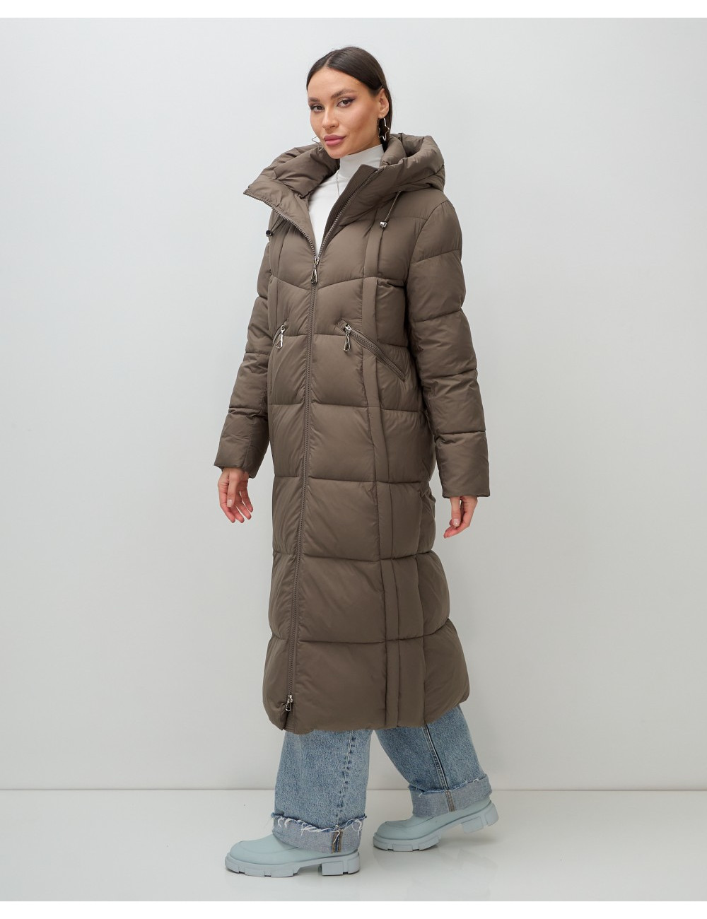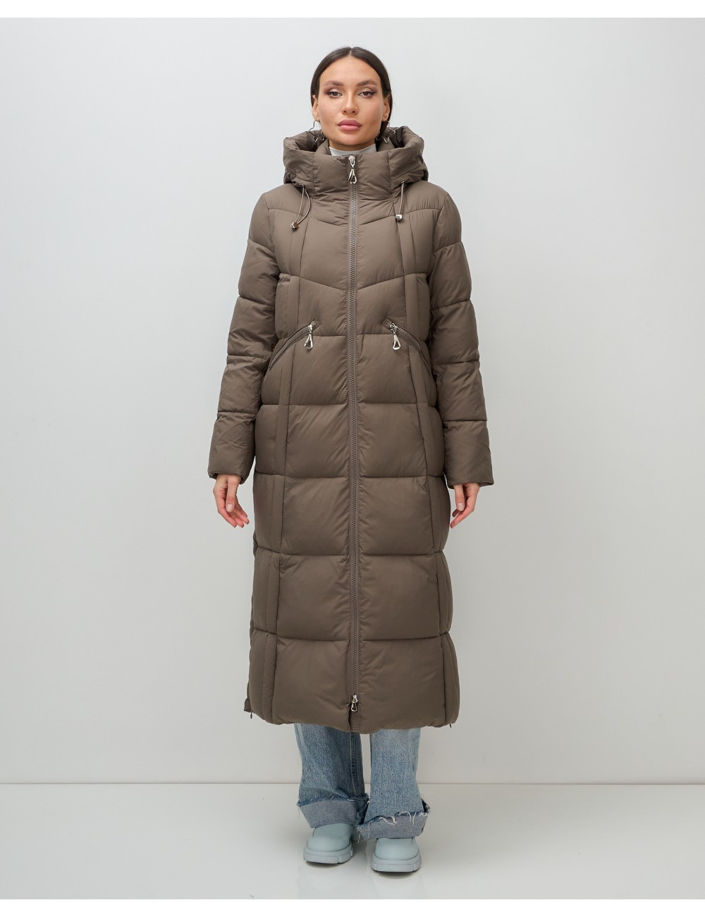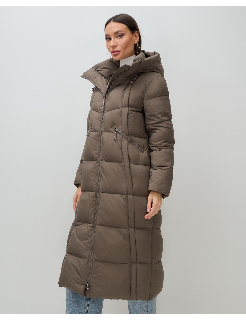 Пуховик доступен в элегантных цветах: тёмно-сером, чёрном, светло-коричневом и коричневом.