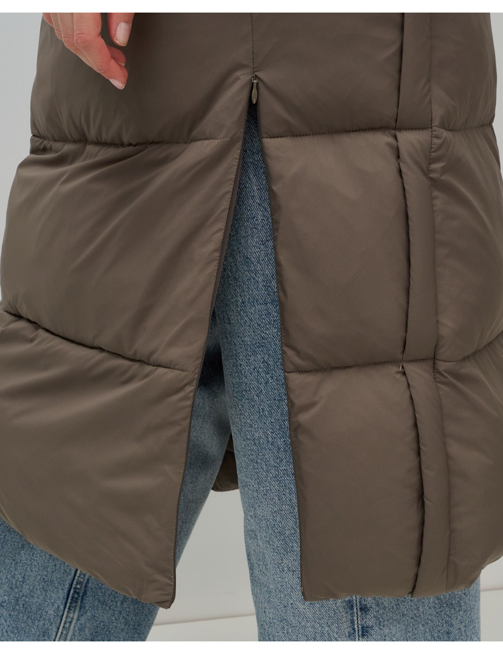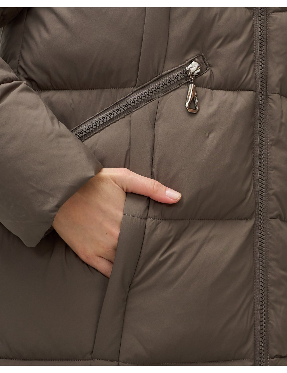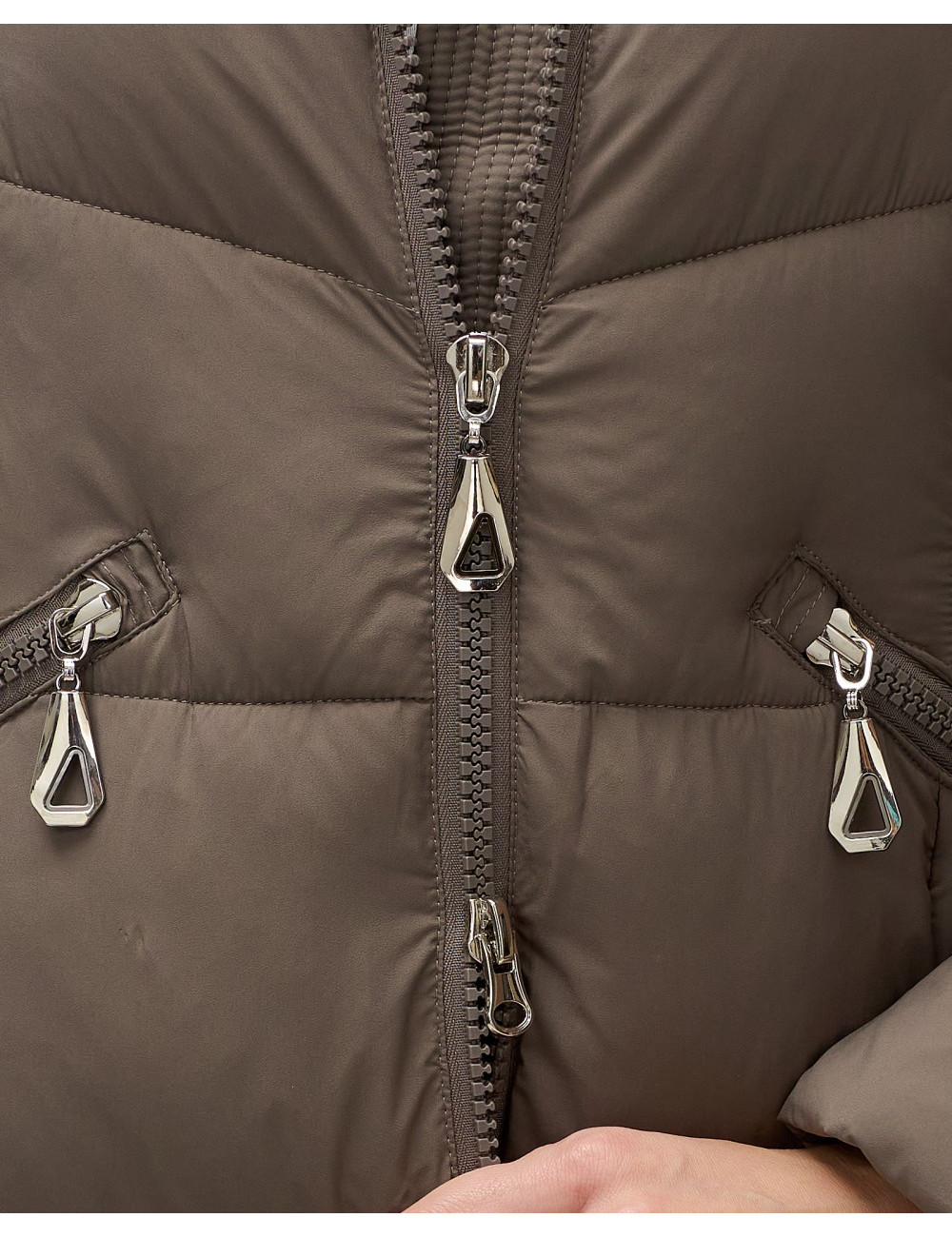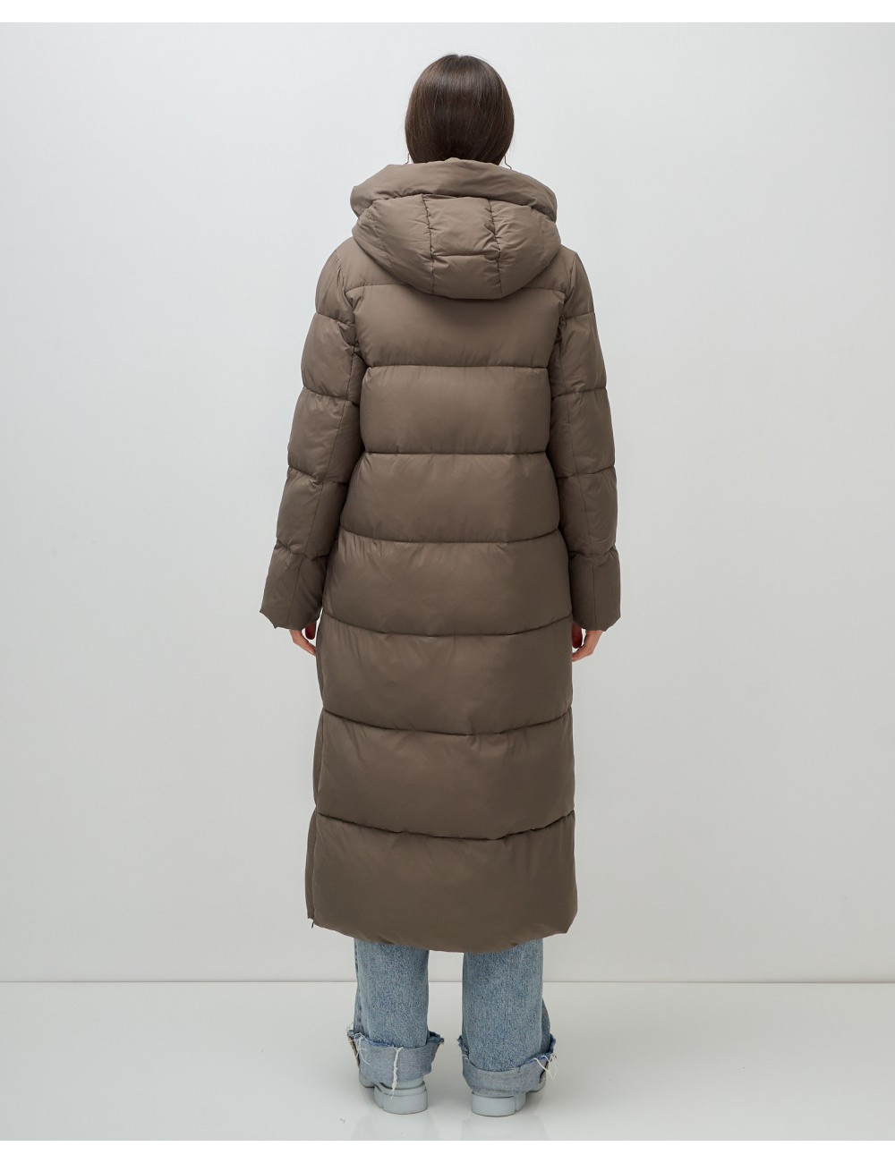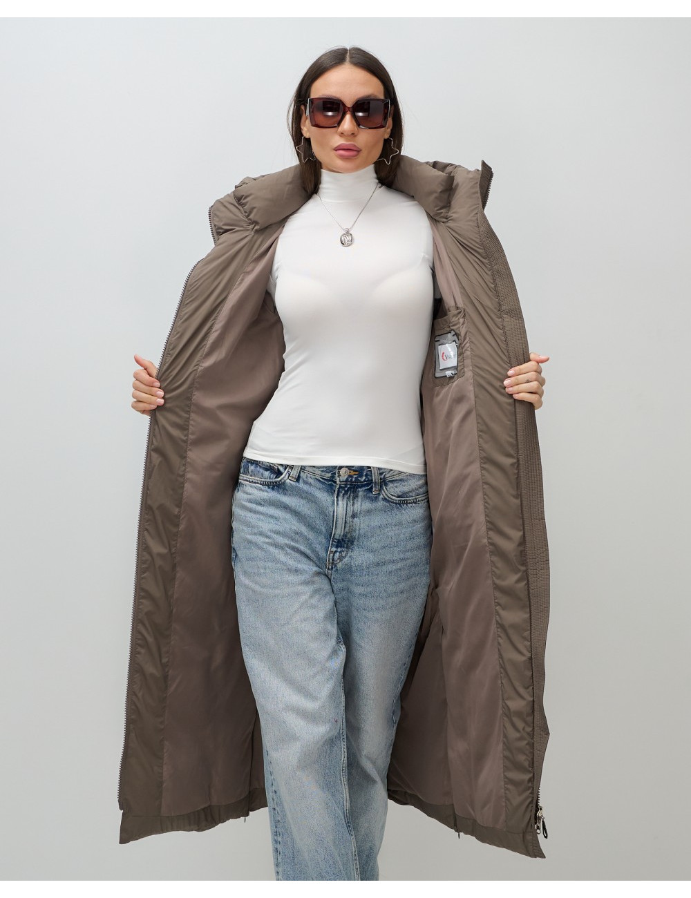 Пуховик доступен в элегантных цветах: тёмно-сером, чёрном, светло-коричневом и коричневом.