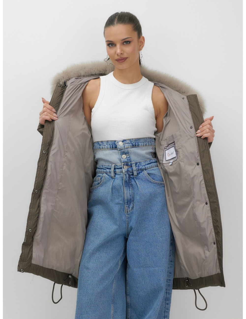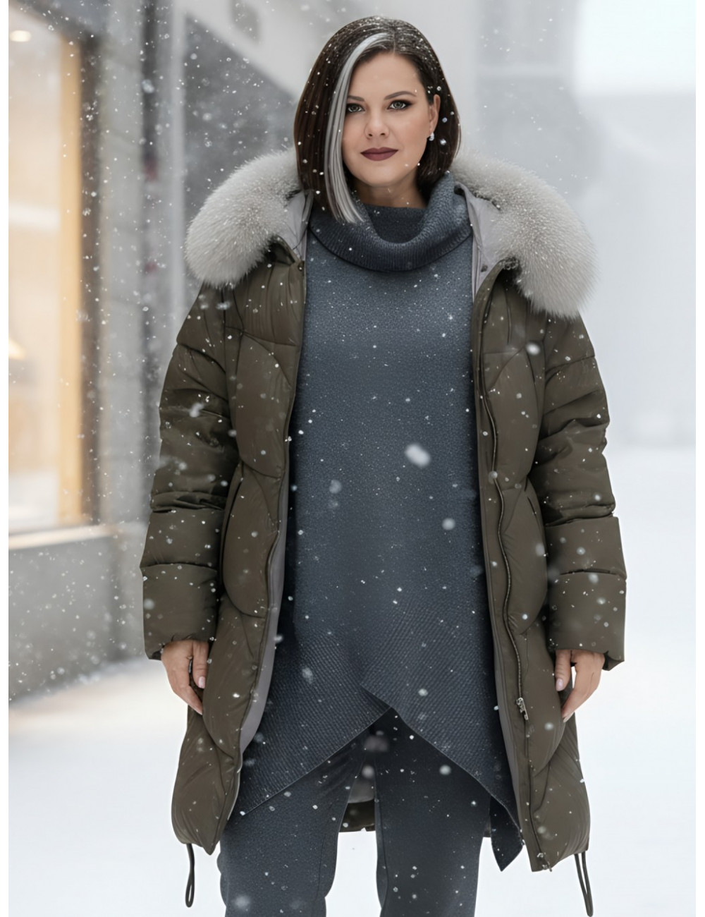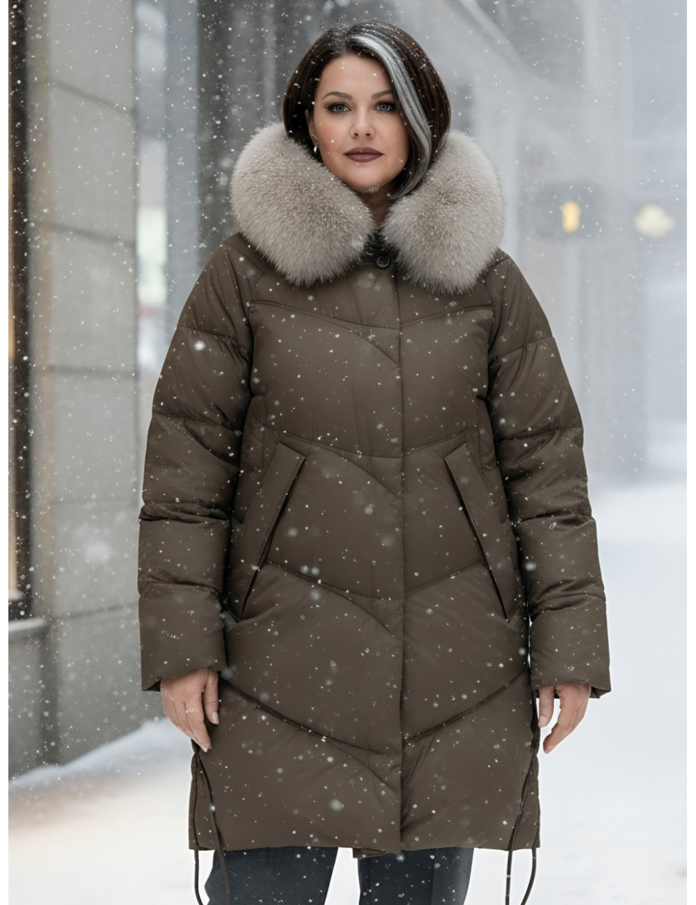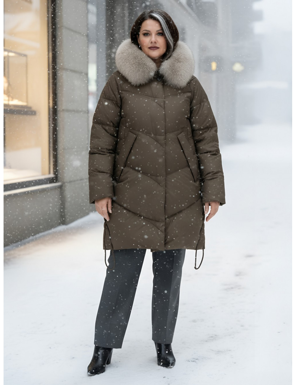 Эти цвета гармонично сочетаются с натуральным мехом песца. Удлинённый силуэт до колена и свободный крой созданы для размеров 46–54. Профессиональный крой обеспечивает безупречную посадку для роста 160–190 см.