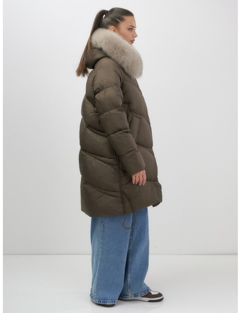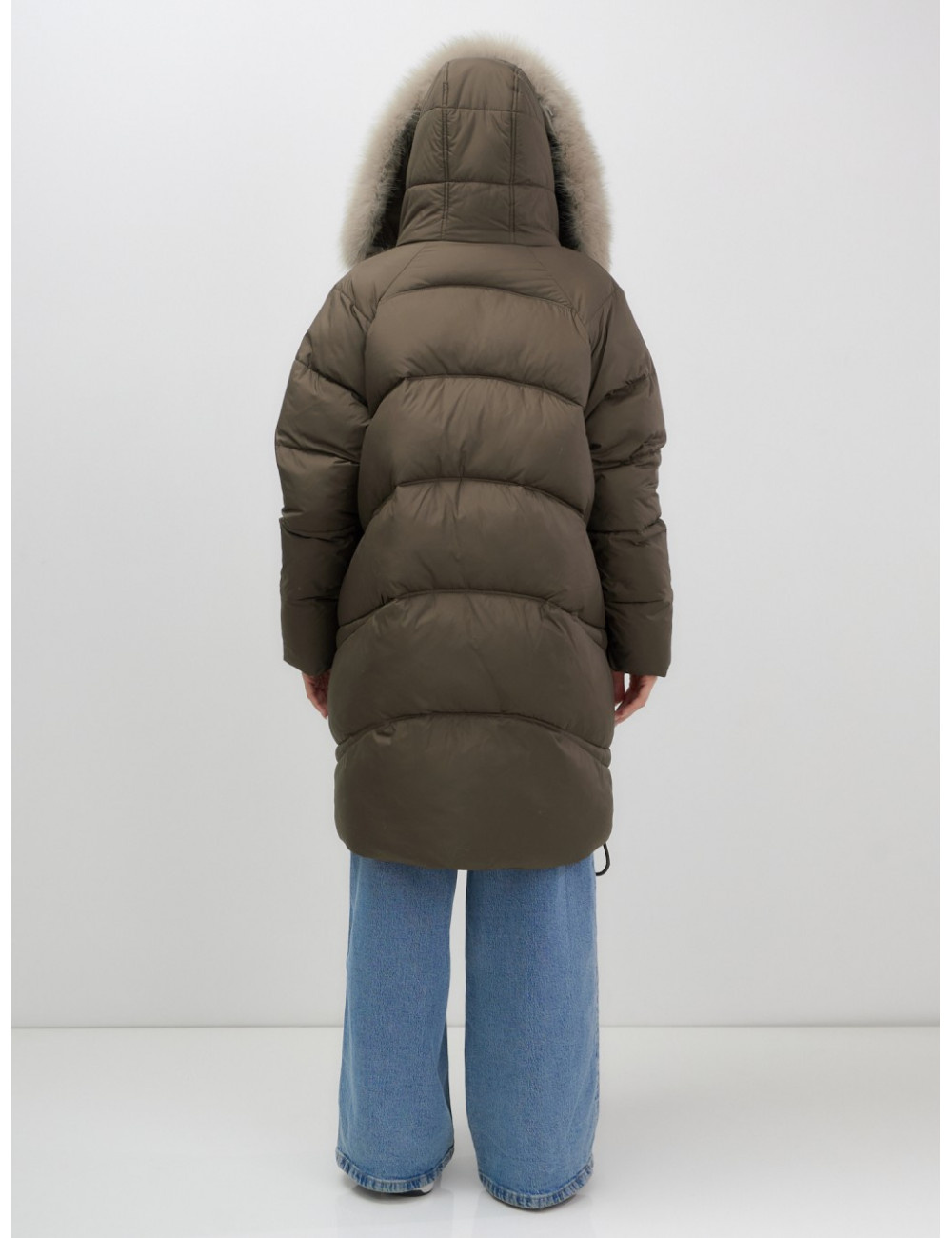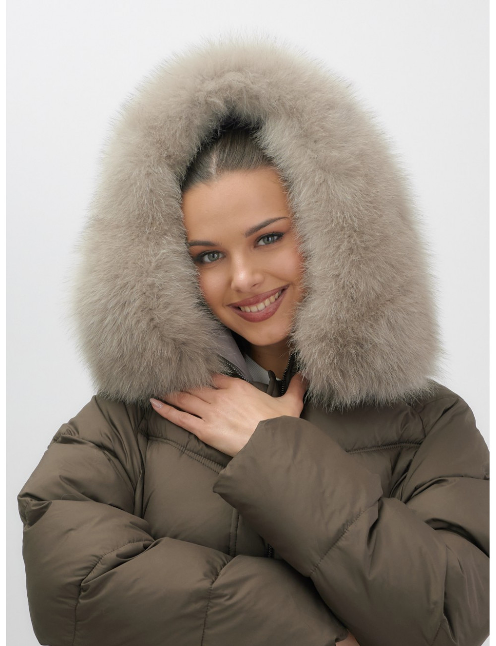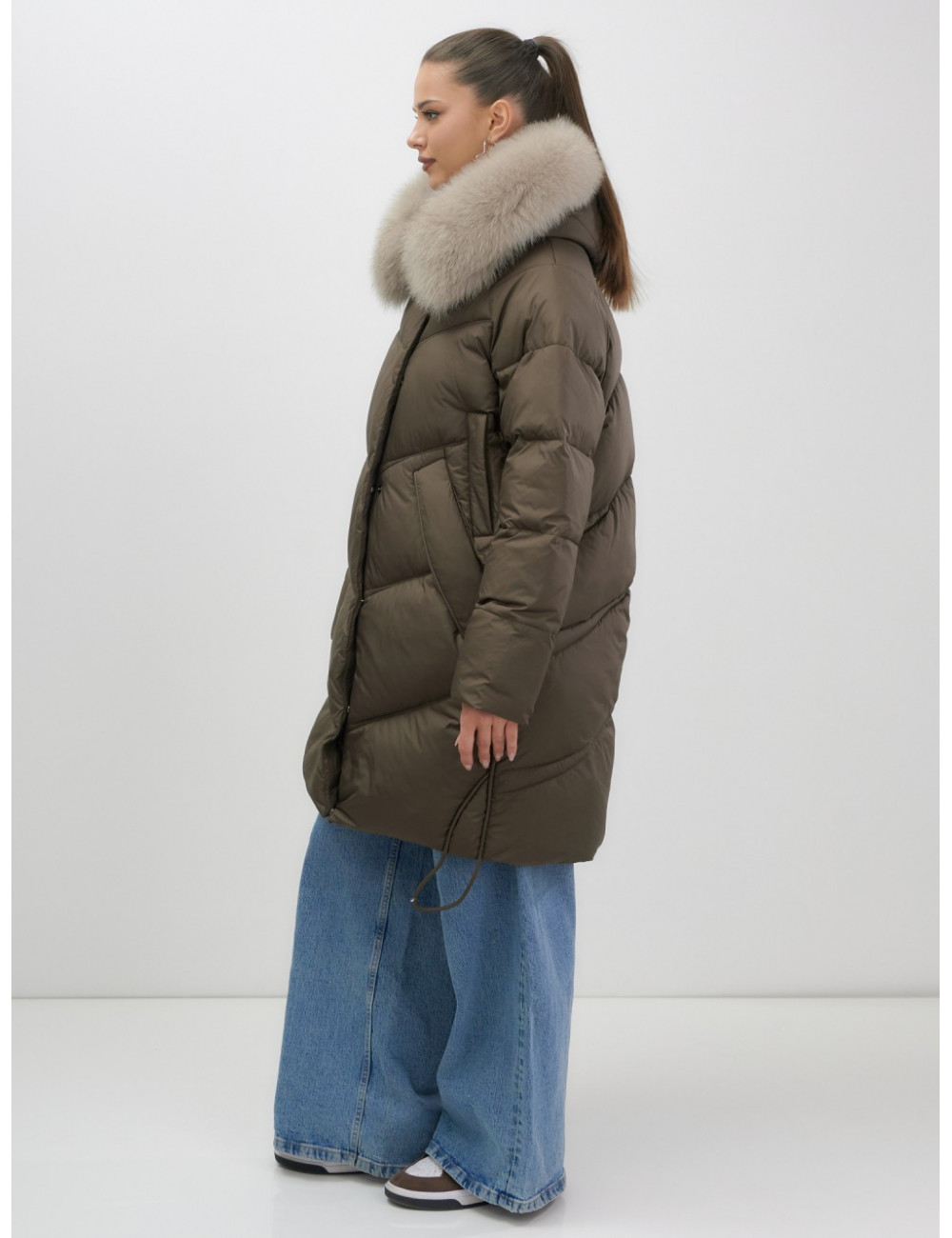 Эти цвета гармонично сочетаются с натуральным мехом песца. Удлинённый силуэт до колена и свободный крой созданы для размеров 46–54. Профессиональный крой обеспечивает безупречную посадку для роста 160–190 см.