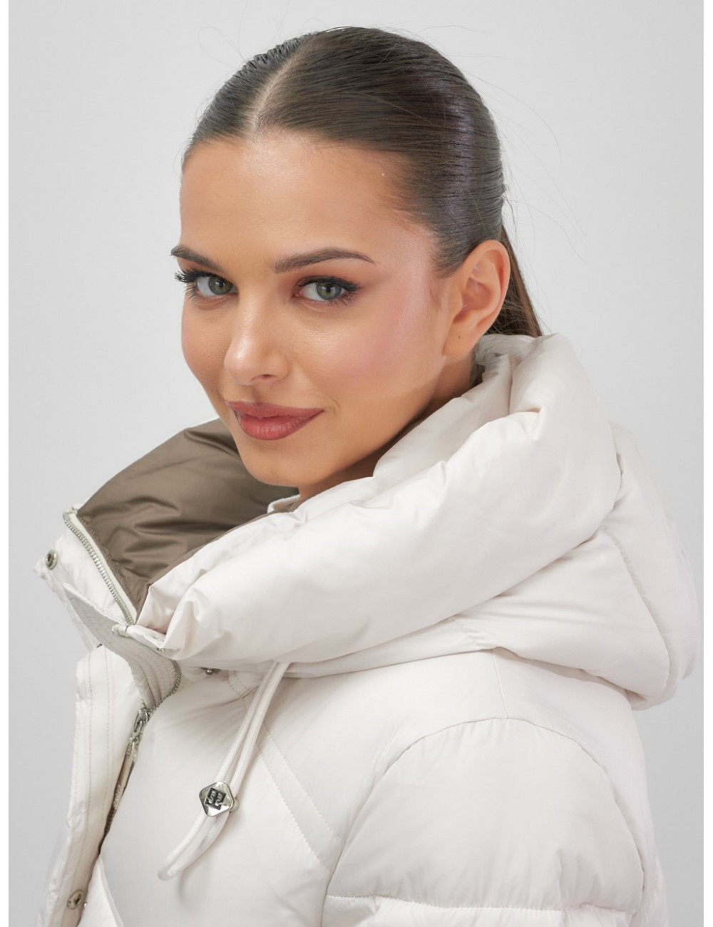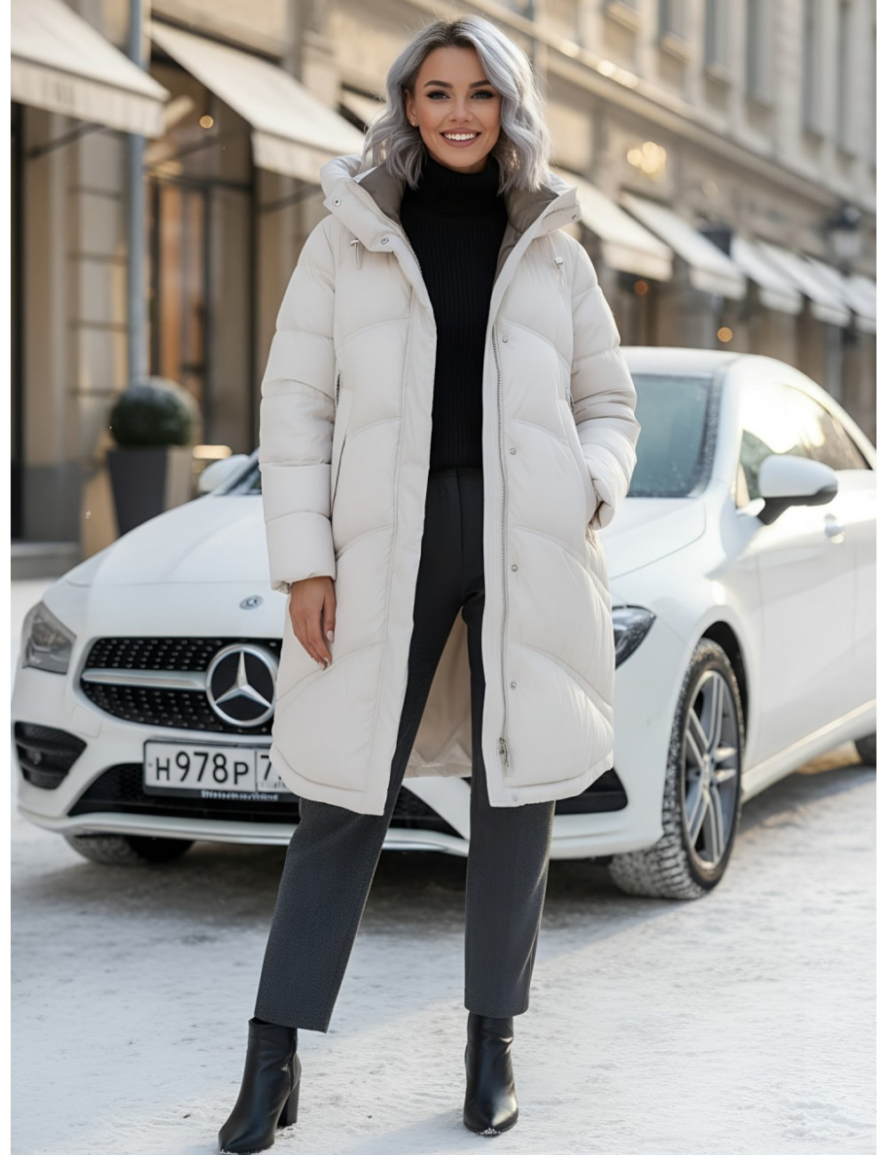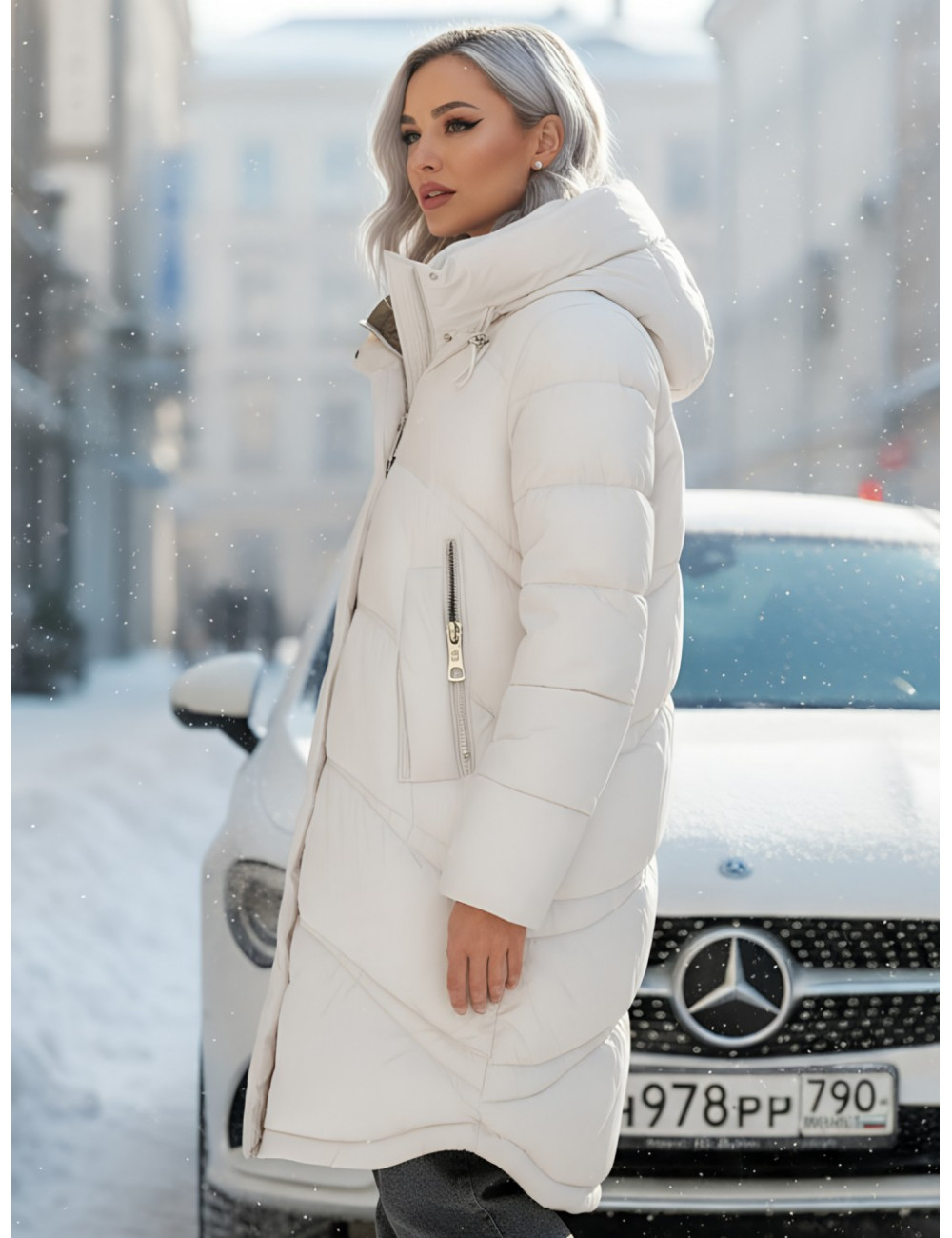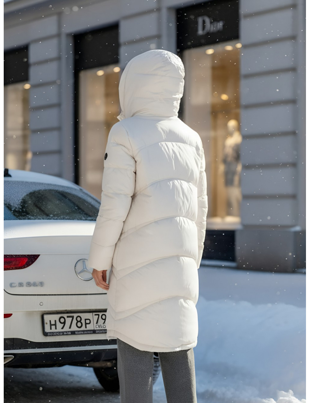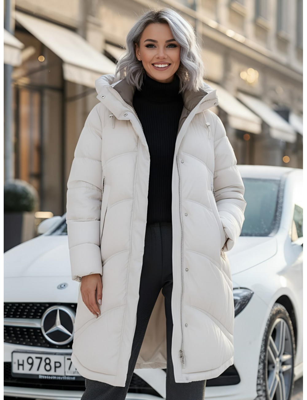 Да, у пуховика есть не съёмный капюшон и фиксирующие элементы по низу, которые обеспечивают дополнительную защиту от ветра и снега. Доставка по Москве и Московской области Длинный пуховик женский утеплённый с капюшоном бежевого цвета.