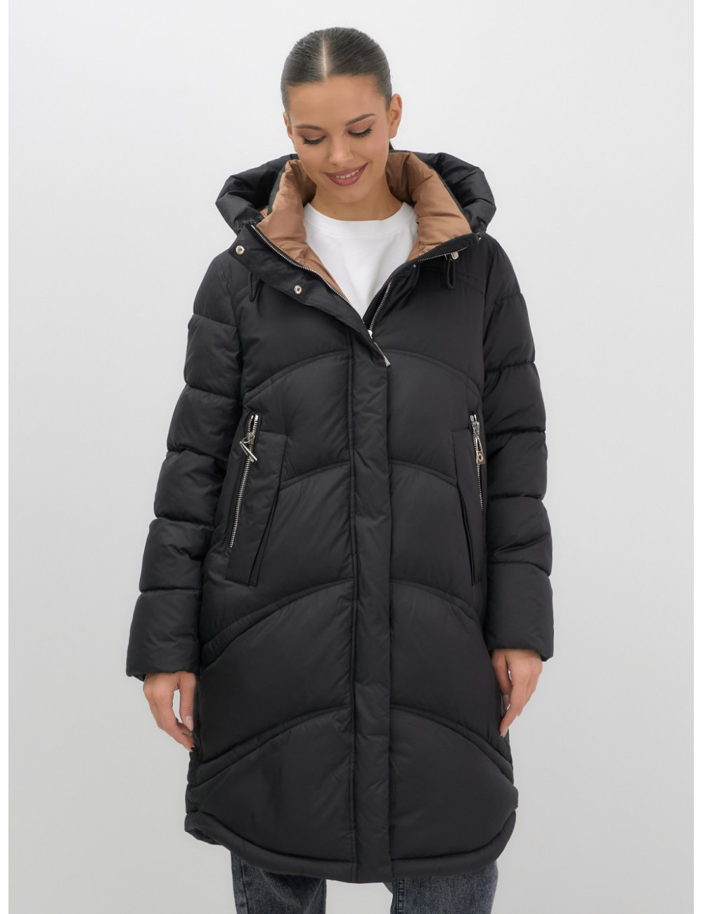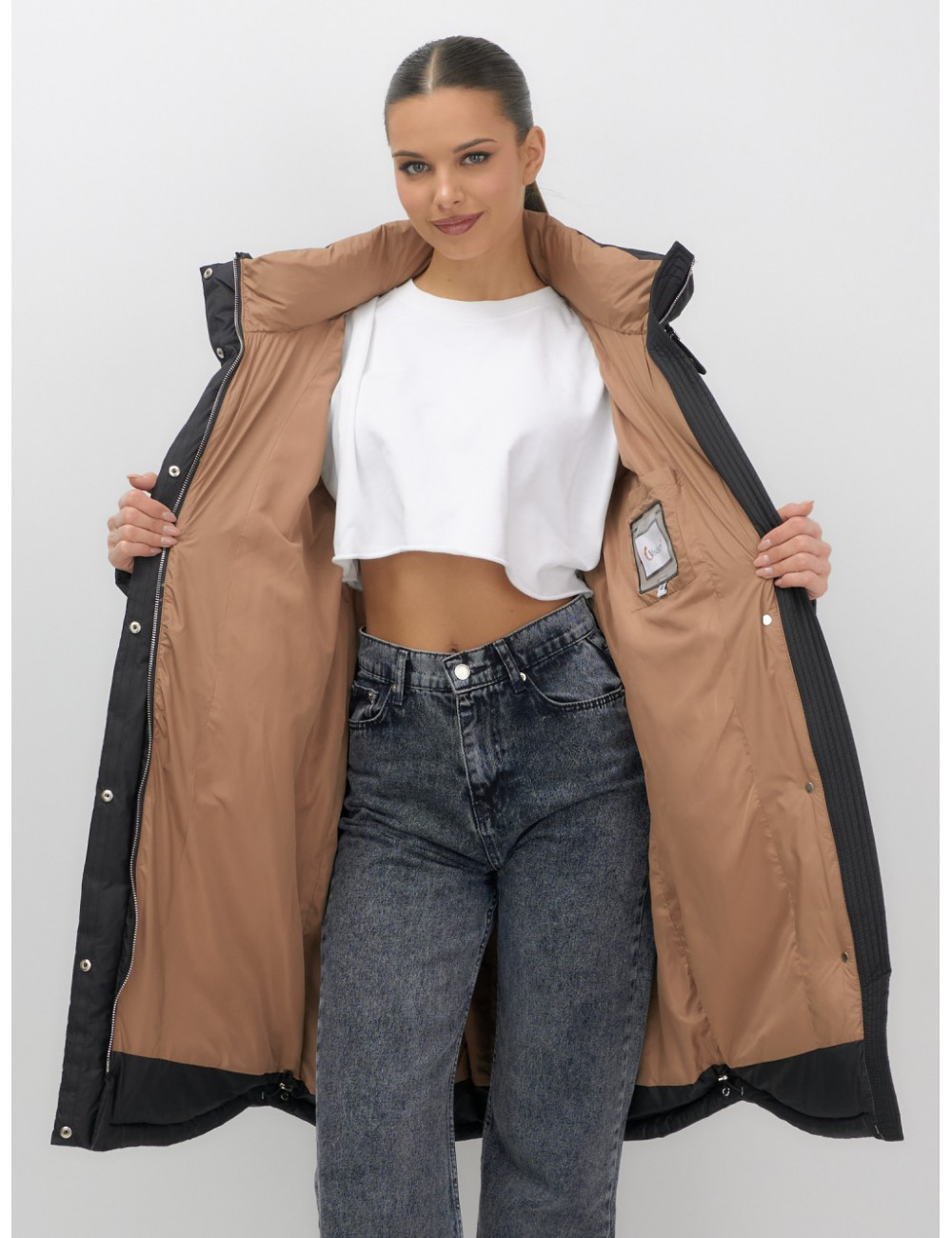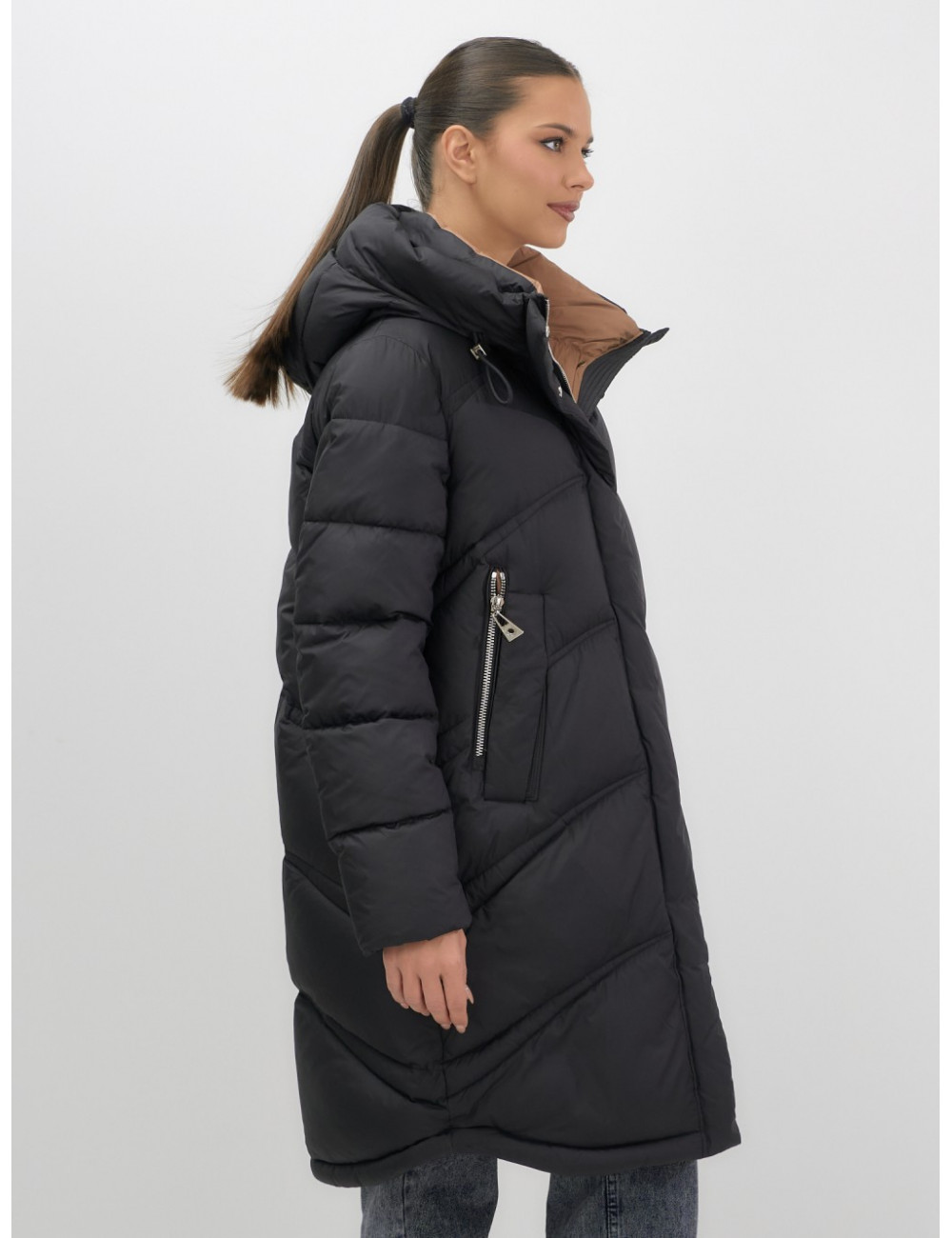 Стилистически модель сочетает в себе элегантный и офисный стиль, подходит для повседневной носки. Пуховик имеет удлинённую длину до колен и стильный стоячий воротник. Не съёмный капюшон и фиксирующие элементы по низу обеспечивают дополнительную защиту от непогоды.