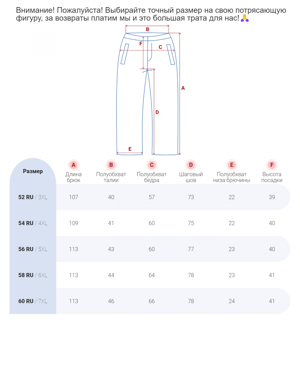 - Высота посадки (по переднему шву, от верхнего среза брюк до шагового шва).