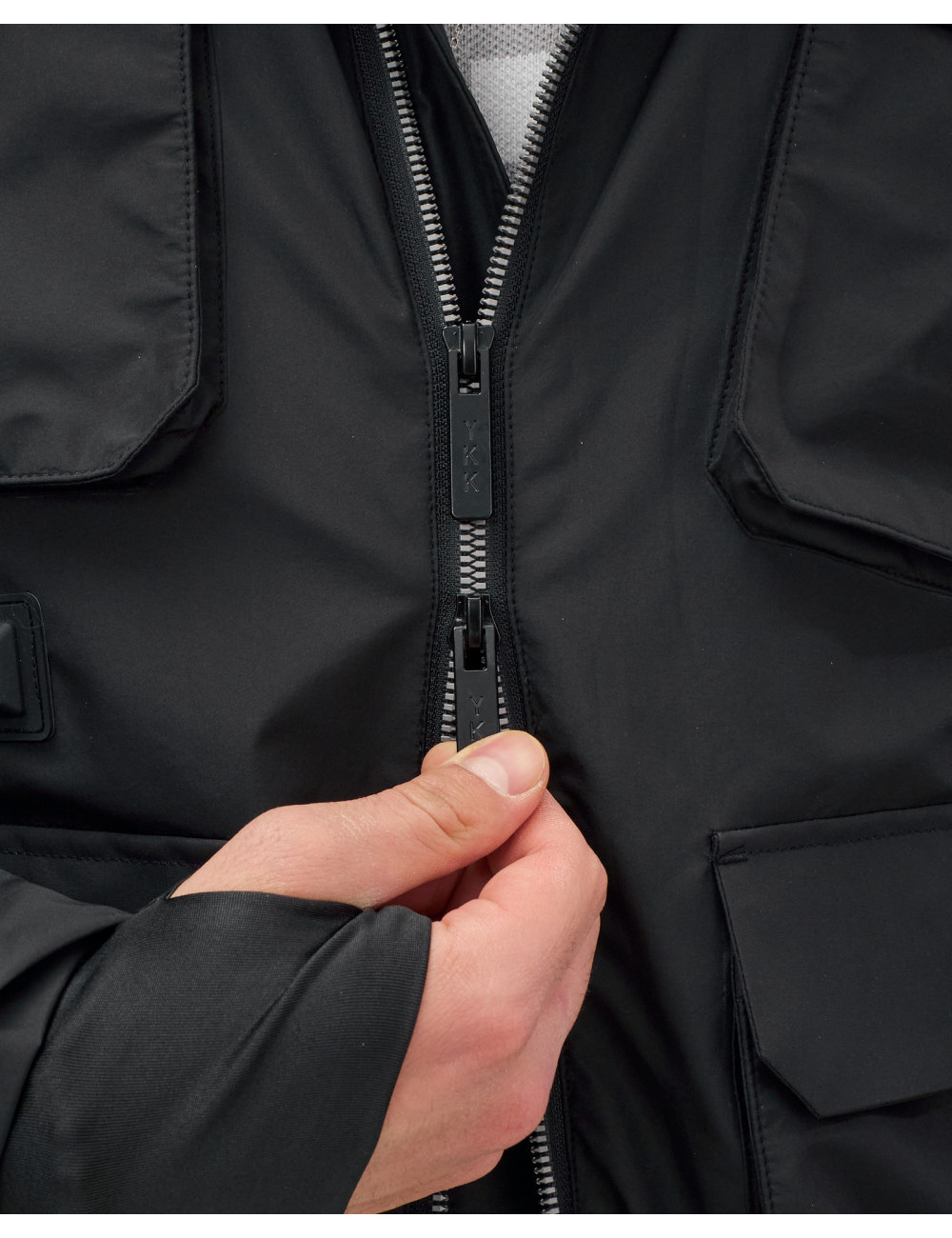 Внутри куртки находится специальный нагревательный элемент, который работает на основе термоэлектрической подкладки. Кнопка включения находится у правого кармана. Пауэрбанк подключается внутри, что позволяет сохранять тепло внутри куртки и предотвращать его выход наружу.