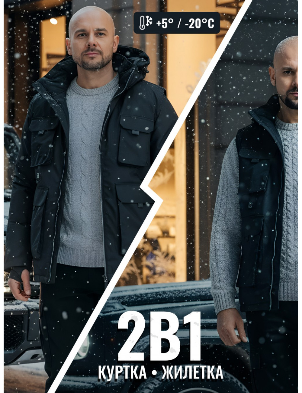 Не упустите возможность приобрести качественную и функциональную куртку-жилетку с подогревом от Ketsi и наслаждайтесь комфортом в холодное время года! Доставка по Москве и Московской области Мужская зимняя куртка-жилетка трансформер с подогревом, чёрная, для активного отдыха.