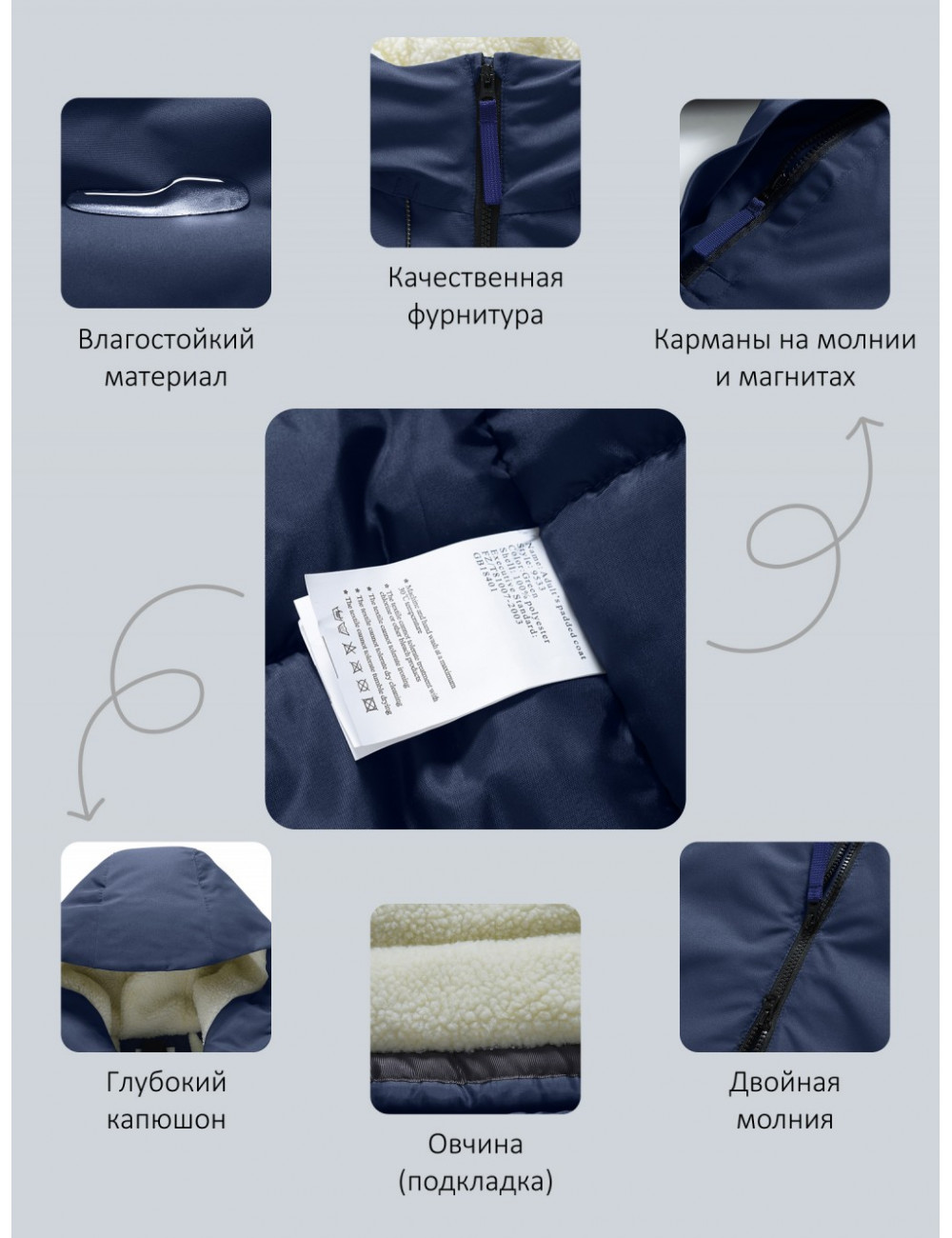 - Регулируемые фиксаторы на рукавах и капюшоне помогают удерживать тепло.
