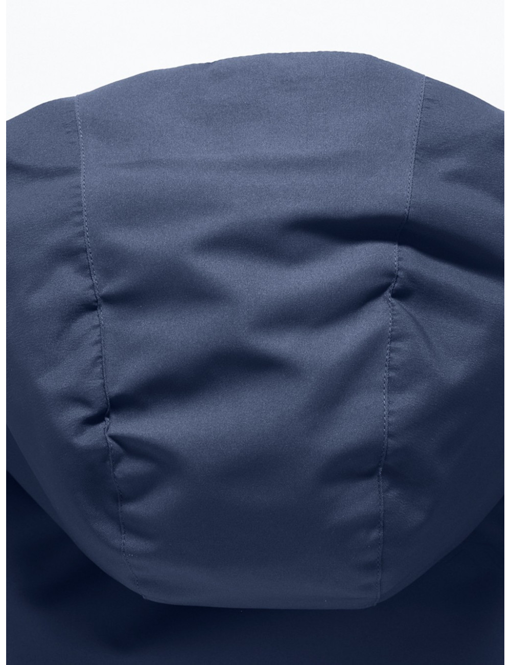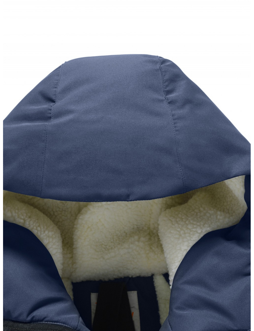 - Несъёмный капюшон надёжно защищает от снега и ветра, а воротник-стойка прикрывает шею.