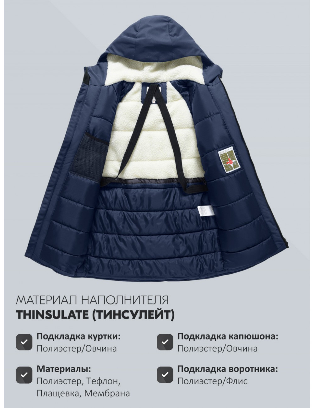 - Утеплитель тинсулейт плотностью 300 г/м² удерживает тепло даже в сильные морозы, оставаясь лёгким и удобным в носке.