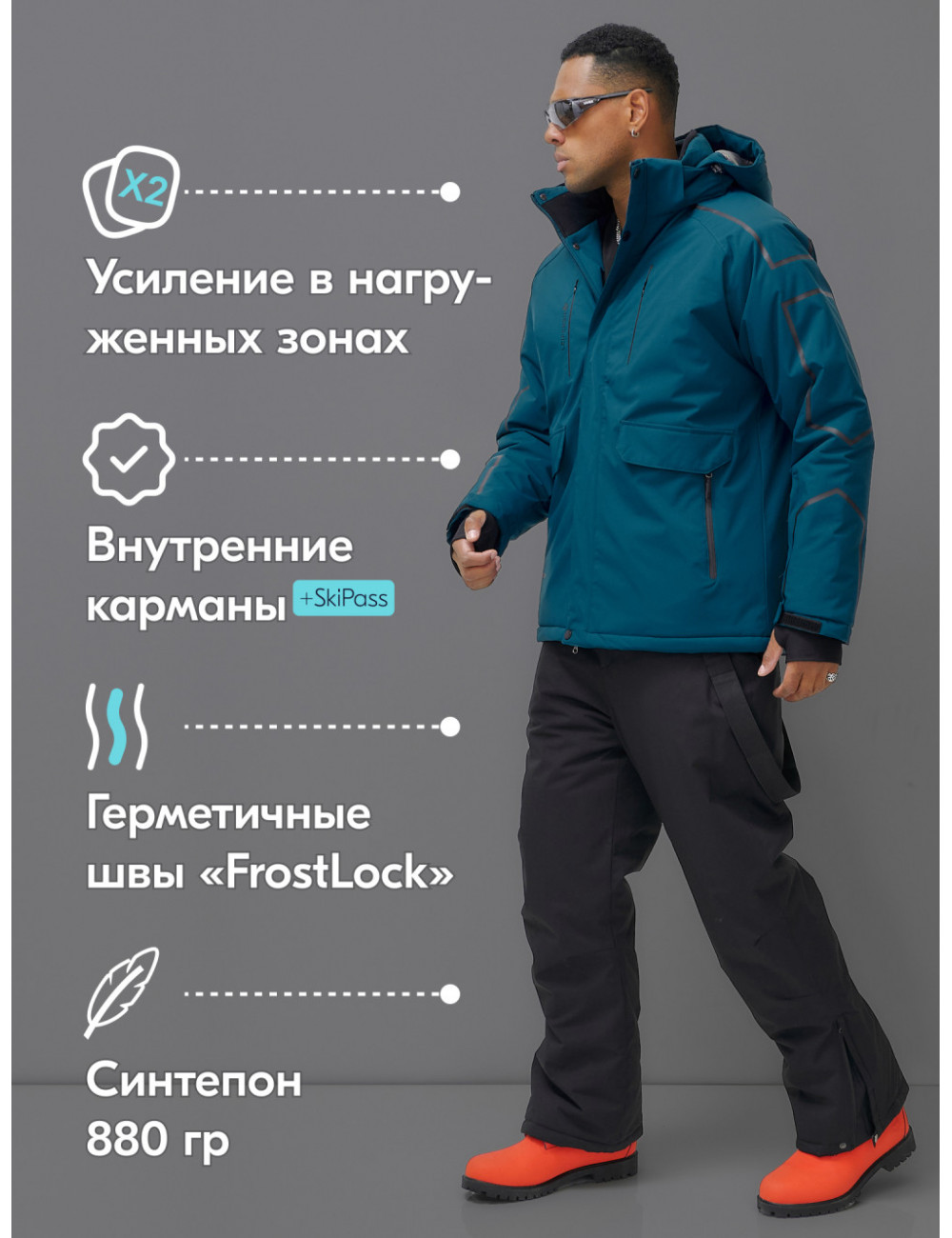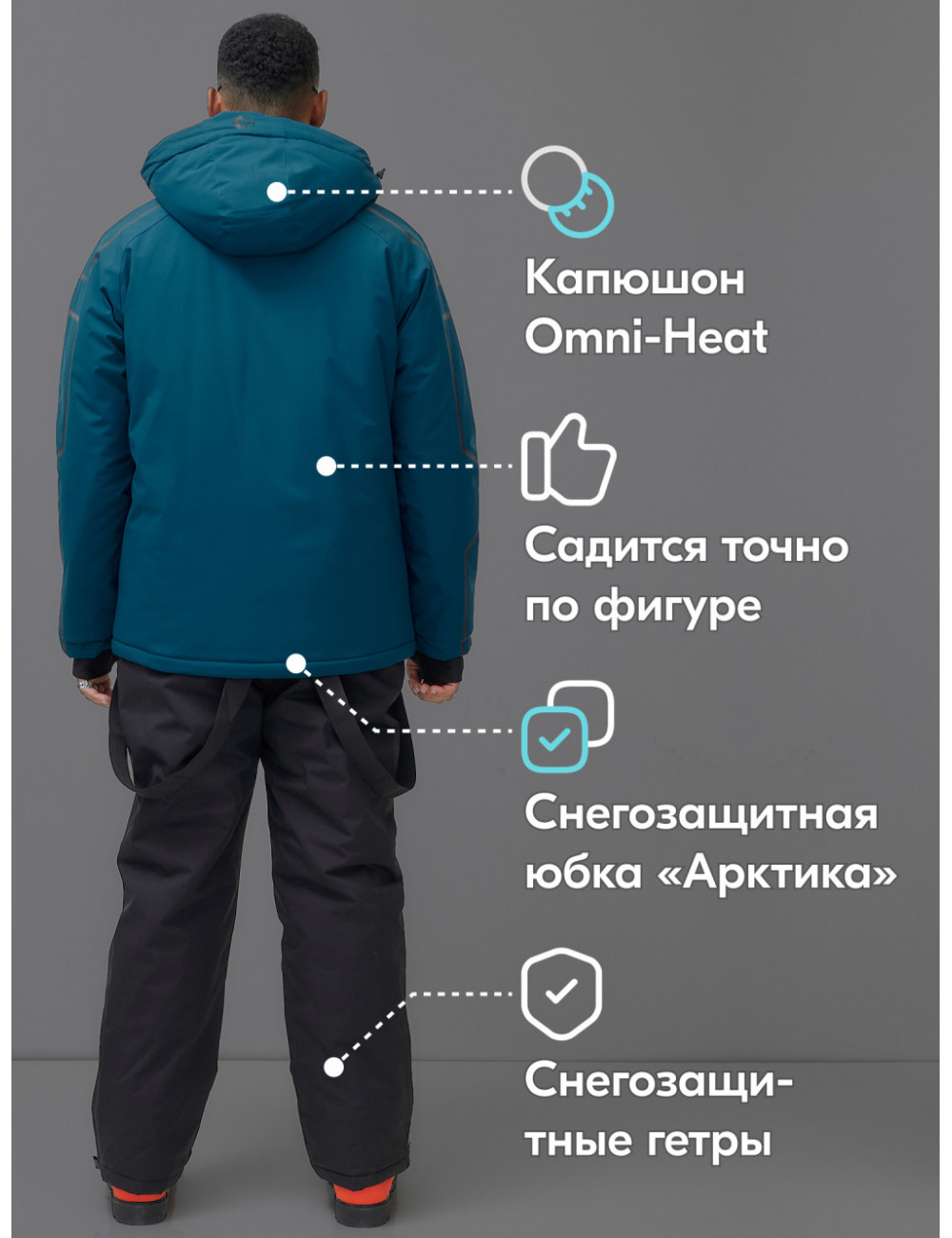 Этот костюм идеально подходит для любителей активного зимнего отдыха, в том числе для катания на горных лыжах и сноуборде.