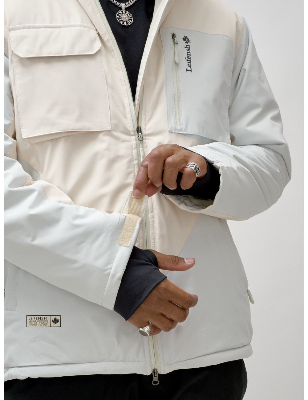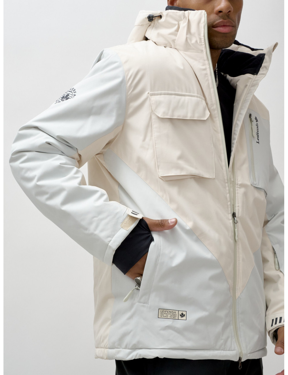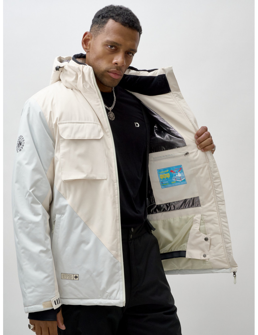 Куртка оснащена съёмным капюшоном, двойными молниями, высоким воротником, прямыми рукавами с эластичными полуперчатками, боковыми карманами на молнии, внутренними карманами для горнолыжных очков, снегозащитной юбкой и накладными нагрудными карманами.