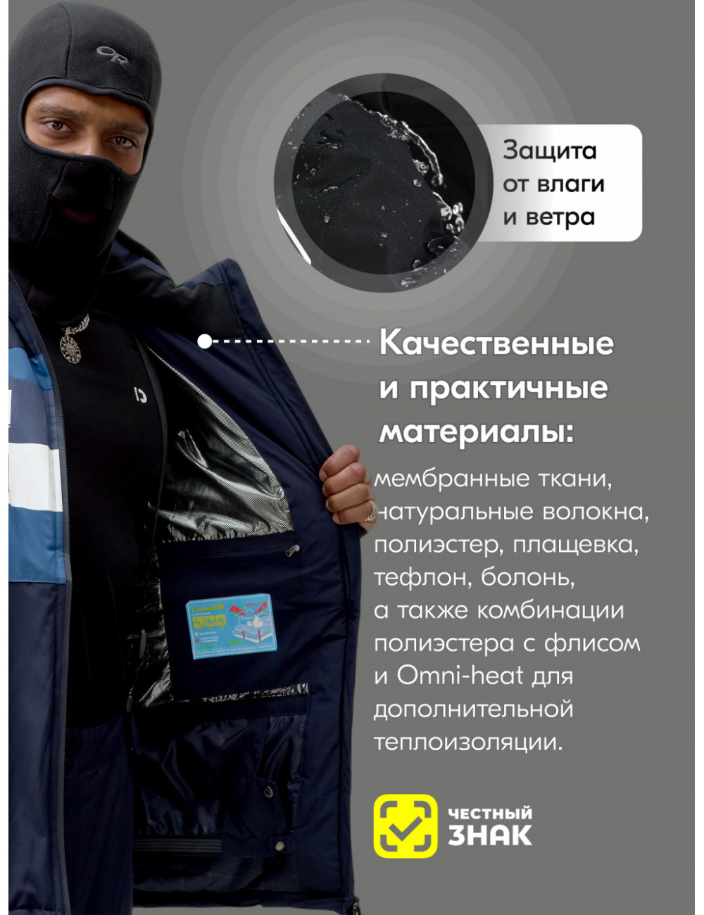 В костюме используются технологии Omni-Heat, Тинсулейт и водоотталкивающая мембрана.