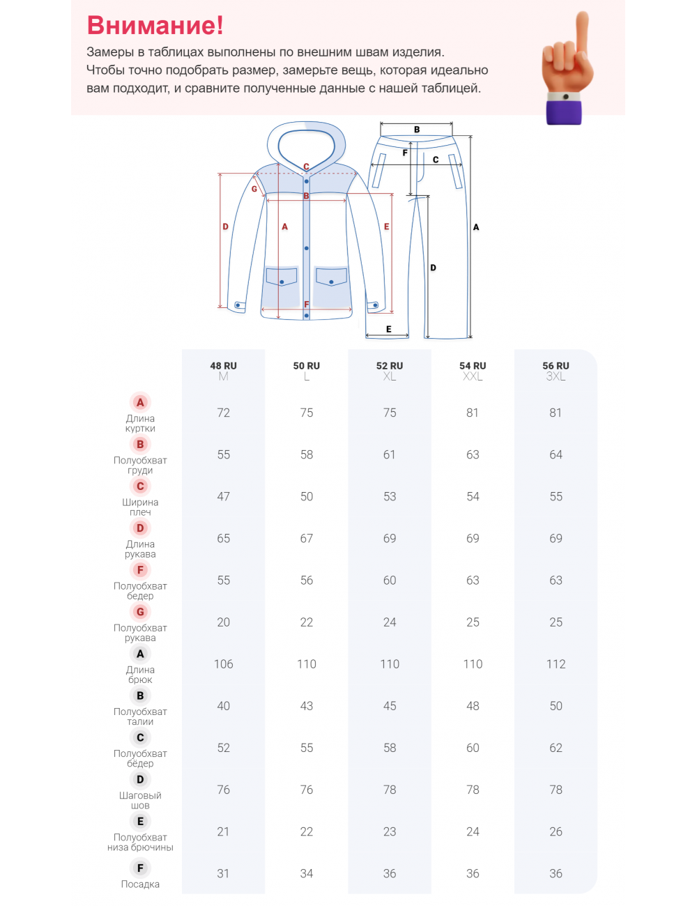 | Фиксаторы | На капюшоне, по низу куртки, на рукавах, по низу брюк |