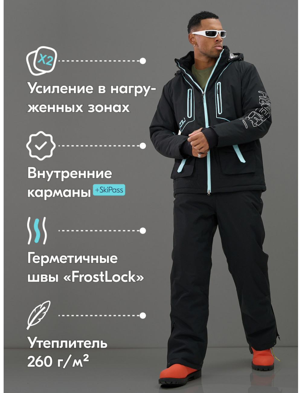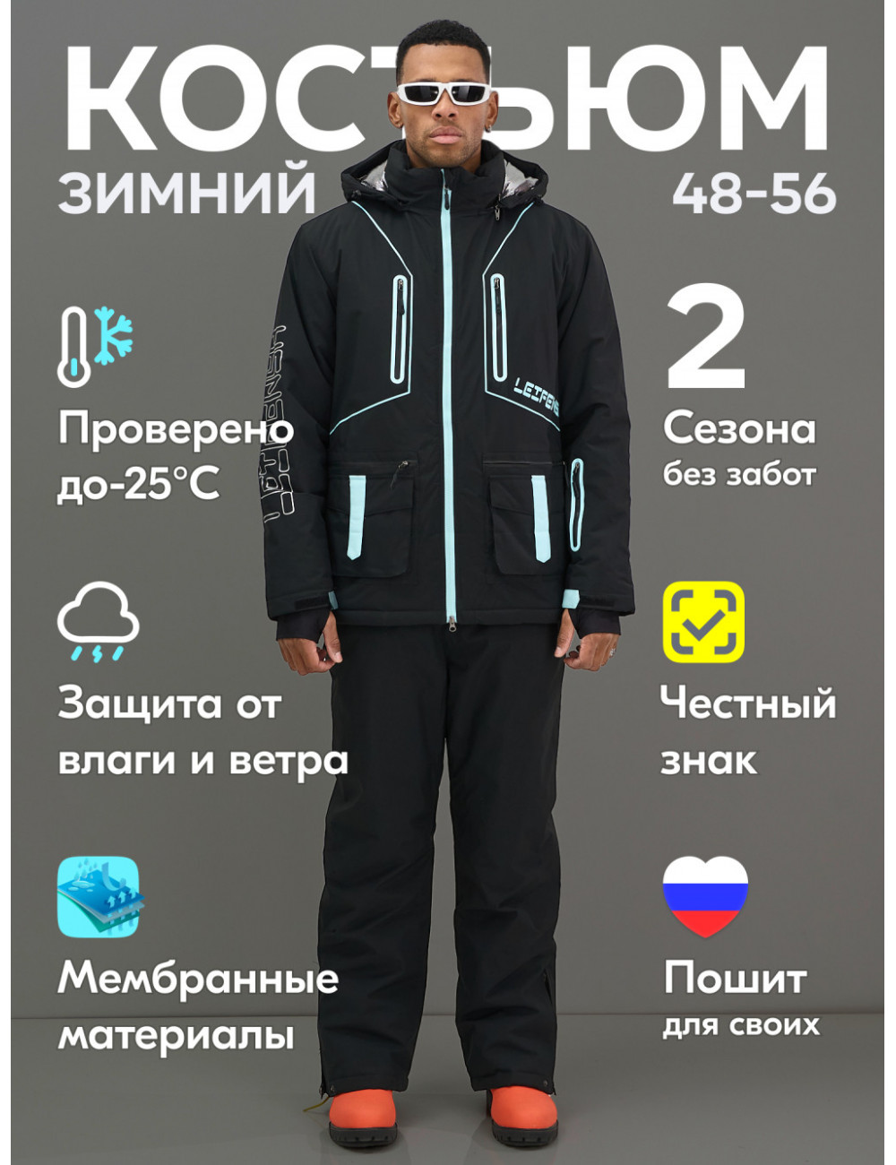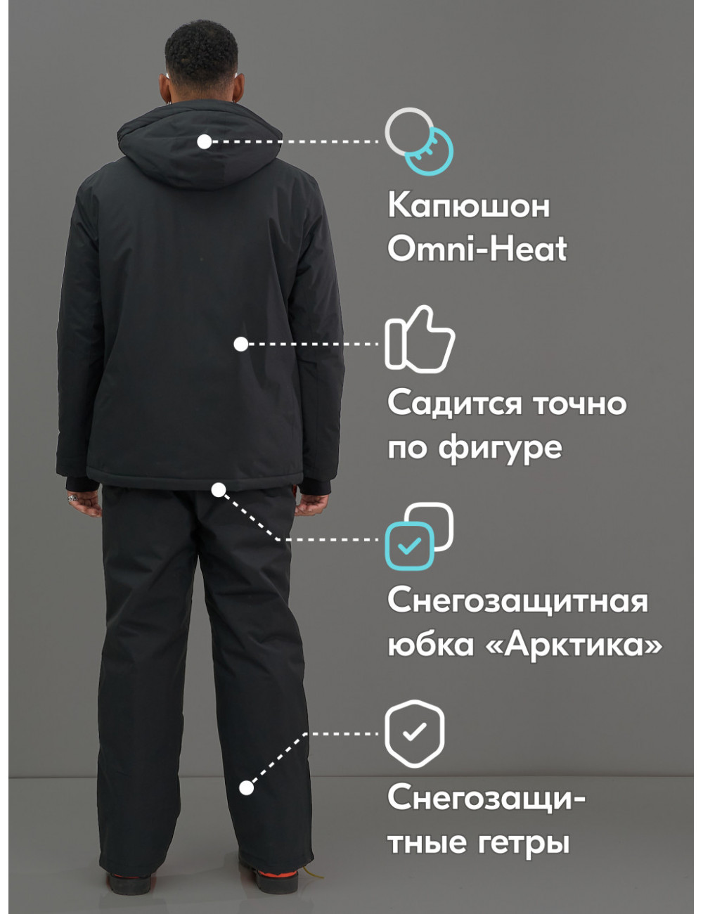 - Комфорт и безопасность: костюм обеспечивает комфорт и защиту от холода, ветра и снега.