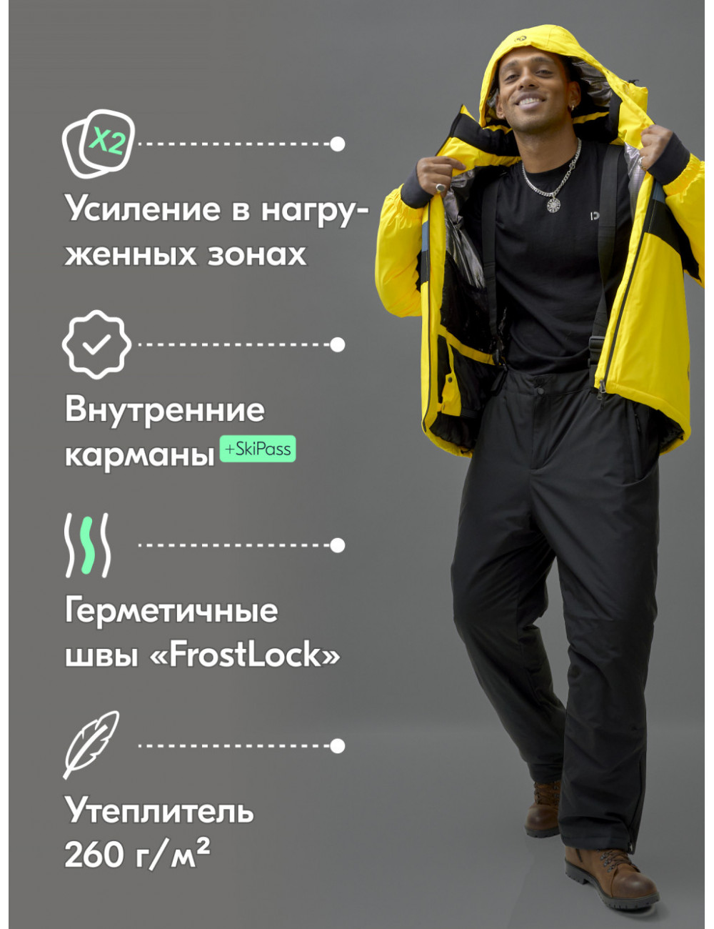 - Водоотталкивающая мембрана надёжно защищает от промокания и ветра, сохраняя комфортное состояние внутри костюма.