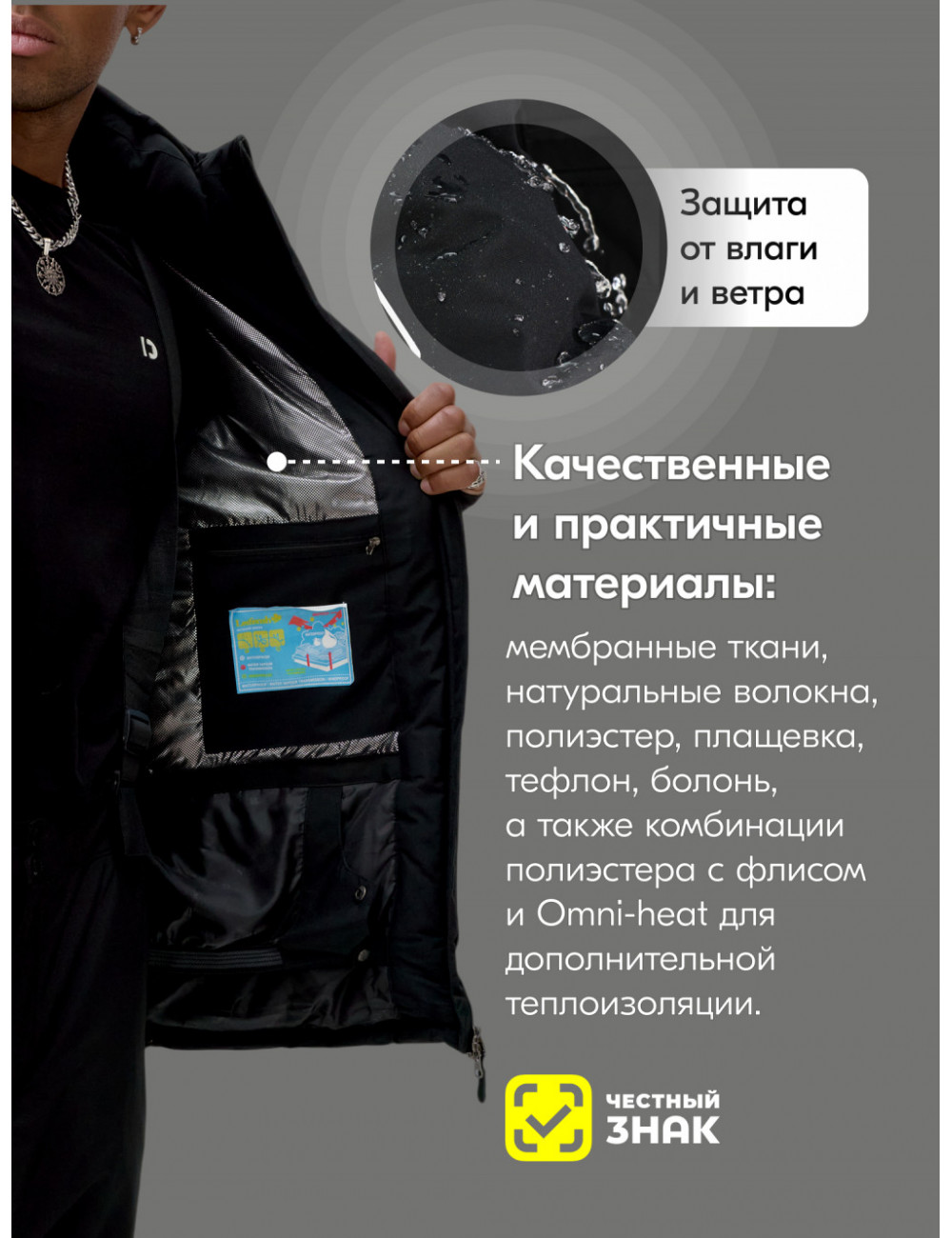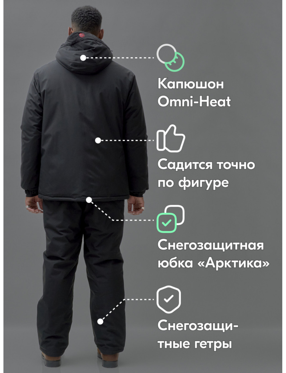 - Водоотталкивающая мембрана надёжно защищает от промокания и ветра, сохраняя комфортное состояние внутри костюма.