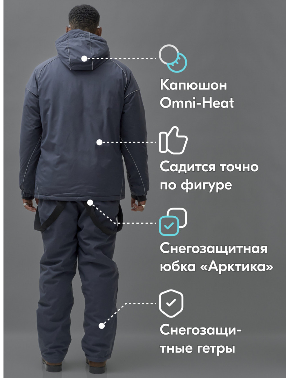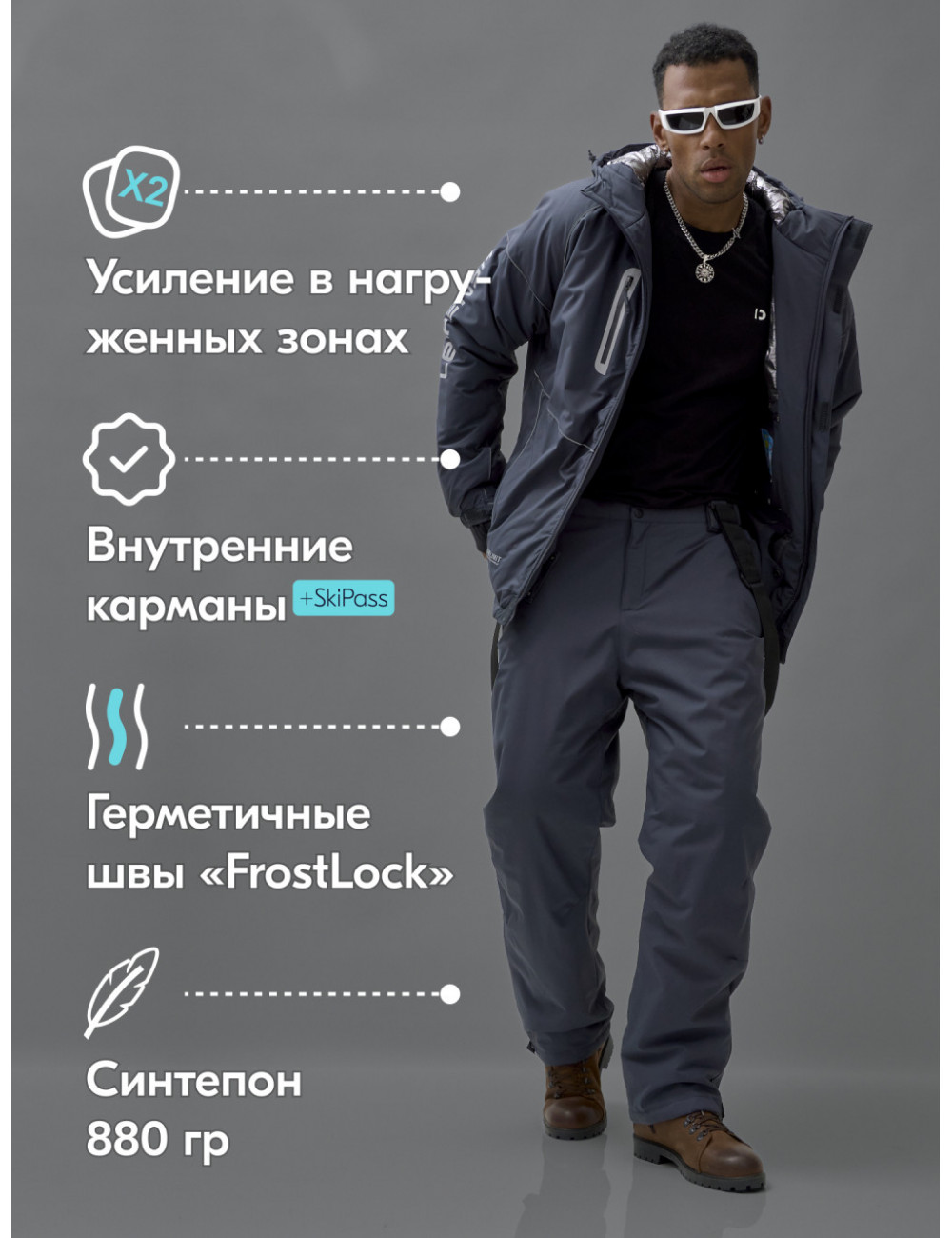 Ответ: костюм обеспечивает защиту от ветра и влаги, комфорт и тепло в холодную погоду, стильный и лаконичный дизайн, удобство использования, надёжность и долговечность. Доставка по Москве и Московской области Мужской зимний горнолыжный костюм, тёмно-серый