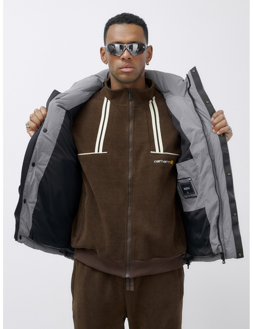 - Высокий воротник-стойка. Защищает шею от пронизывающего ветра и добавляет стильный акцент образу.