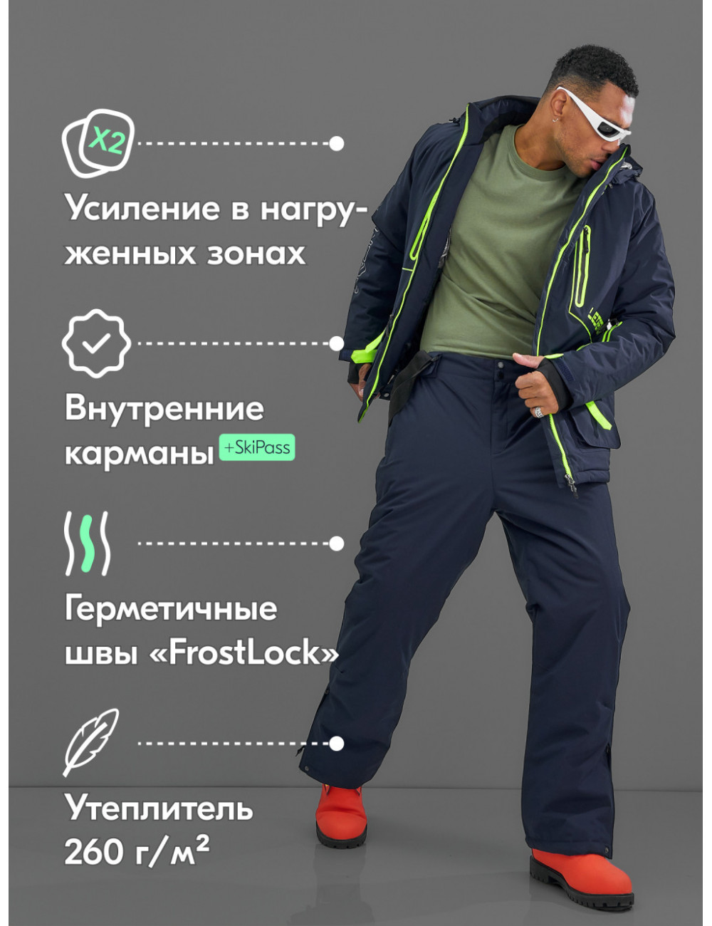 Этот горнолыжный костюм можно сочетать с термобельём и тёплыми носками для максимального комфорта в холодную погоду. Также подойдёт для использования с горнолыжными ботинками и аксессуарами для зимних видов спорта. Доставка по Москве и Московской области Мужской зимний горнолыжный костюм тёмно-синего цвета
