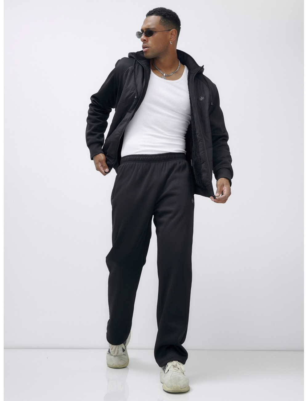 Костюм можно сочетать с термобельём и тёплыми аксессуарами для создания многослойного образа. Также он будет отлично смотреться с тёплыми ботинками и шапкой. Доставка по Москве и Московской области Мужской зимний спортивный костюм с начёсом, чёрный.