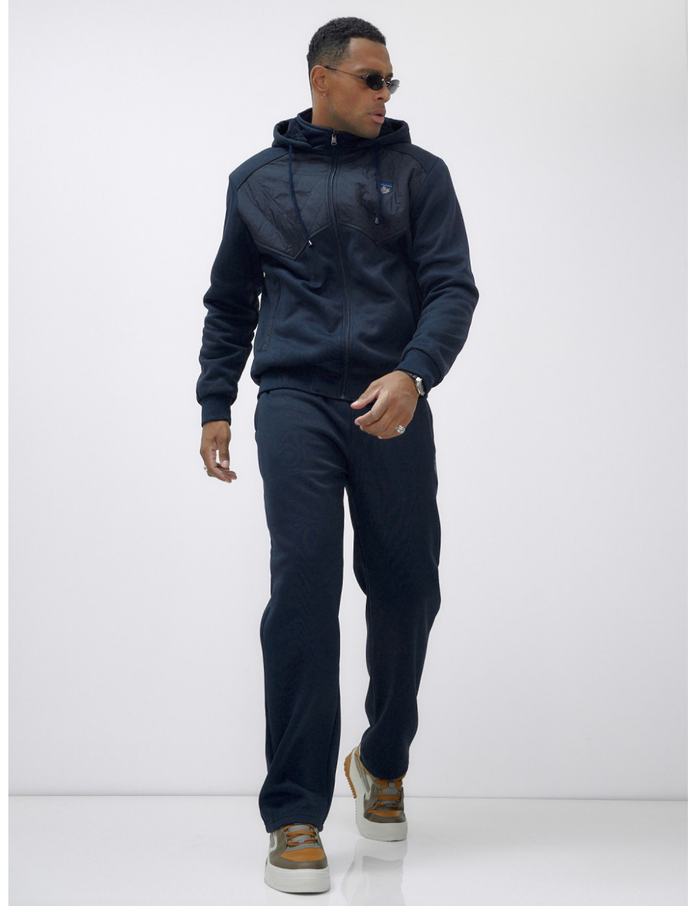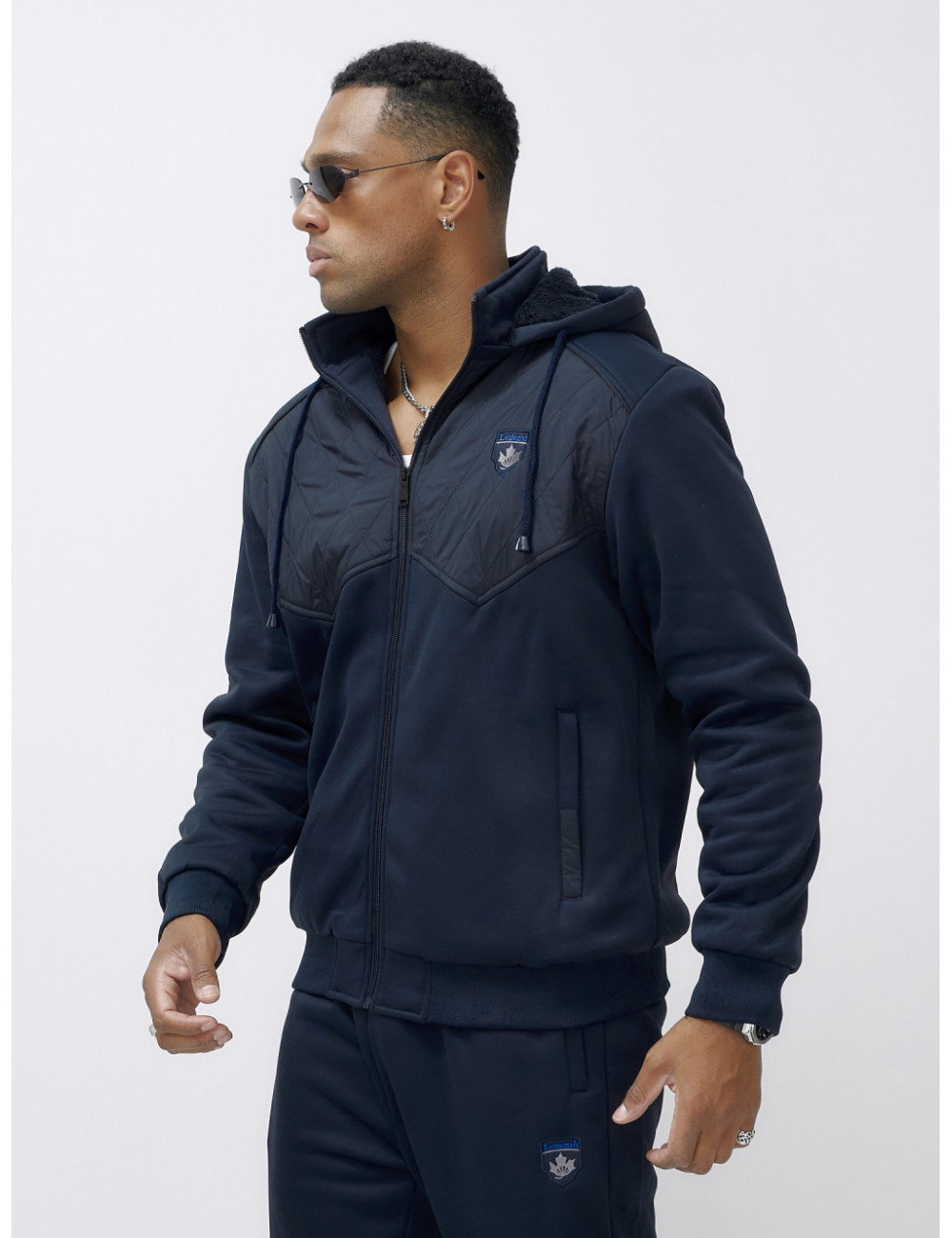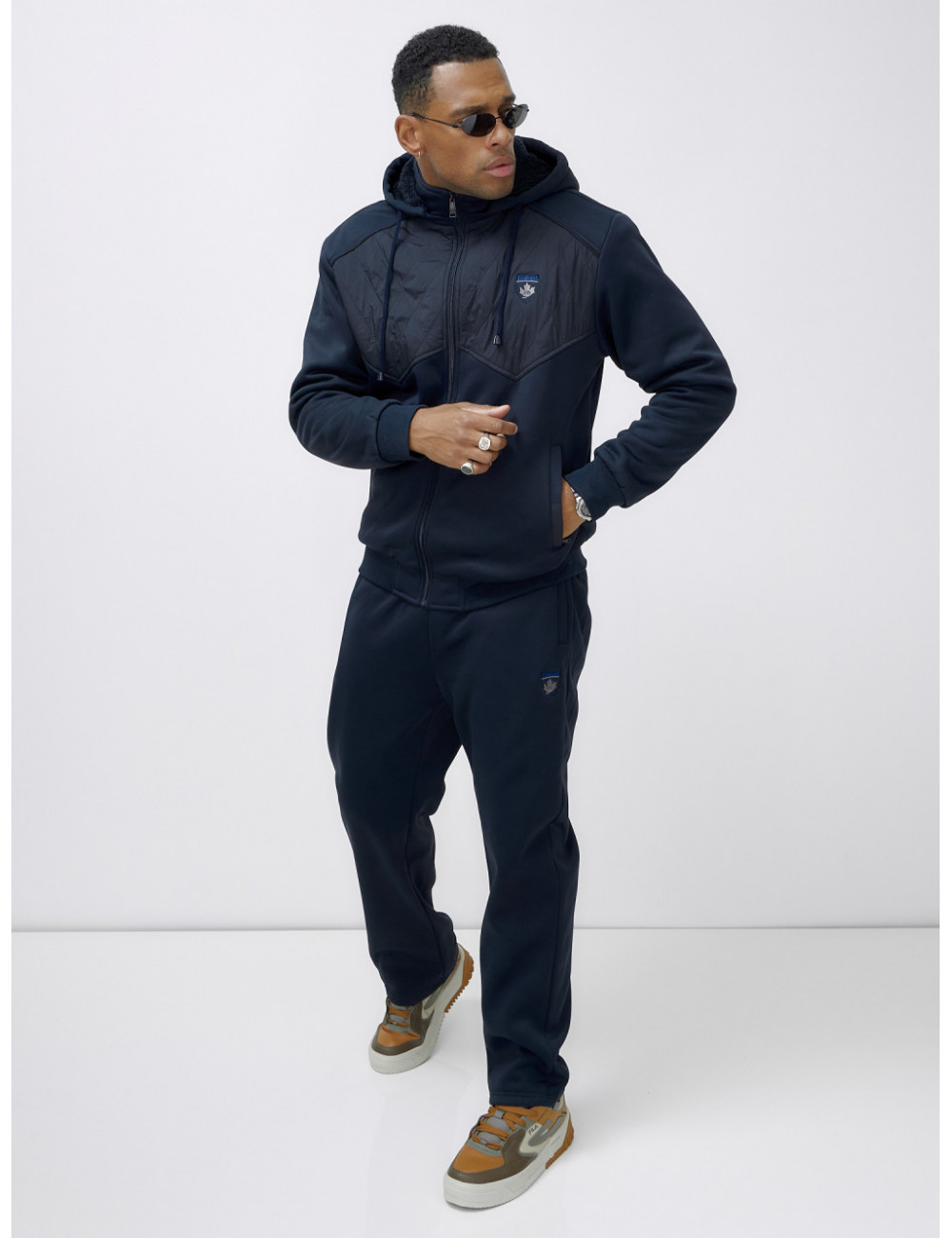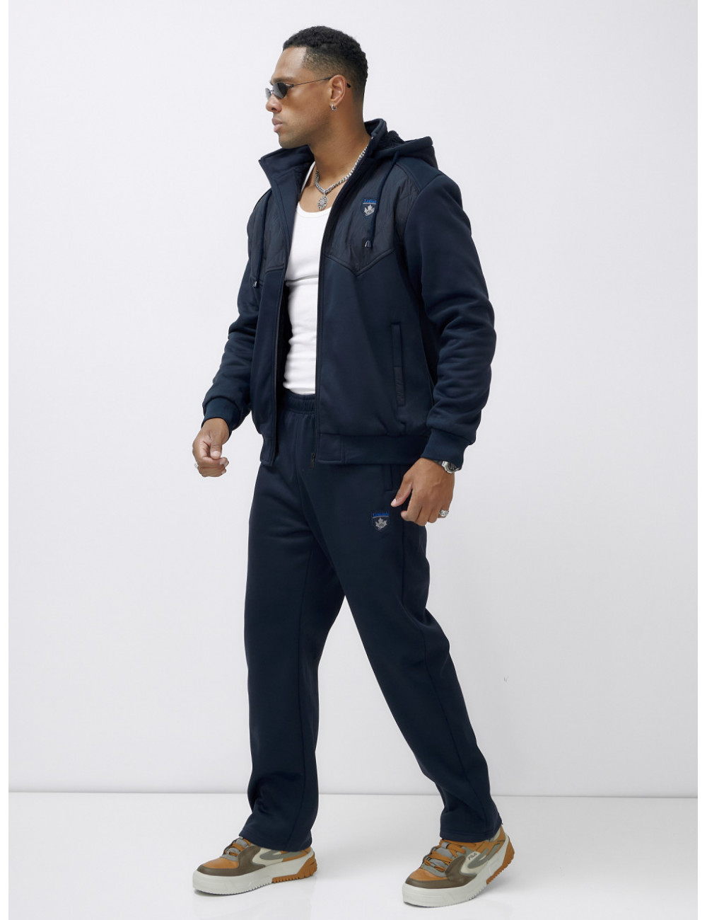 Этот костюм можно сочетать с различными аксессуарами и обувью, чтобы создать уникальный образ. Например, с тёплыми перчатками, шарфом и шапкой из аналогичного материала. Отлично подойдёт для создания стильного и комфортного образа в холодное время года. Доставка по Москве и Московской области Мужской зимний спортивный костюм с начёсом, тёмно-синий.