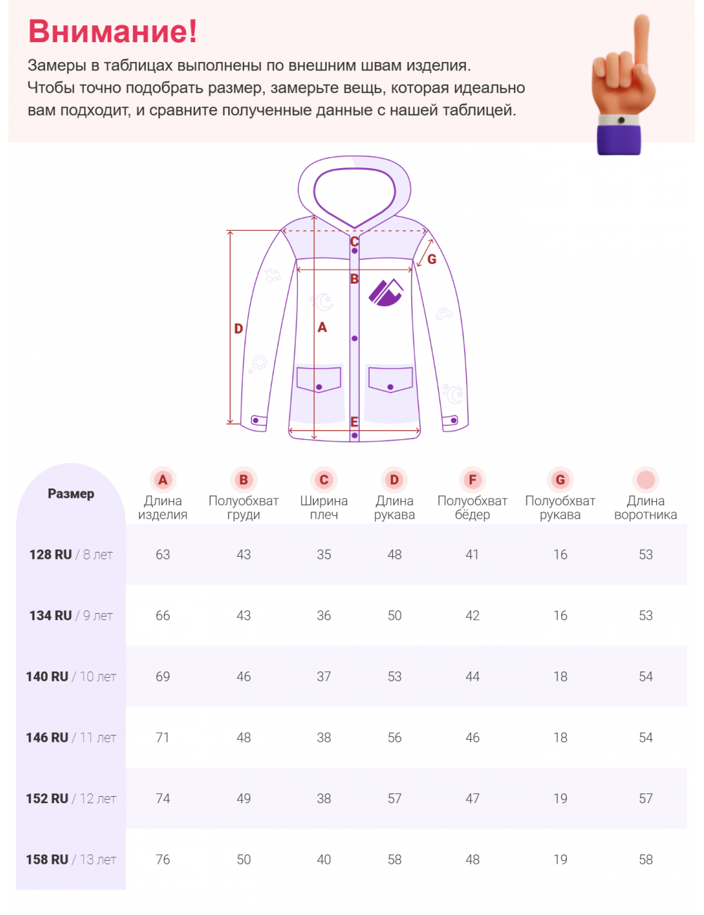 При выборе размера рекомендуем измерить следующие параметры: длину куртки, полуобхват груди, длину плеч по спине, длину рукава, внутренний шов рукава, полуобхват бёдер. Используйте сантиметровую ленту для точности измерений.