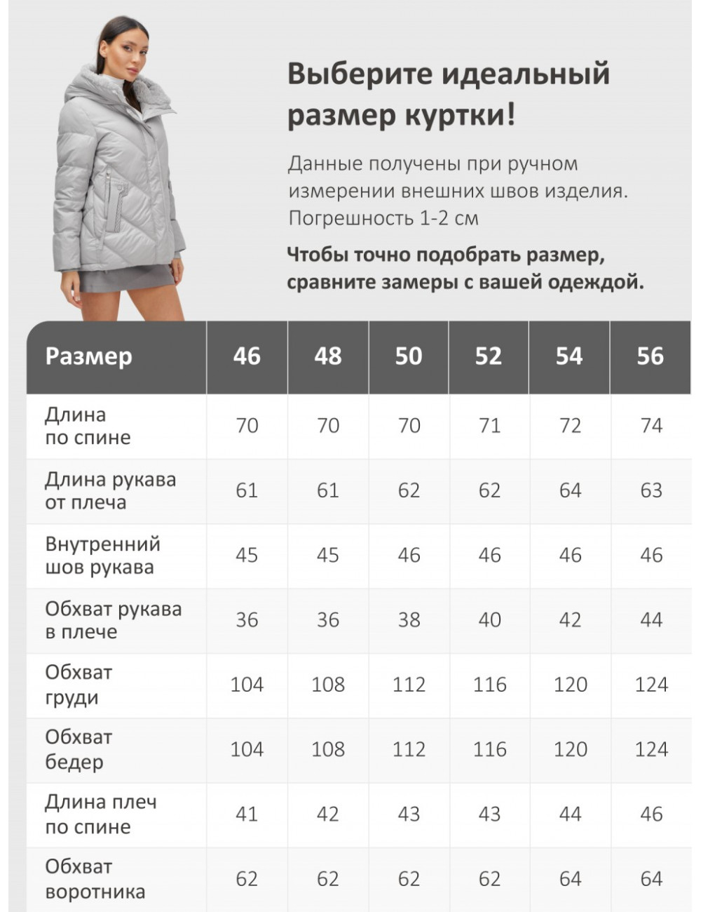 Ответ: куртка доступна в размерах от 46 до 56 и идеально подходит для женщин ростом от 155 до 185 см.