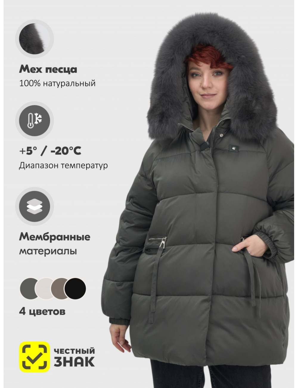 - Натуральный мех песца на капюшоне. Съёмная опушка позволяет адаптировать образ под разные ситуации — от деловых встреч до прогулок в стиле casual.