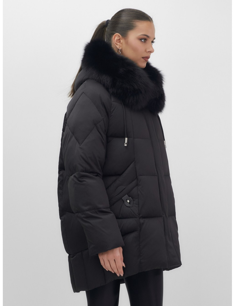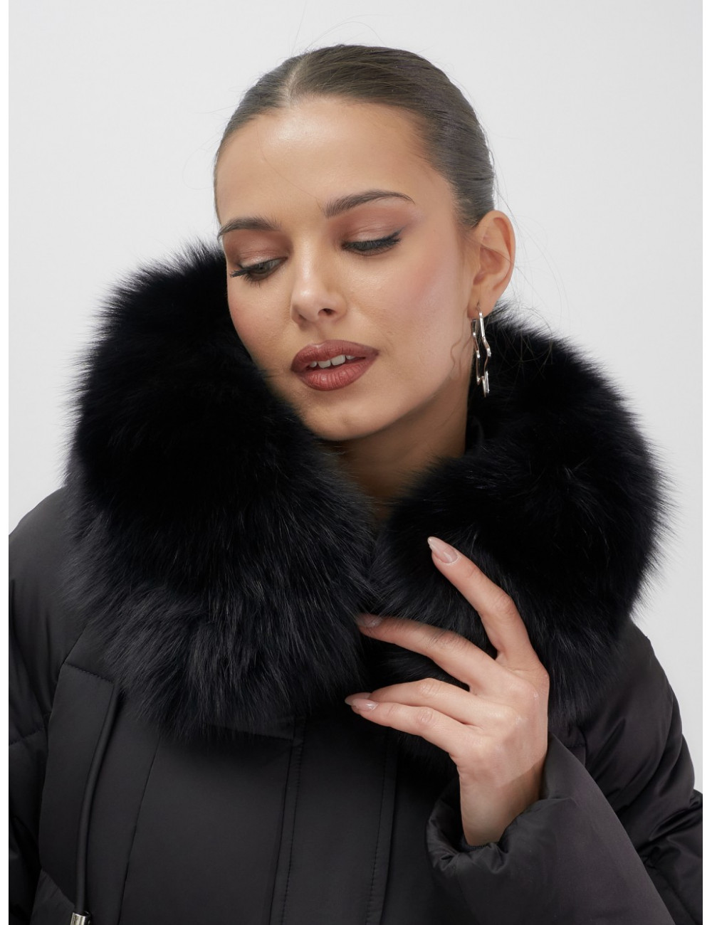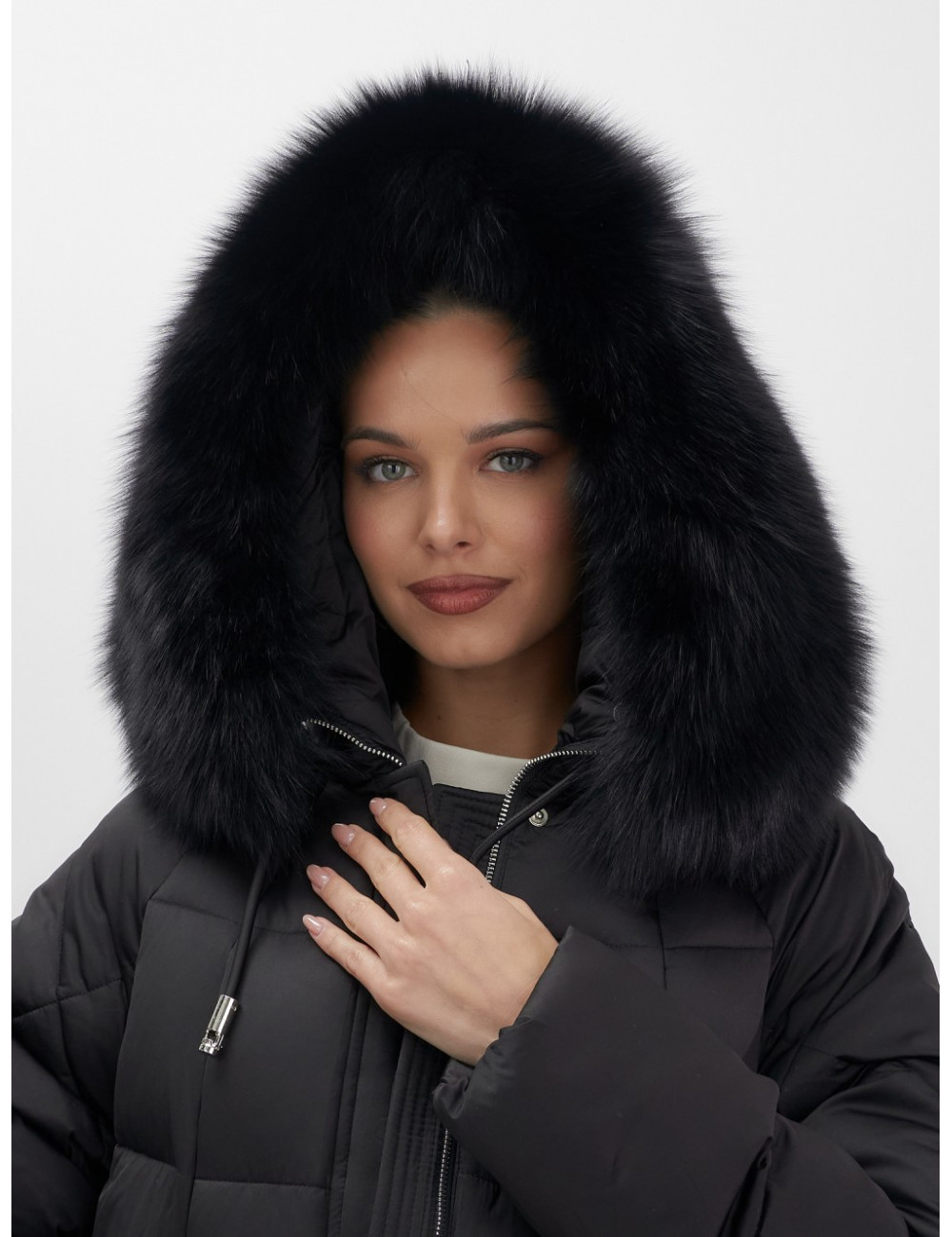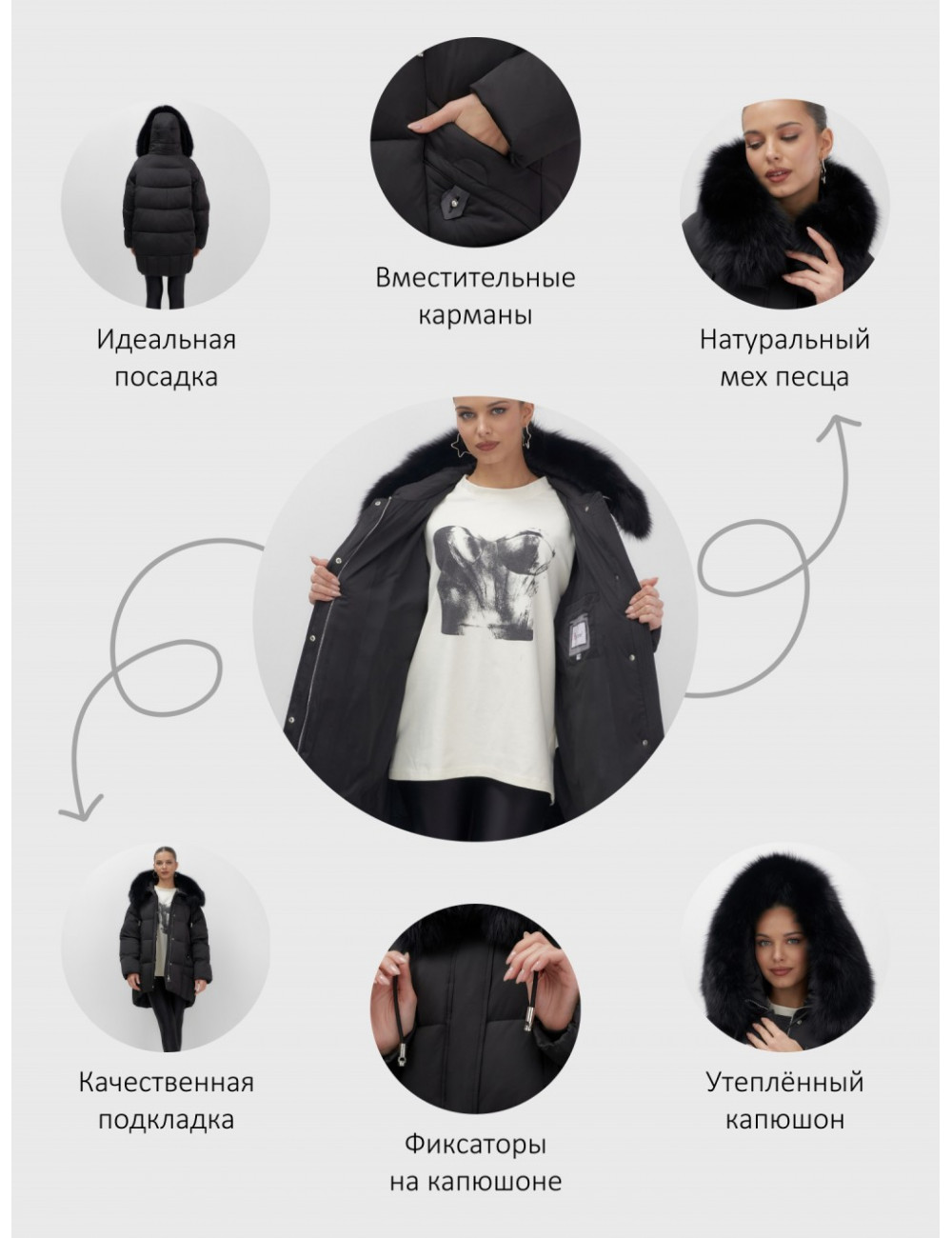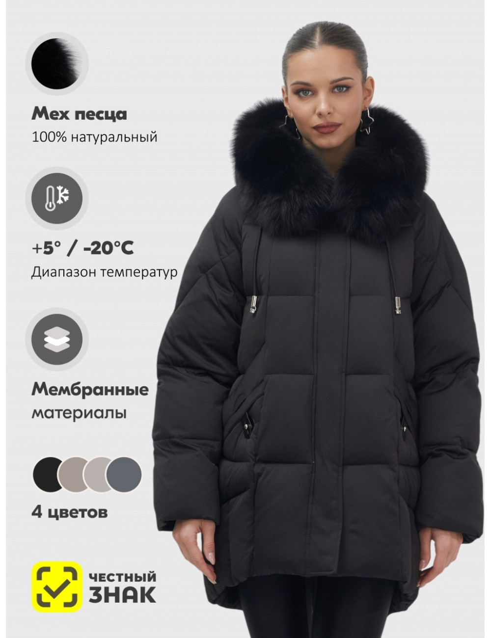 - Универсальность: съёмная опушка из натурального песца позволяет создавать различные образы — от статусного делового до элегантного повседневного.