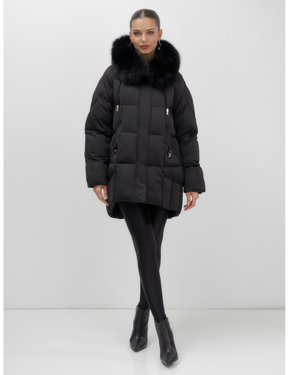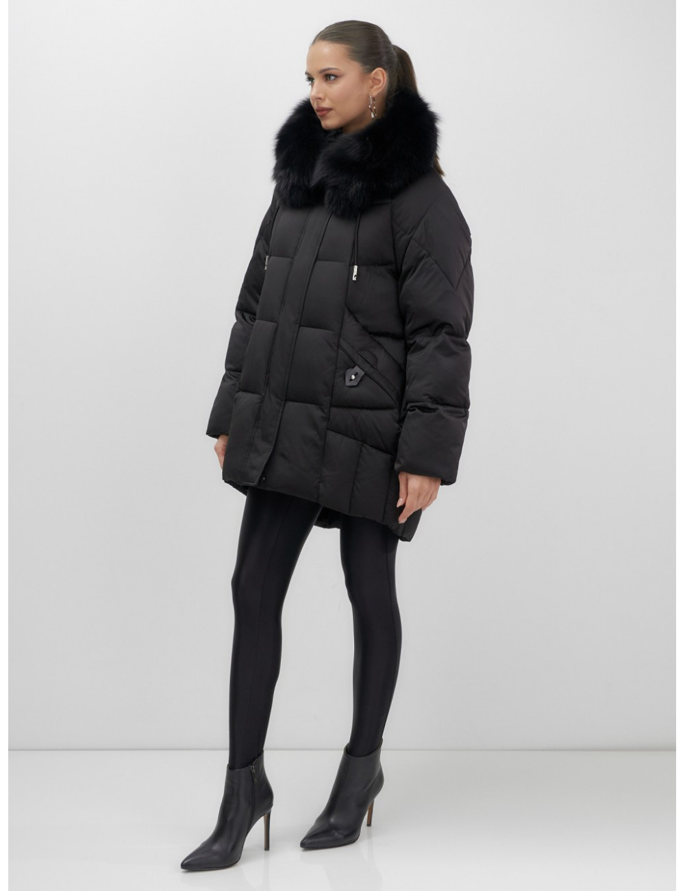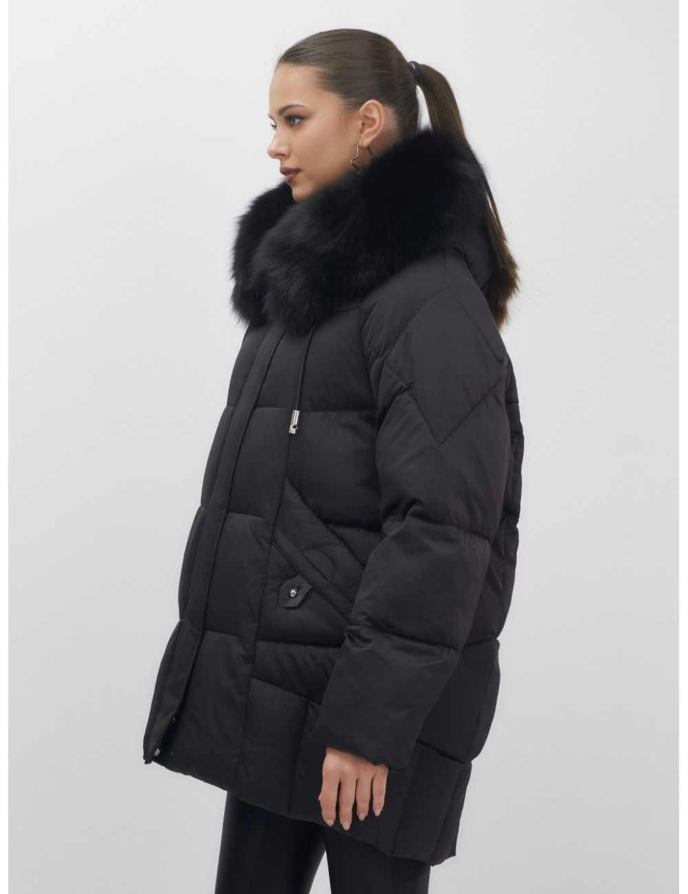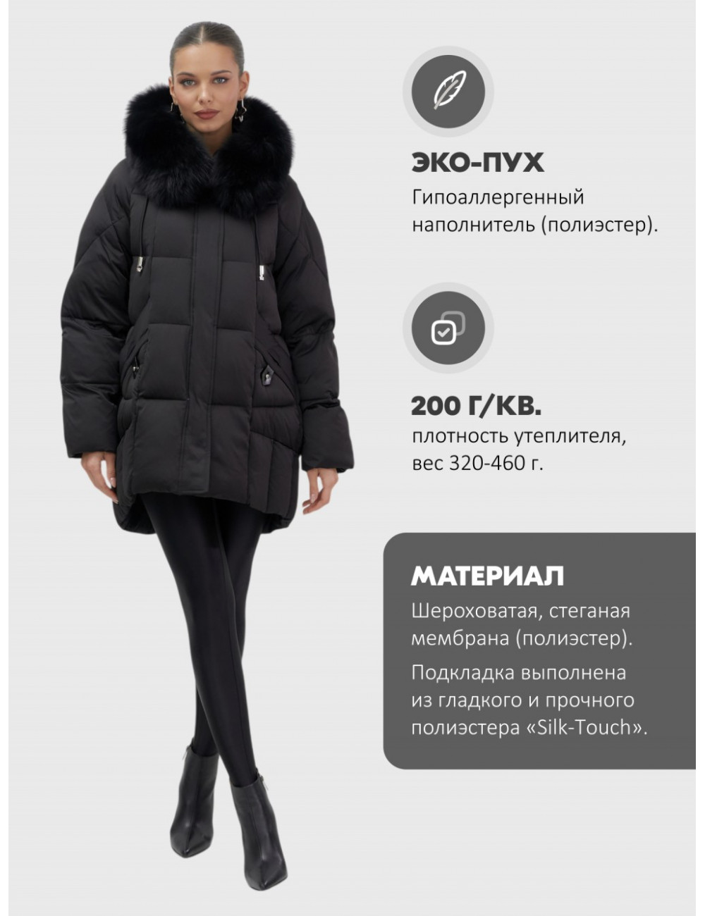 - Универсальность: съёмная опушка из натурального песца позволяет создавать различные образы — от статусного делового до элегантного повседневного.