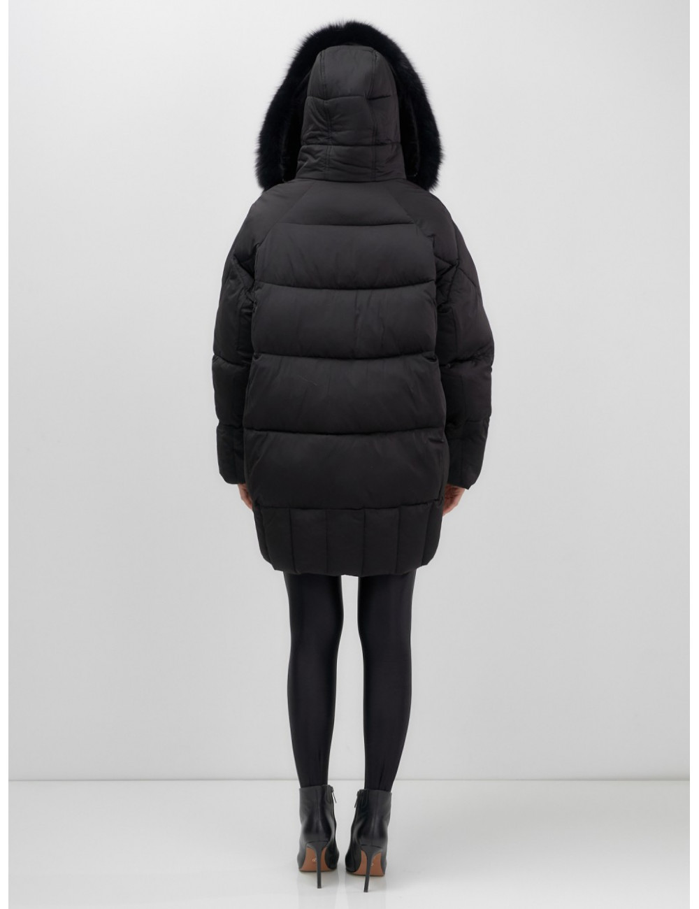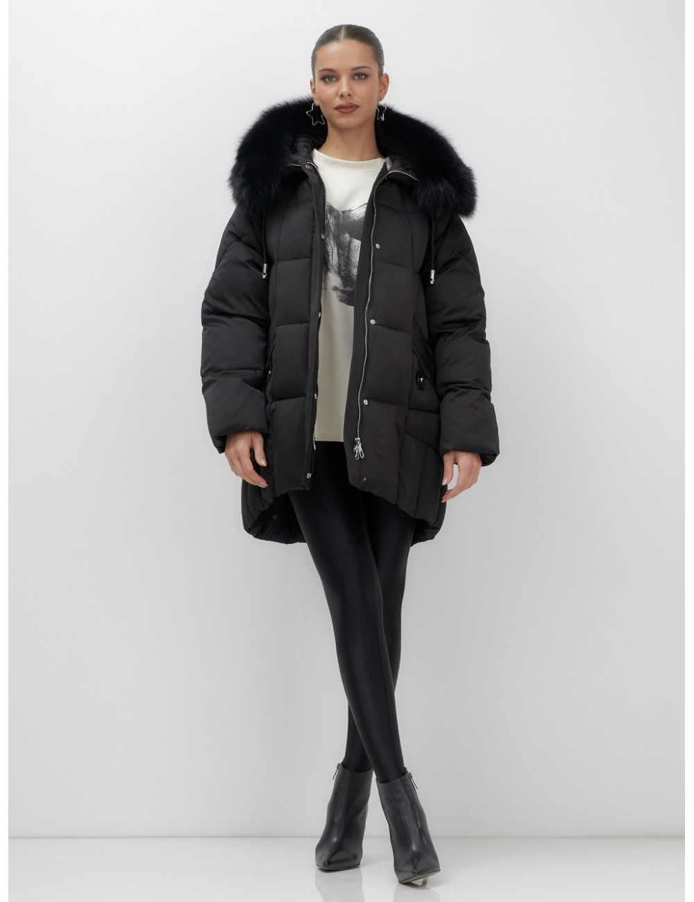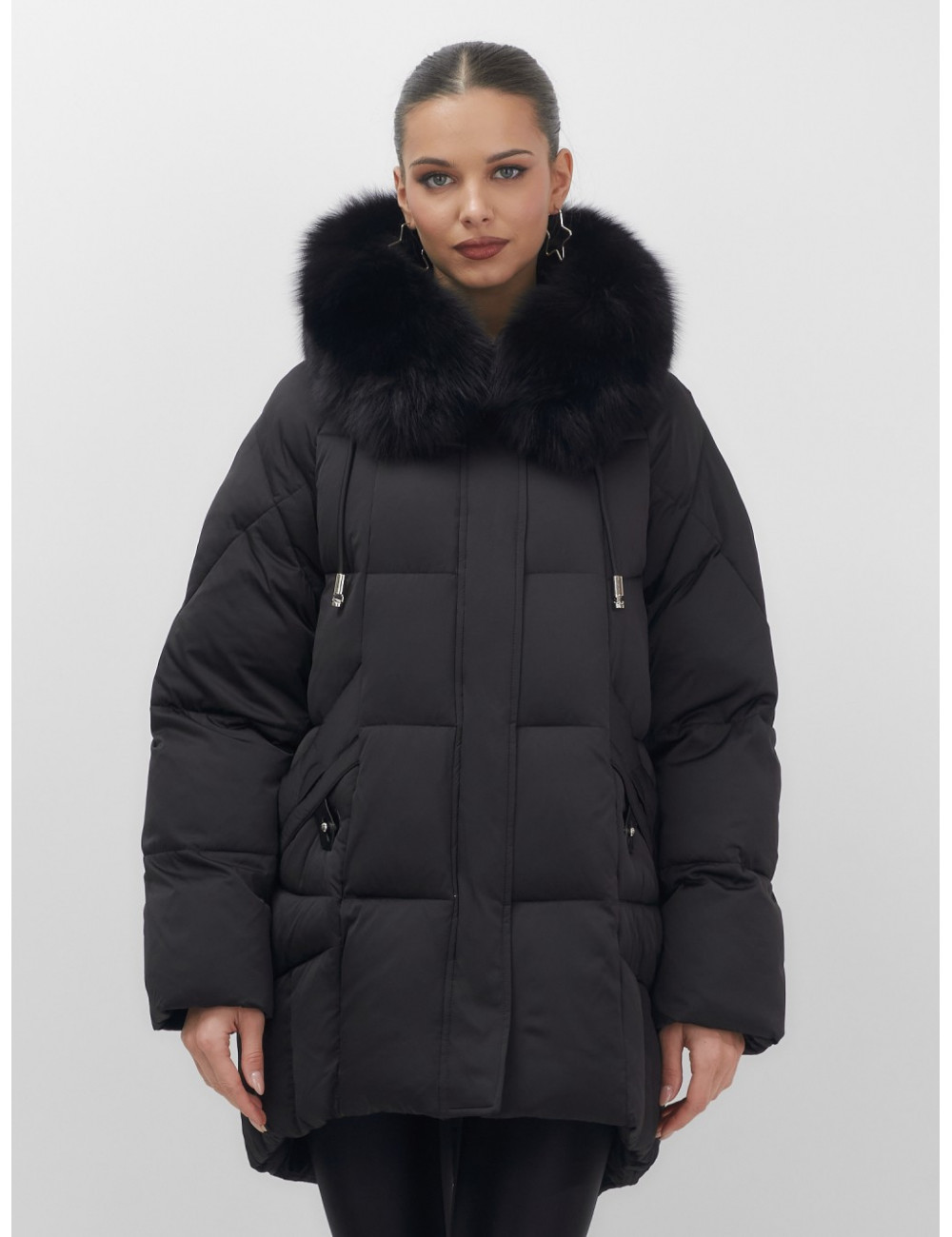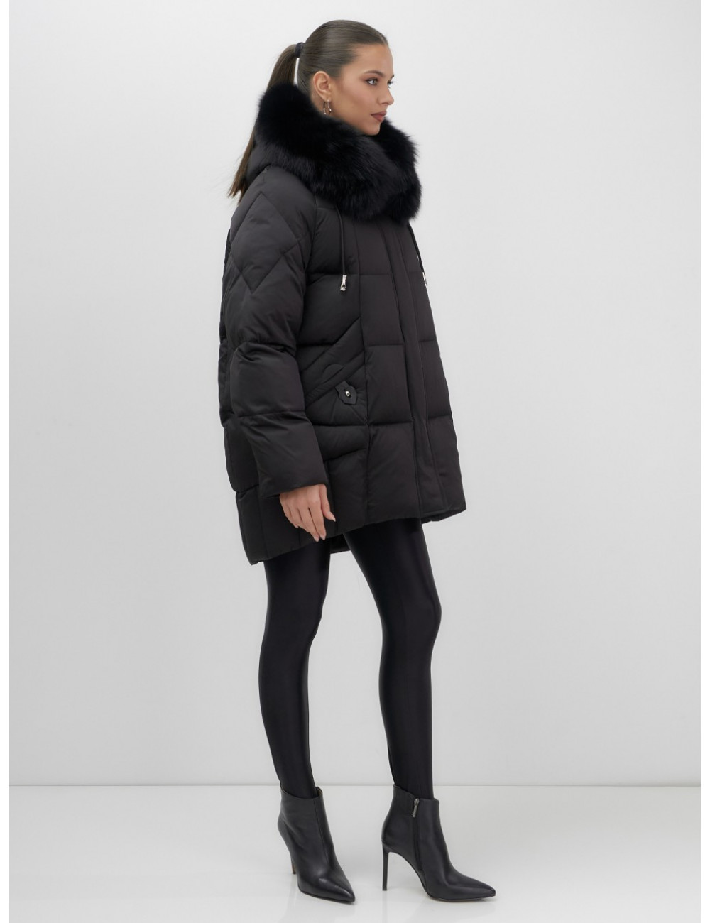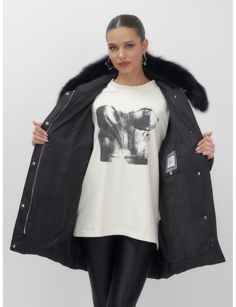 - Универсальность: съёмная опушка из натурального песца позволяет создавать различные образы — от статусного делового до элегантного повседневного.