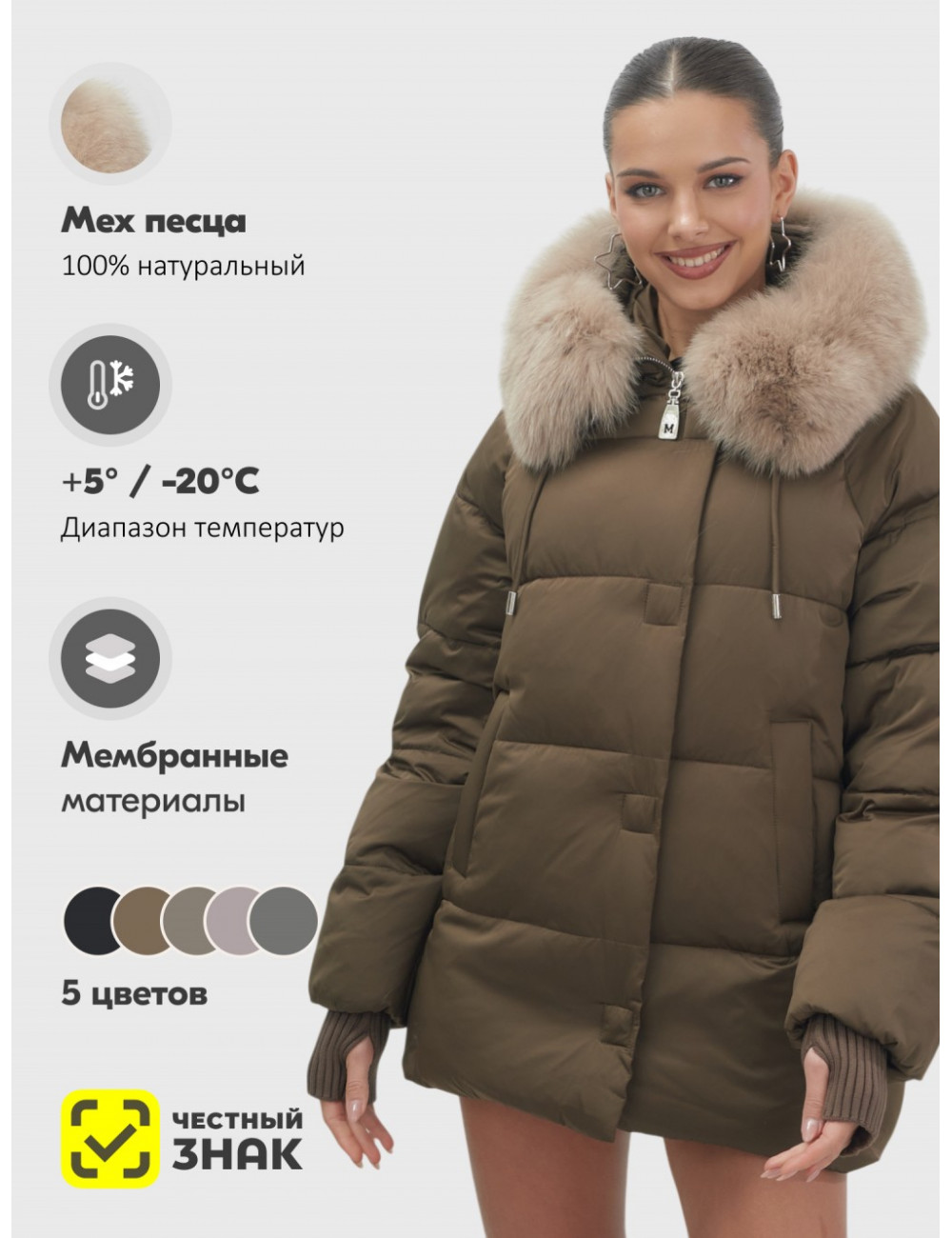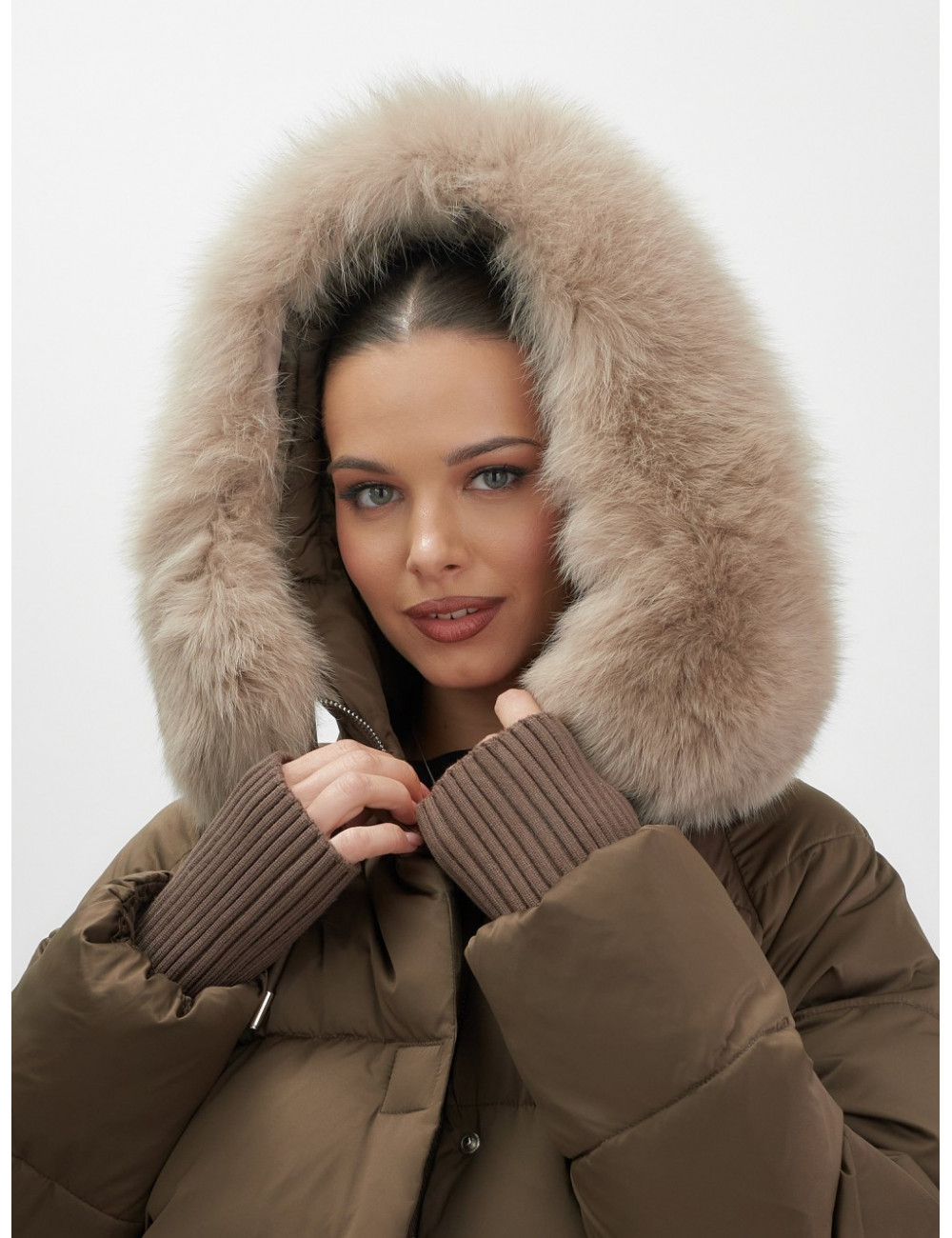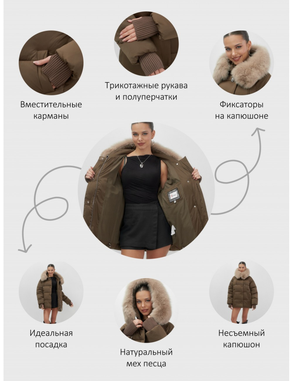 - Съёмная опушка из натурального песца позволяет менять образ по настроению.