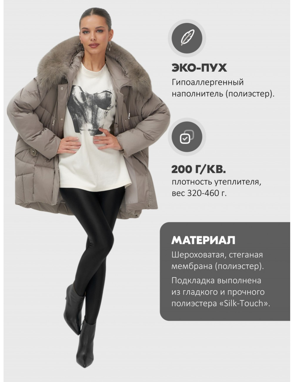 | Особенности модели | быстросохнущая, ветрозащита, водоотталкивающий материал, гипоаллергенный материал, дышащий материал, съемная опушка |