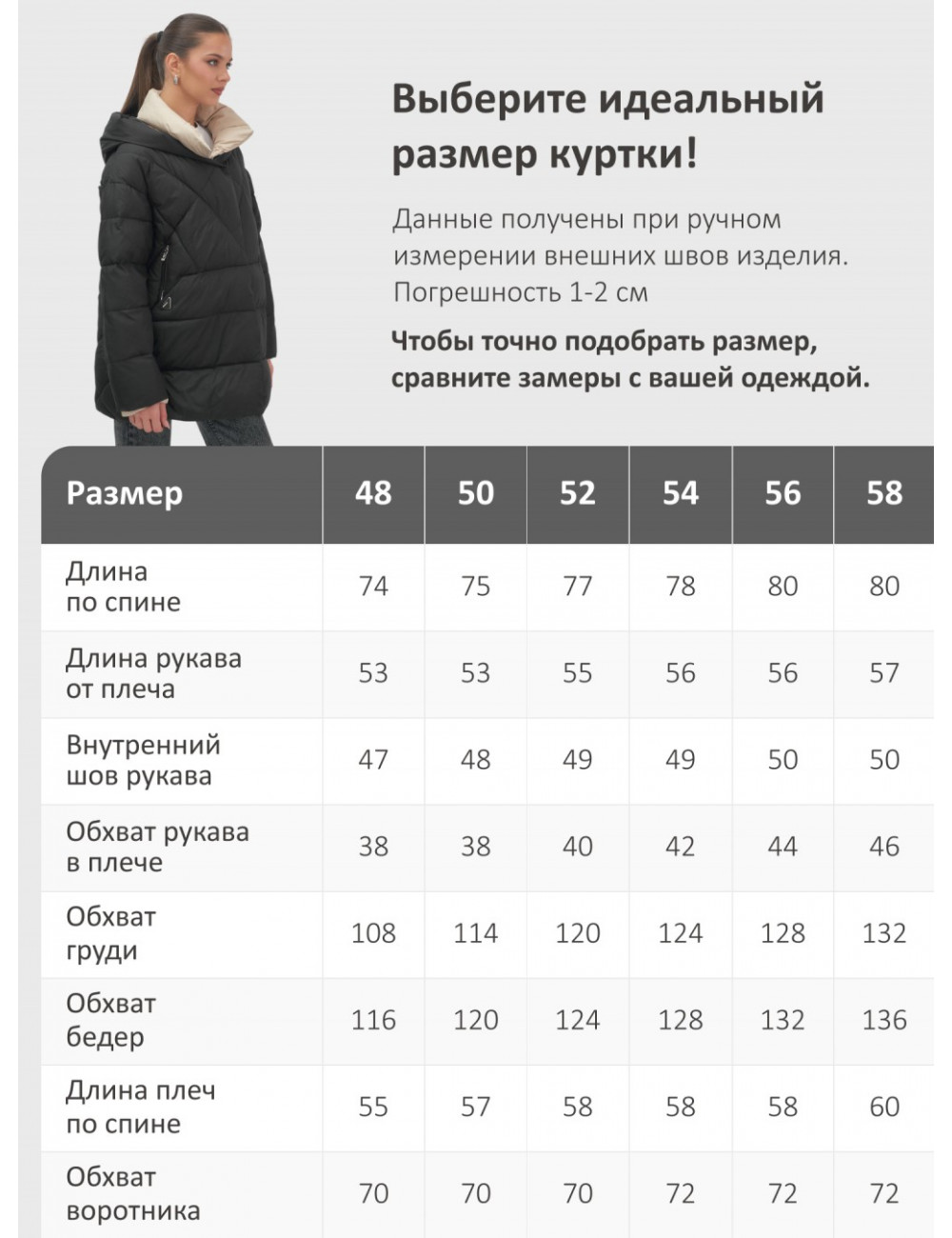 Пуховик представлен в размерах от 48 до 58. Вы можете выбрать чёрный, серый, бежевый или бирюзовый цвет, а также однотонный, клетчатый или с логотипом рисунок.