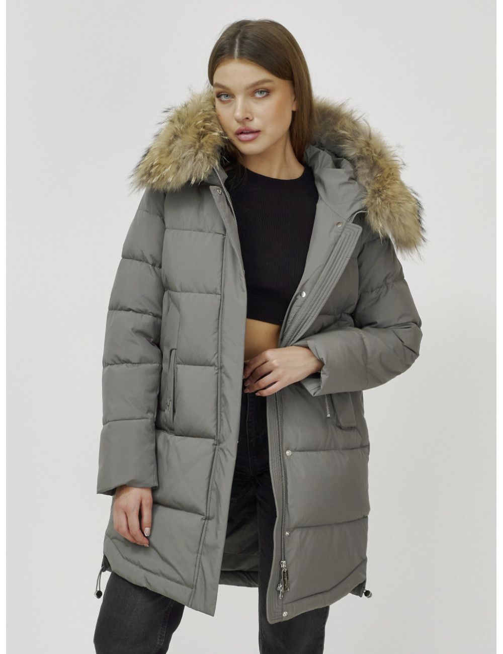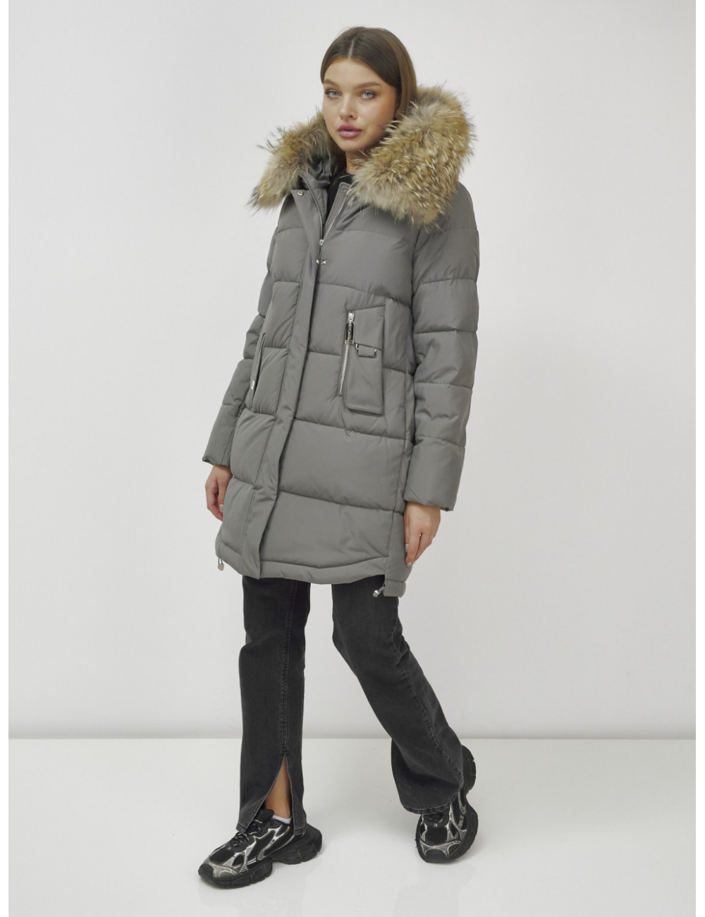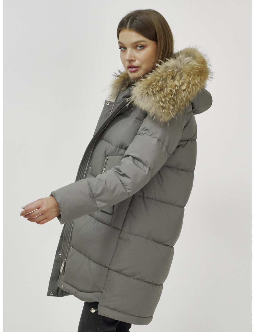Пуховик можно сочетать с джинсами, брюками, платьями и юбками. Добавьте к нему шапку и перчатки из аналогичного материала для создания гармоничного образа. Доставка по Москве и Московской области Пуховик женский зимний с мехом енота премиум-класса хаки