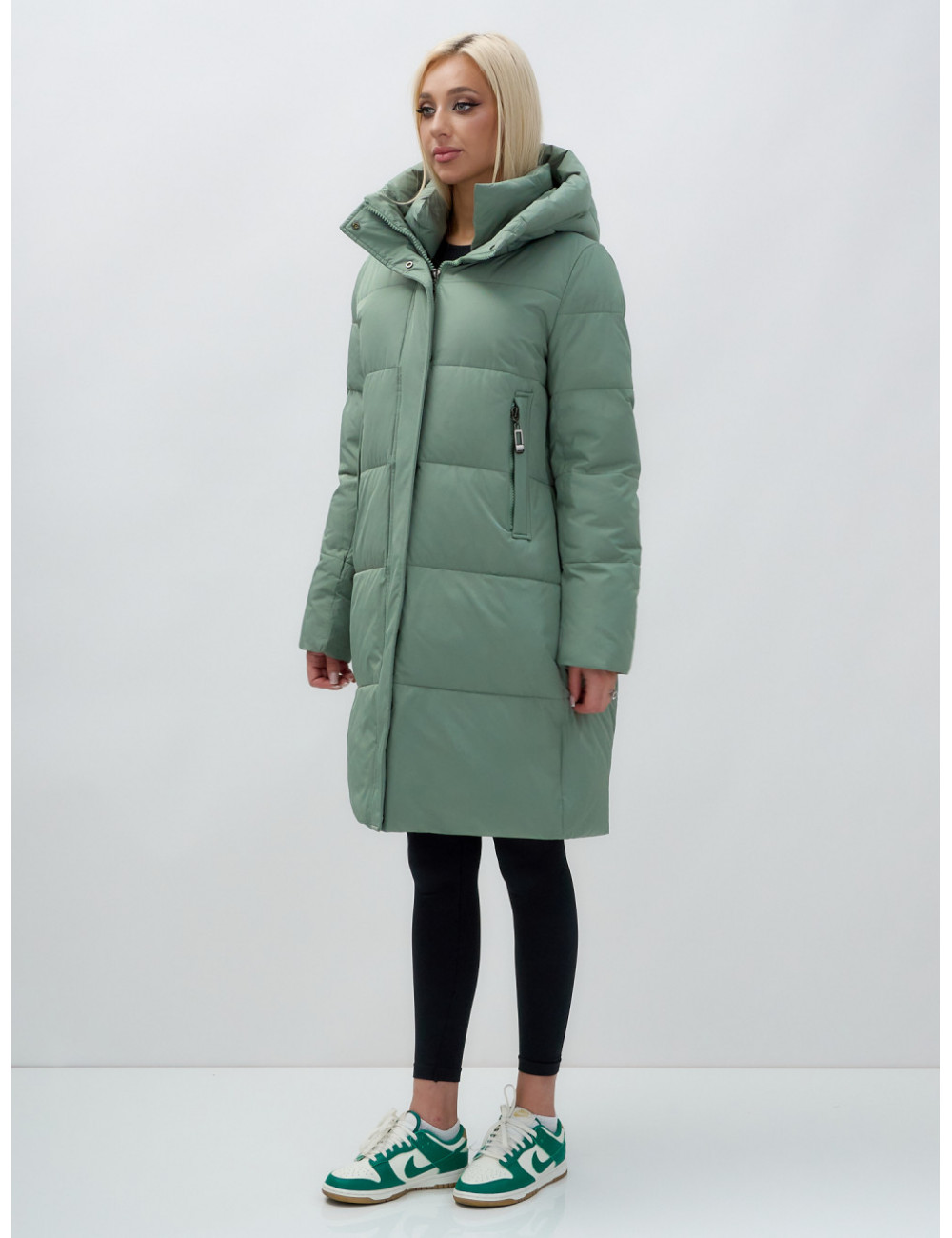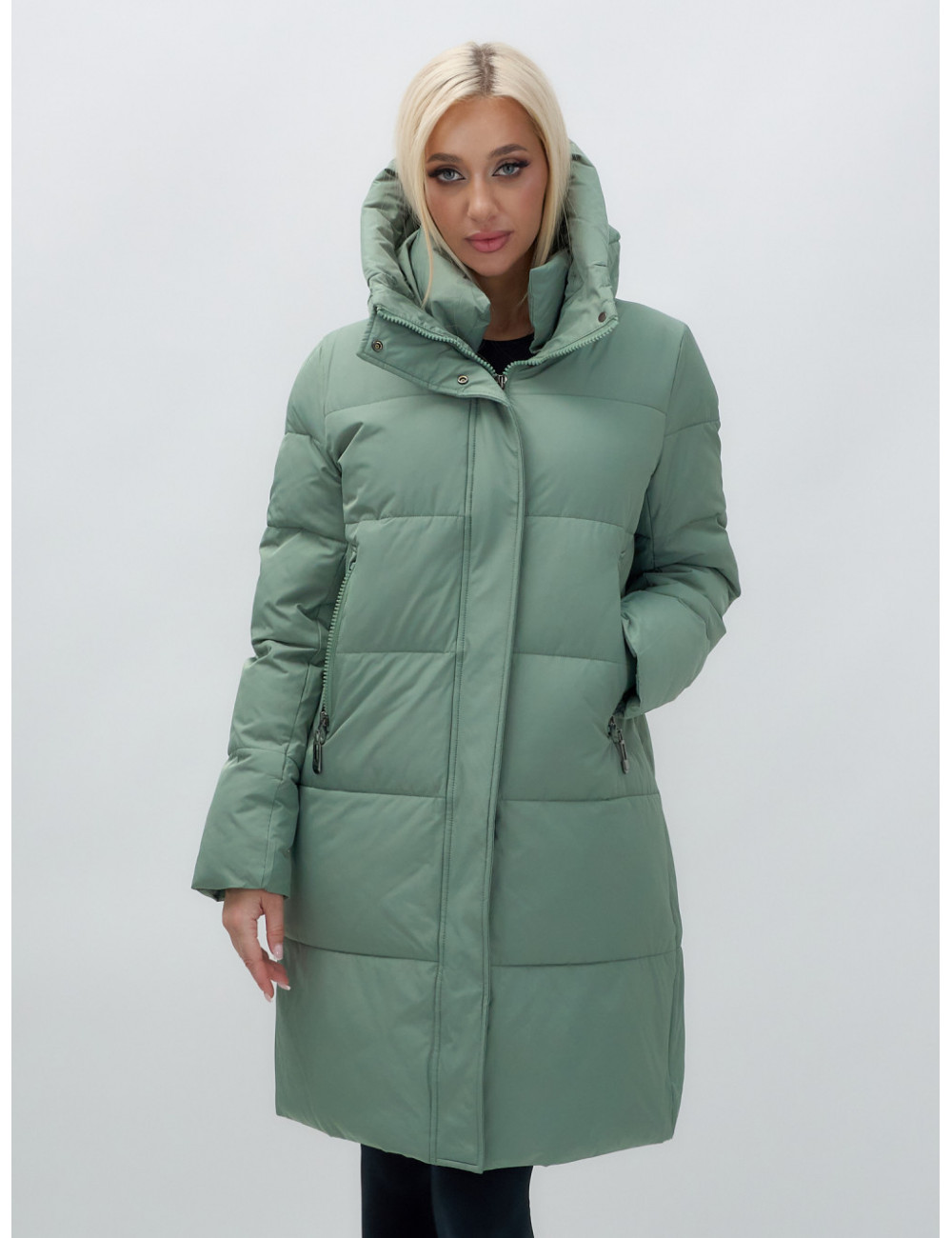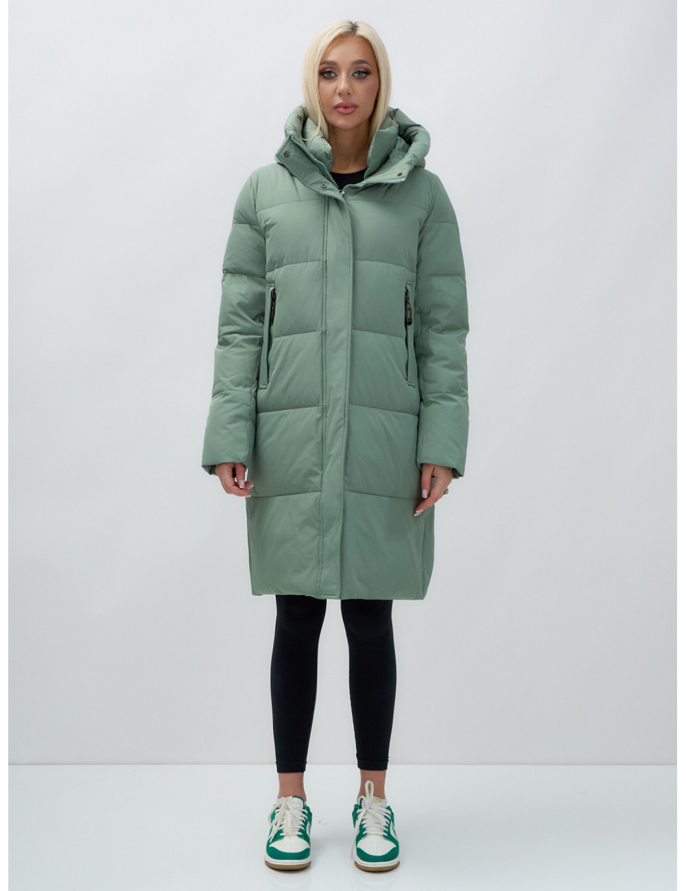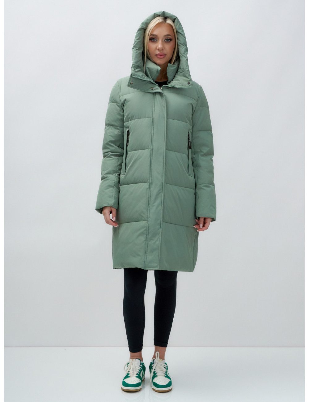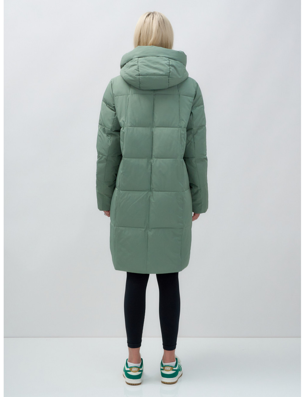 Пуховик отлично сочетается с джинсами, брюками и платьями. Его можно носить с тёплыми шапками и шарфами, создавая стильный и уютный образ. Доставка по Москве и Московской области Женский удлинённый стёганый пуховик с капюшоном, зелёный.