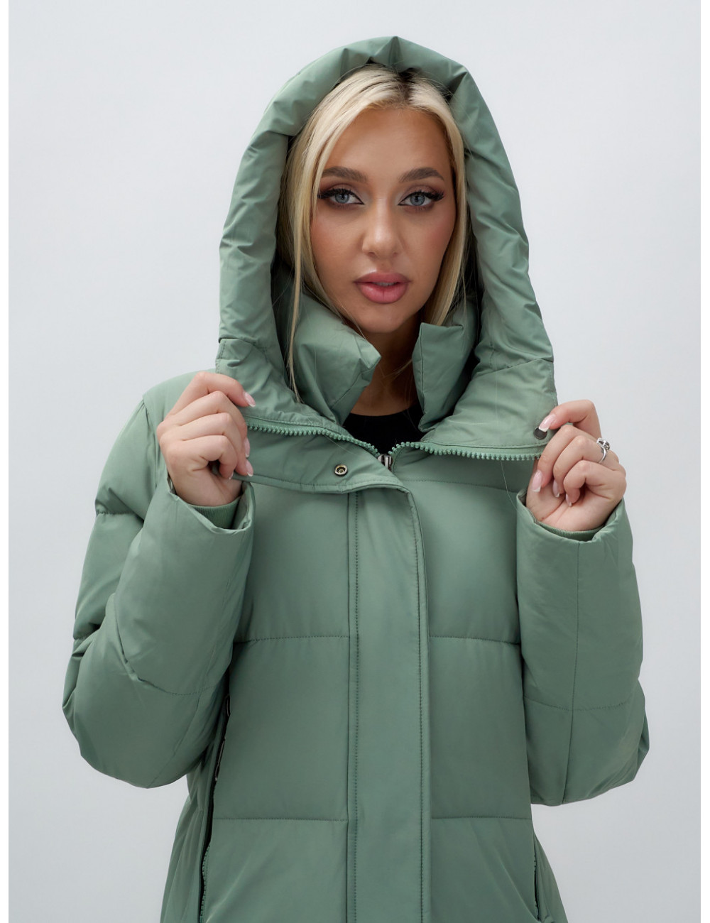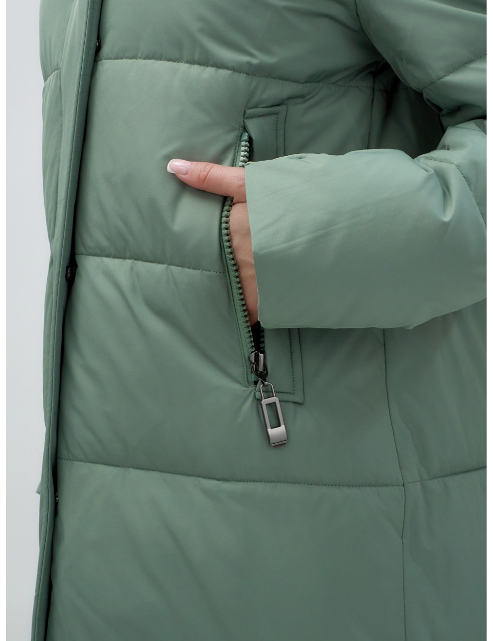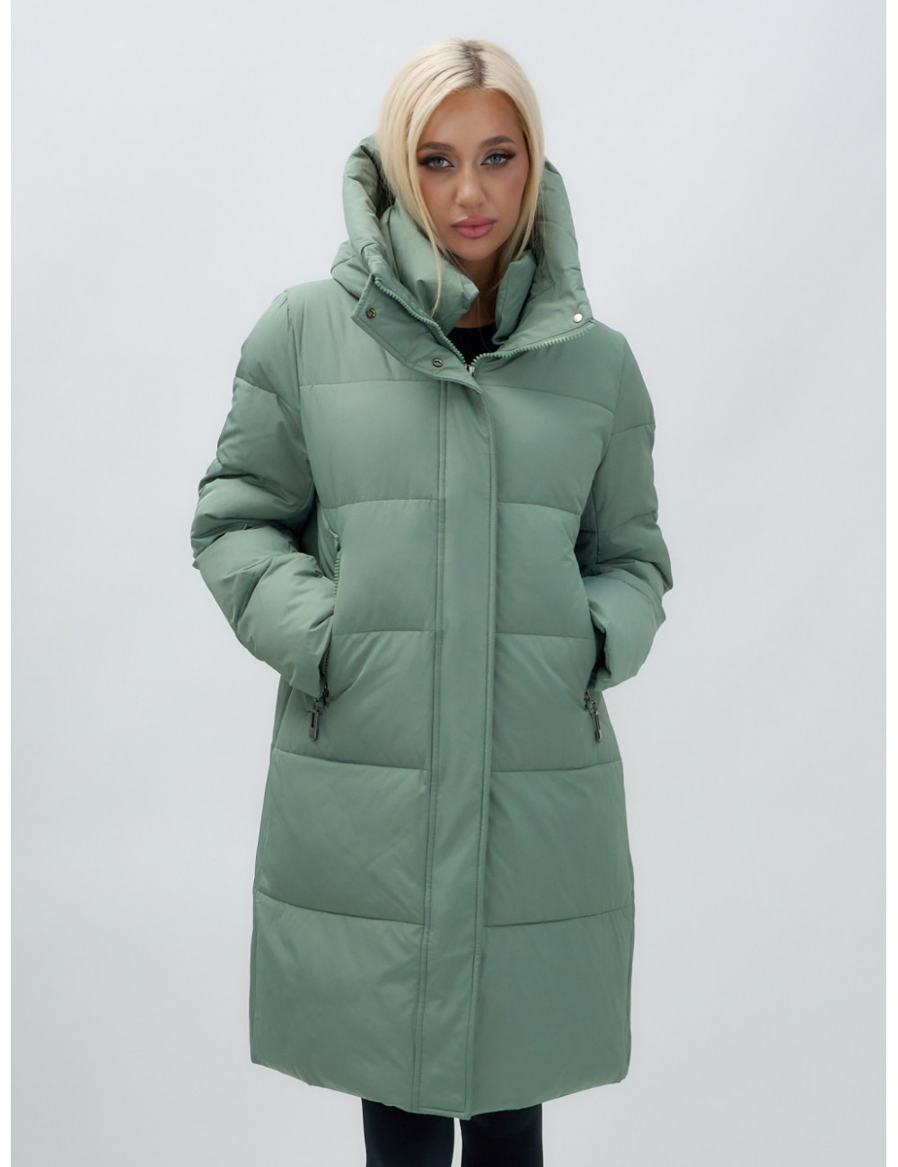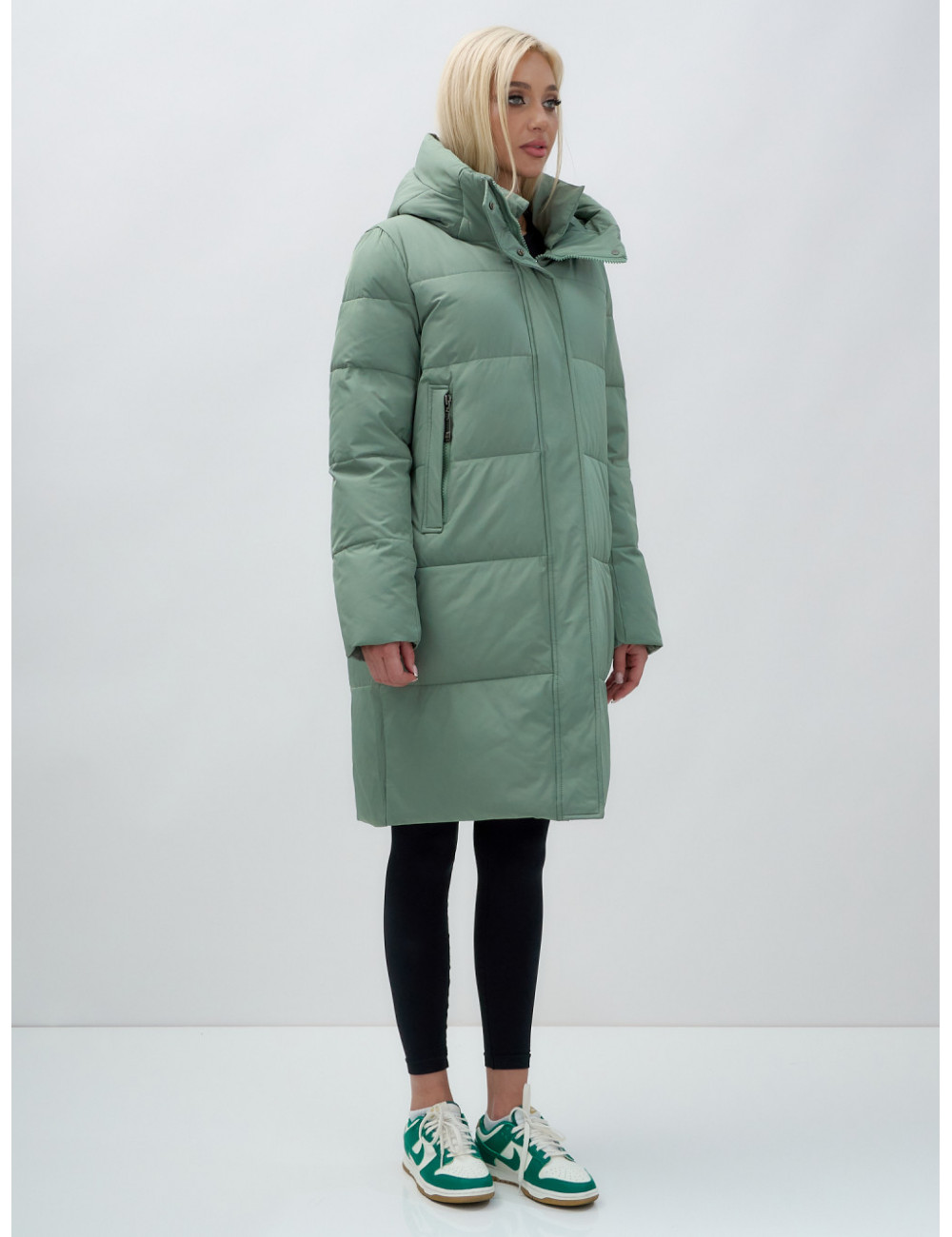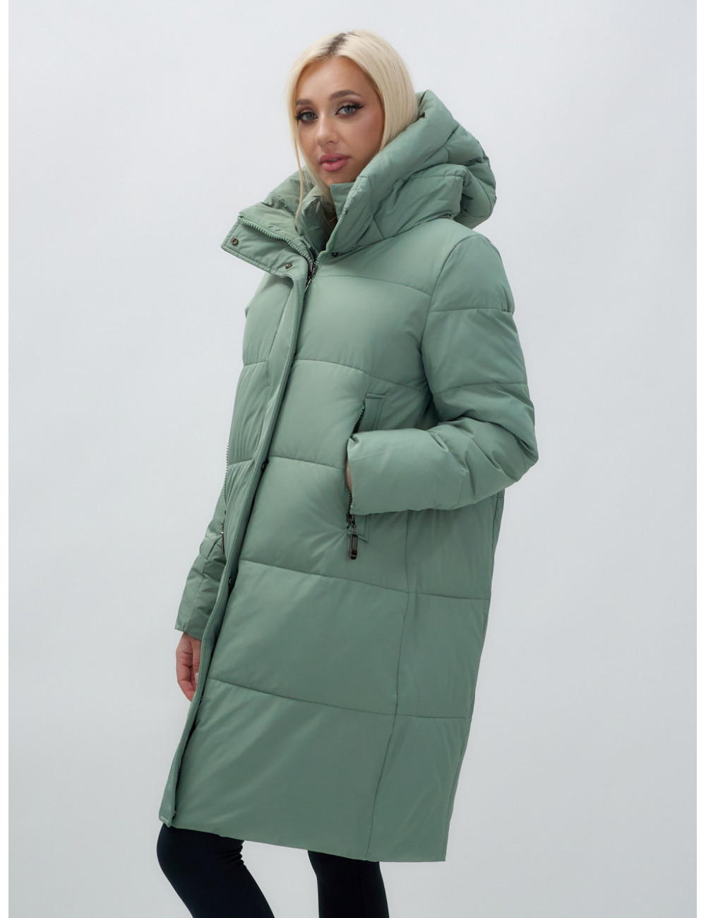 Пуховик отлично сочетается с джинсами, брюками и платьями. Его можно носить с тёплыми шапками и шарфами, создавая стильный и уютный образ. Доставка по Москве и Московской области Женский удлинённый стёганый пуховик с капюшоном, зелёный.
