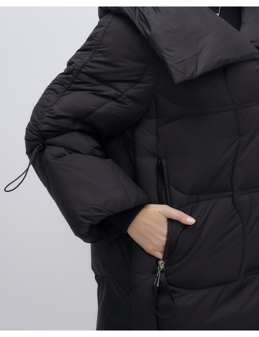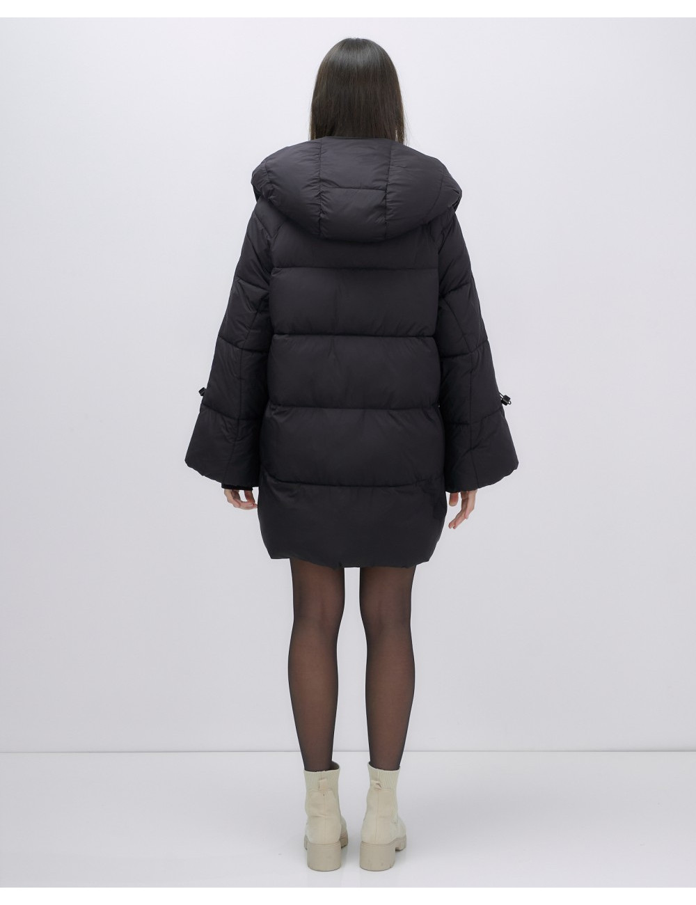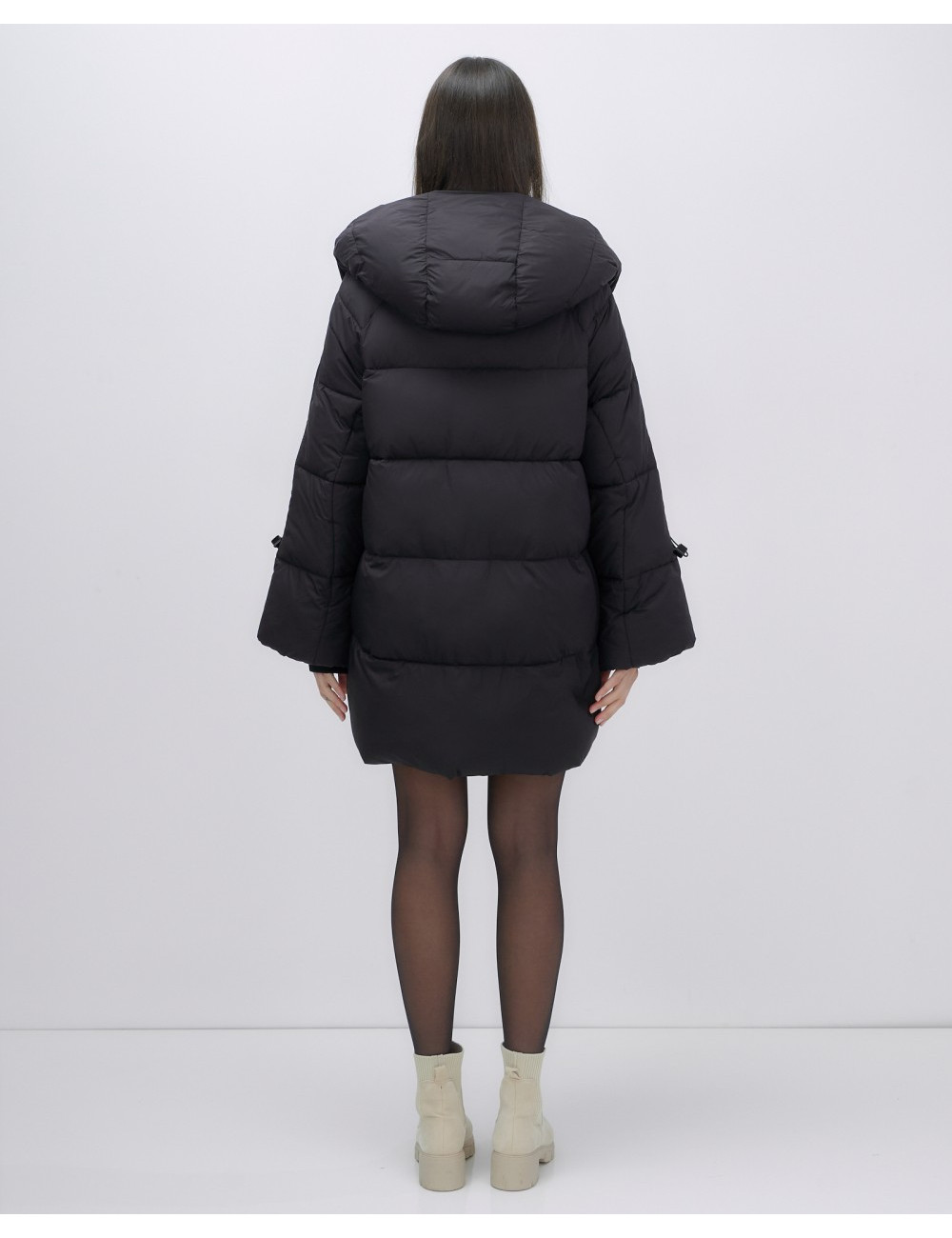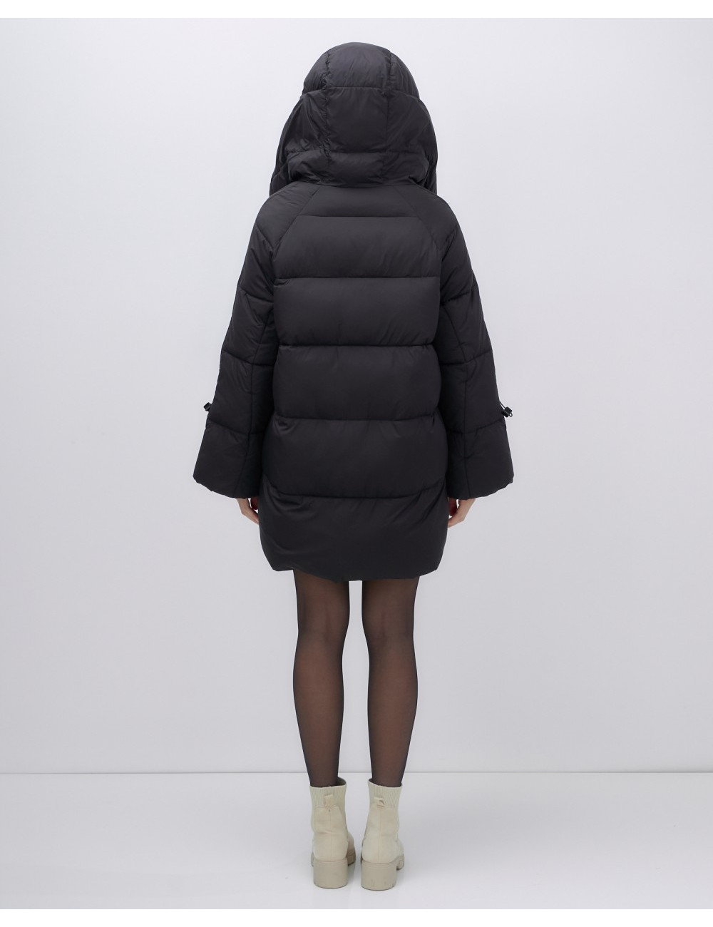 Пуховик средней длины до бедра, с прямым и свободным кроем. Длинные рукава с манжетами и несъёмный капюшон. Внутренние швы проклеены и прошиты для дополнительной защиты от ветра.