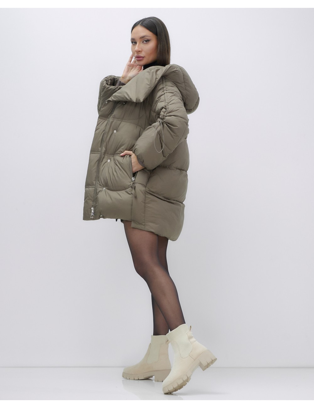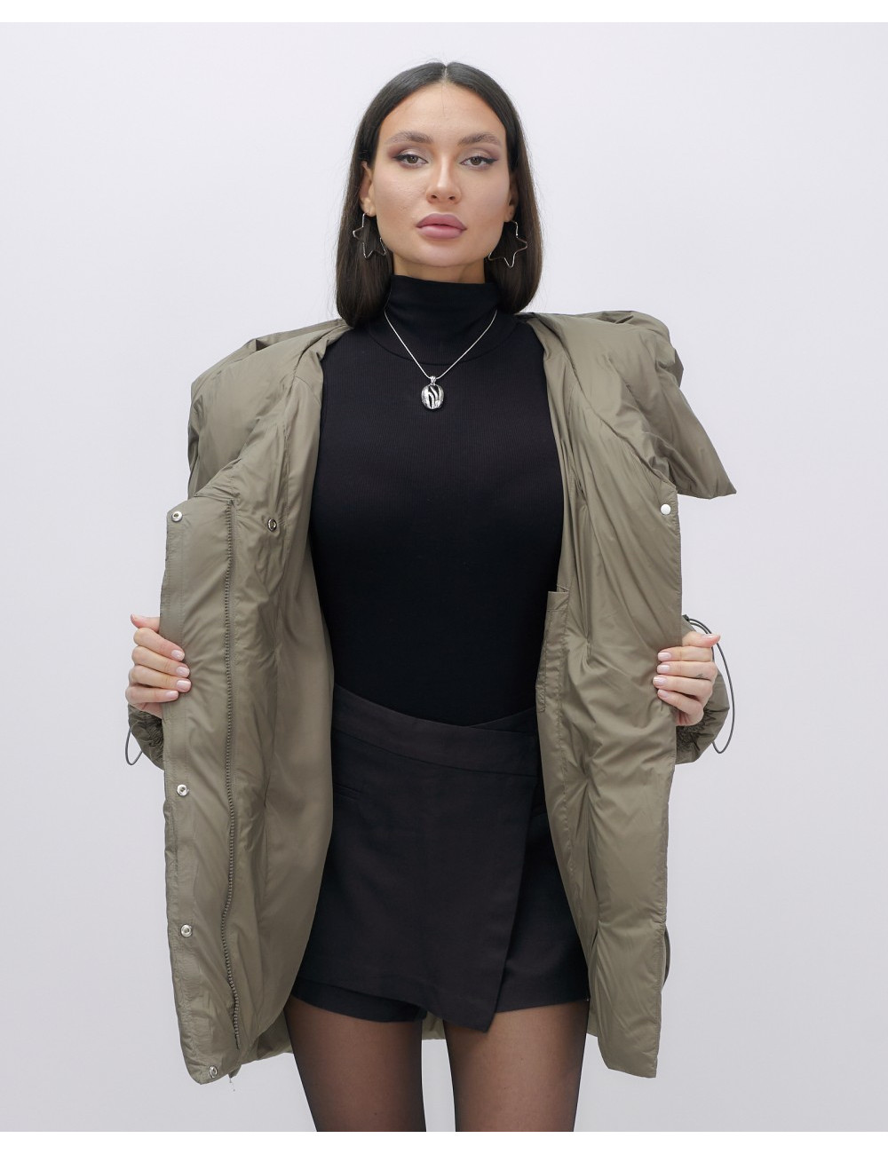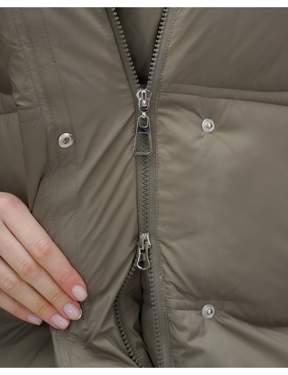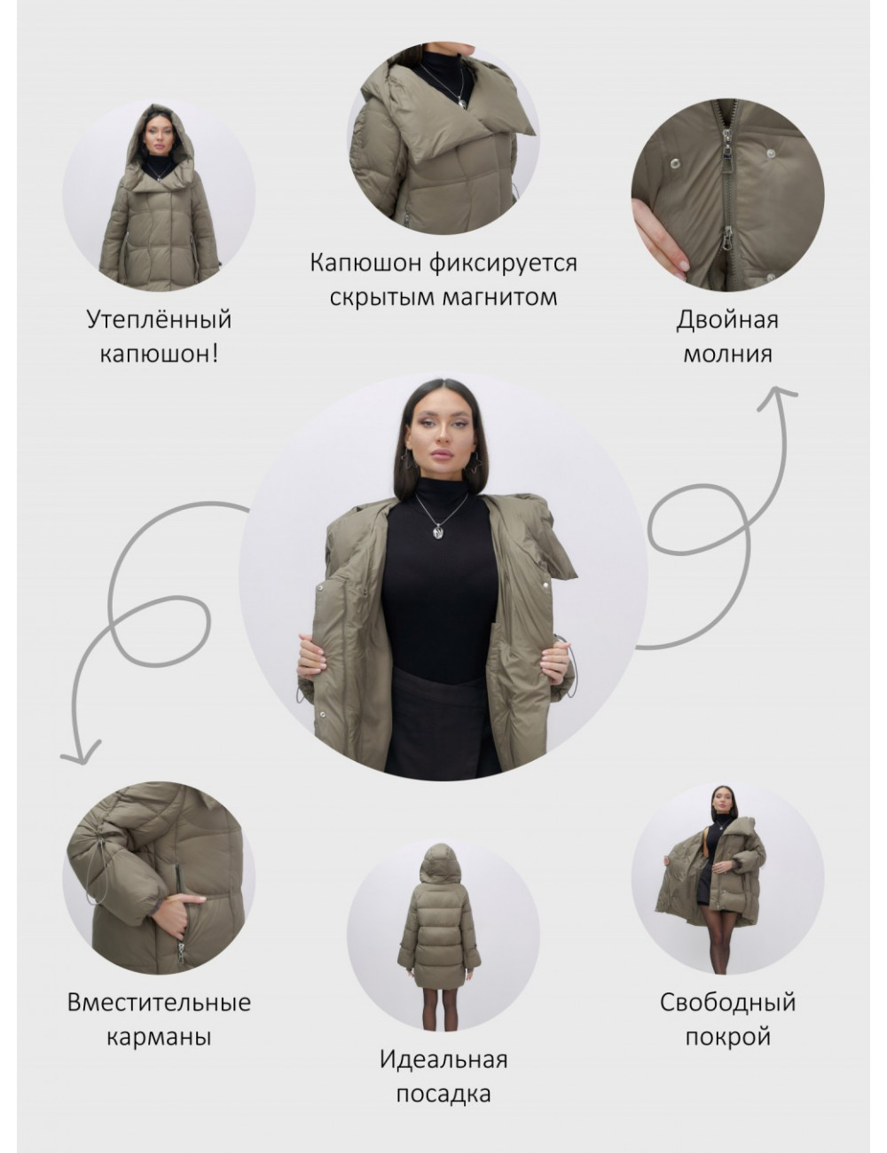Капюшон и молния придают пуховику стильный вид.