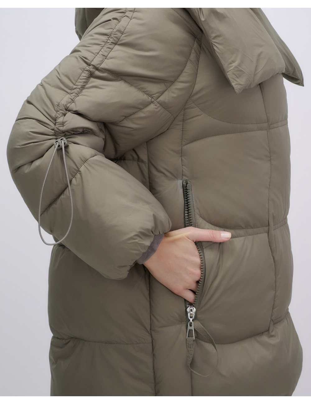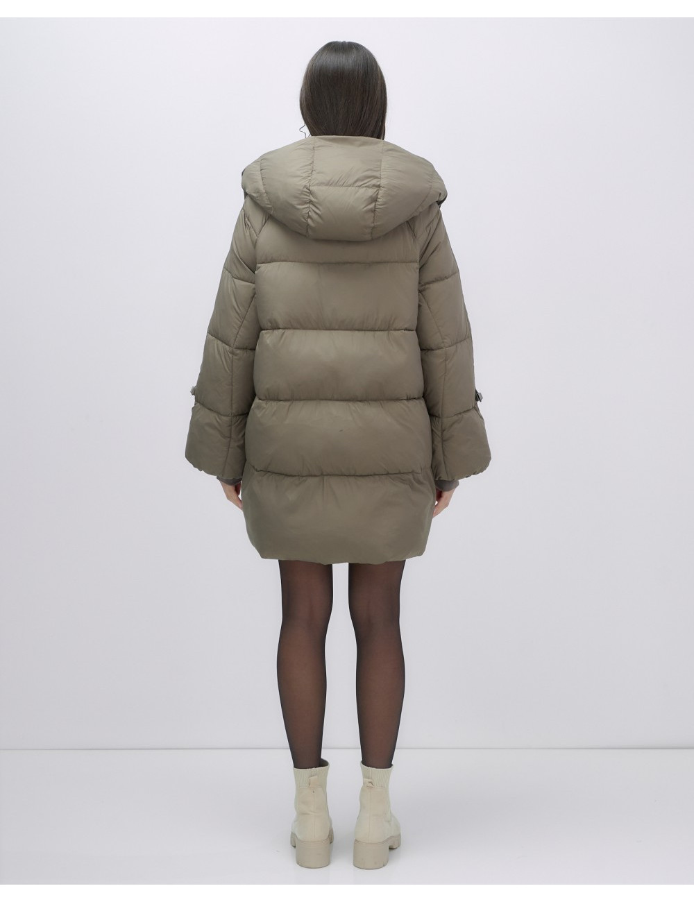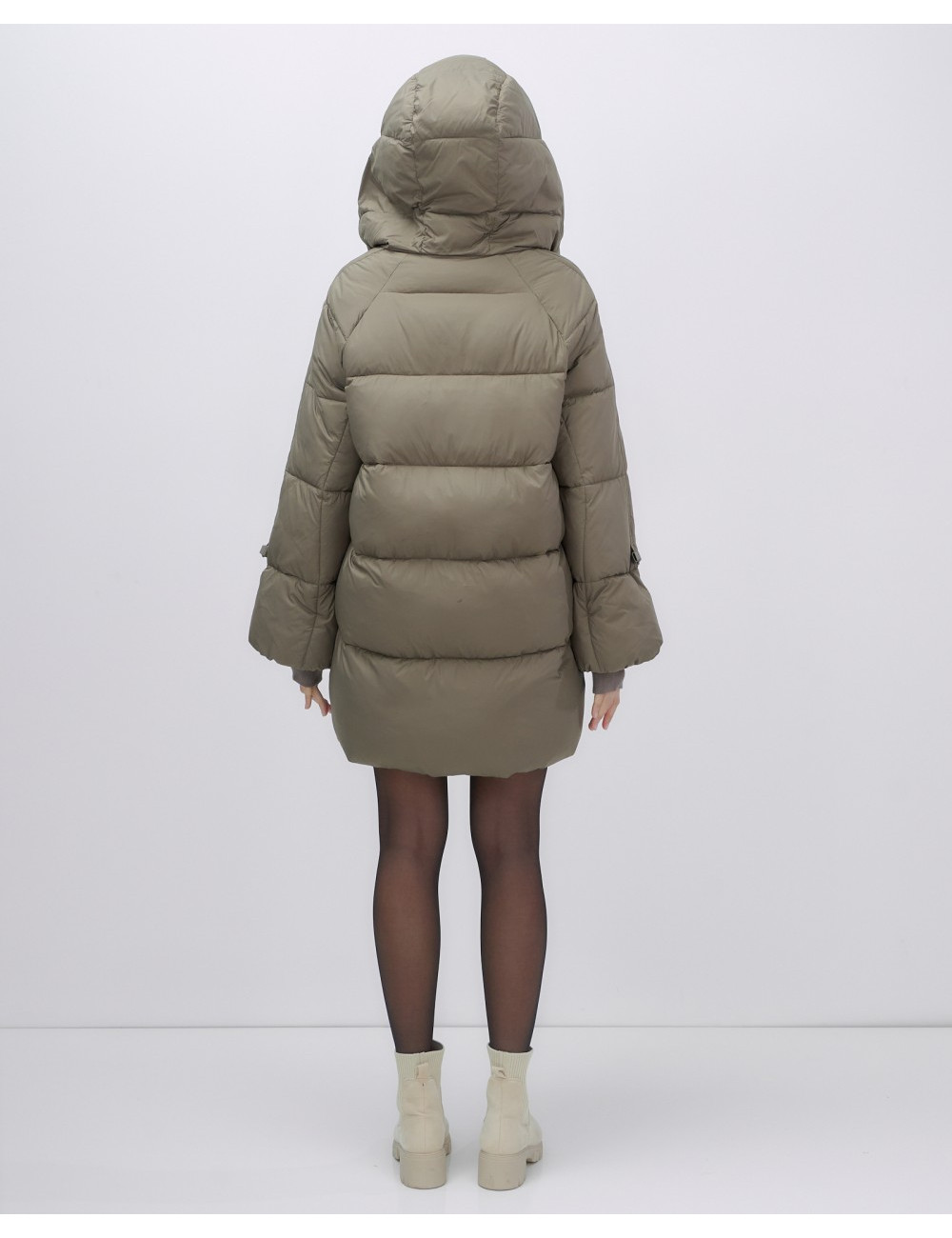 Пуховик средней длины, прямой и свободный крой. Длинные рукава с манжетами и несъёмный капюшон. Внутренние швы проклеены и прошиты для дополнительной защиты от ветра. Внутренние и прорезные карманы на молнии обеспечивают удобное хранение вещей.
