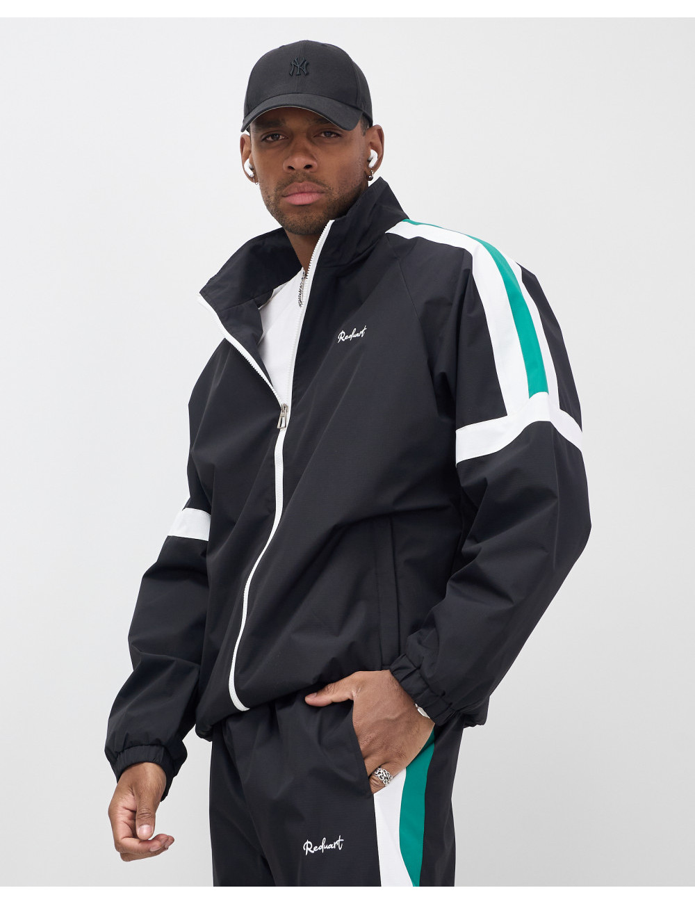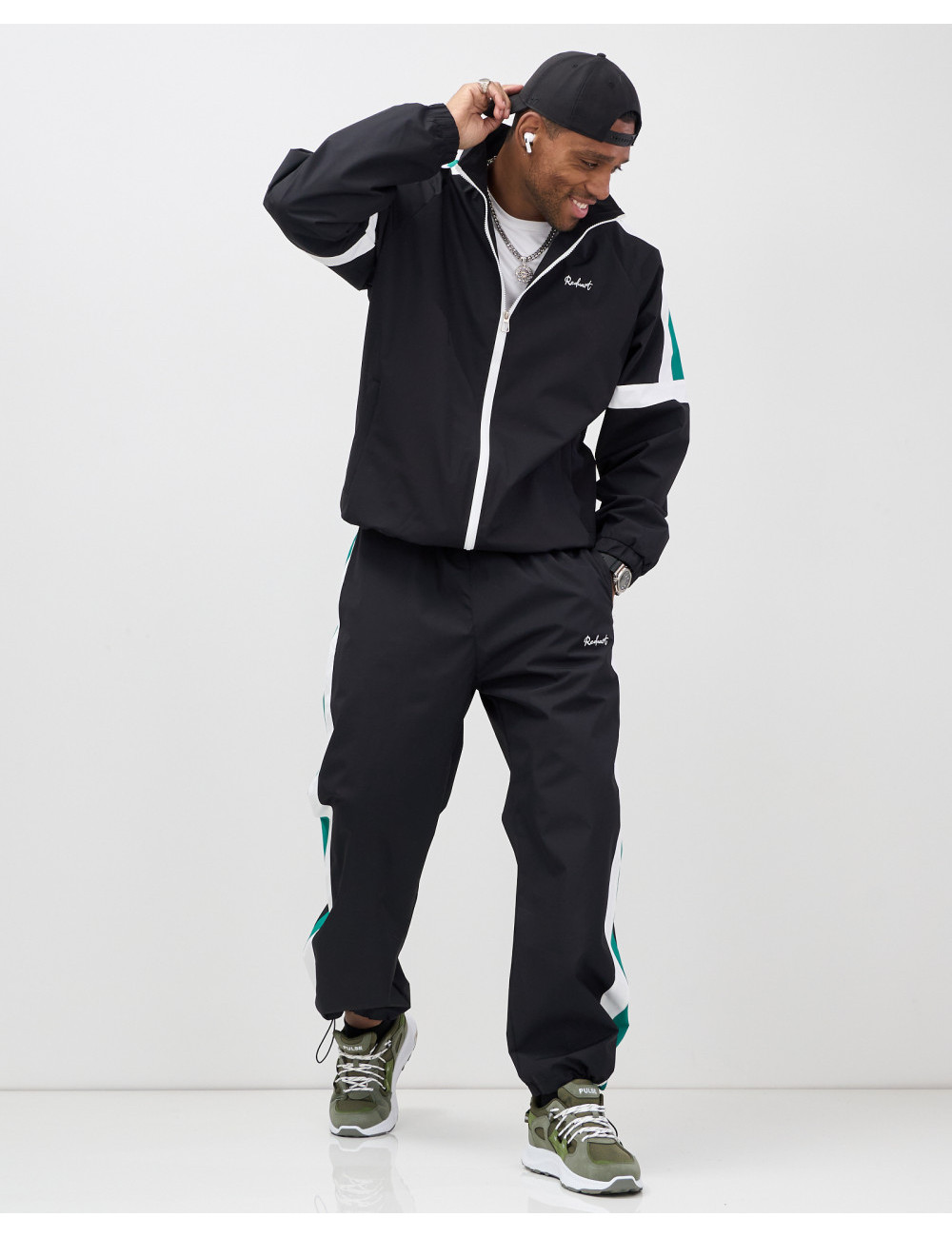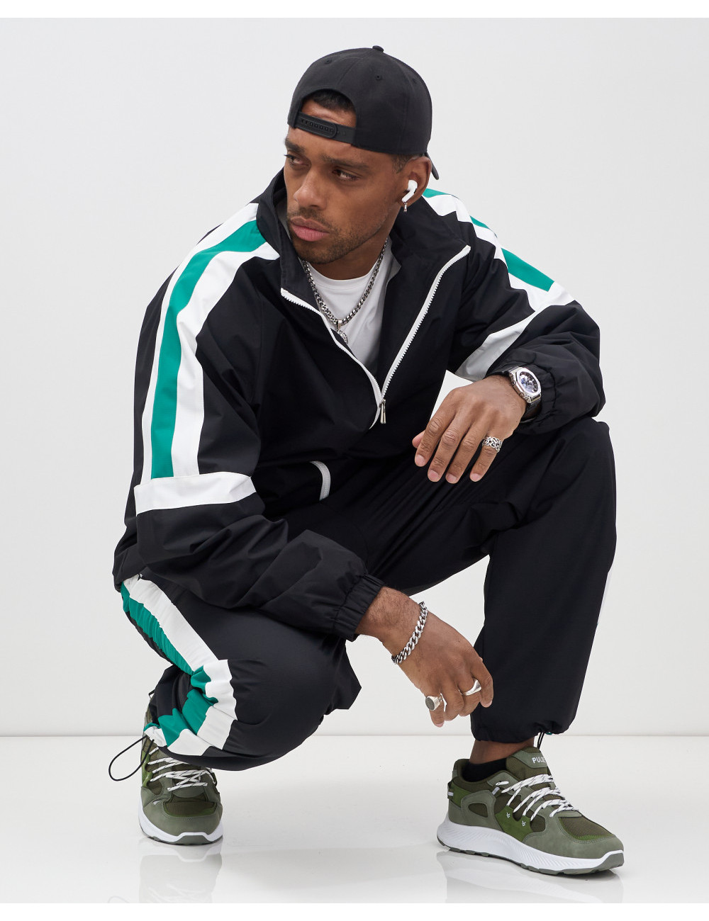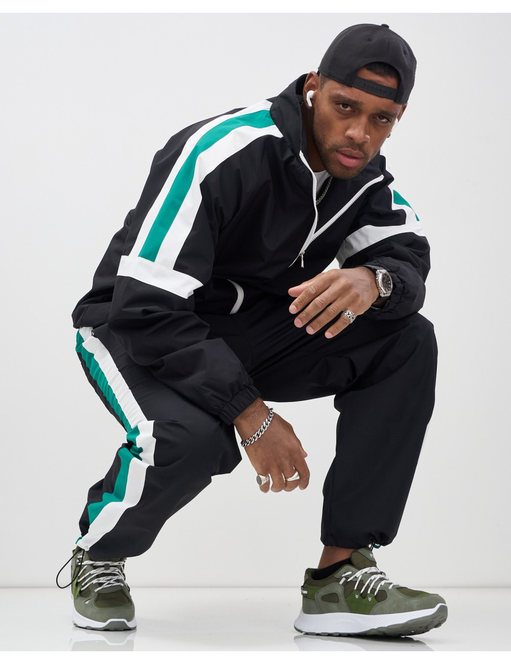 Модель включает в себя олимпийку с длинным рукавом и брюки с фиксатором. Свободный покрой и стояче-отложной вырез горловины придают вам современный вид, который идеально вписывается в уличную моду.