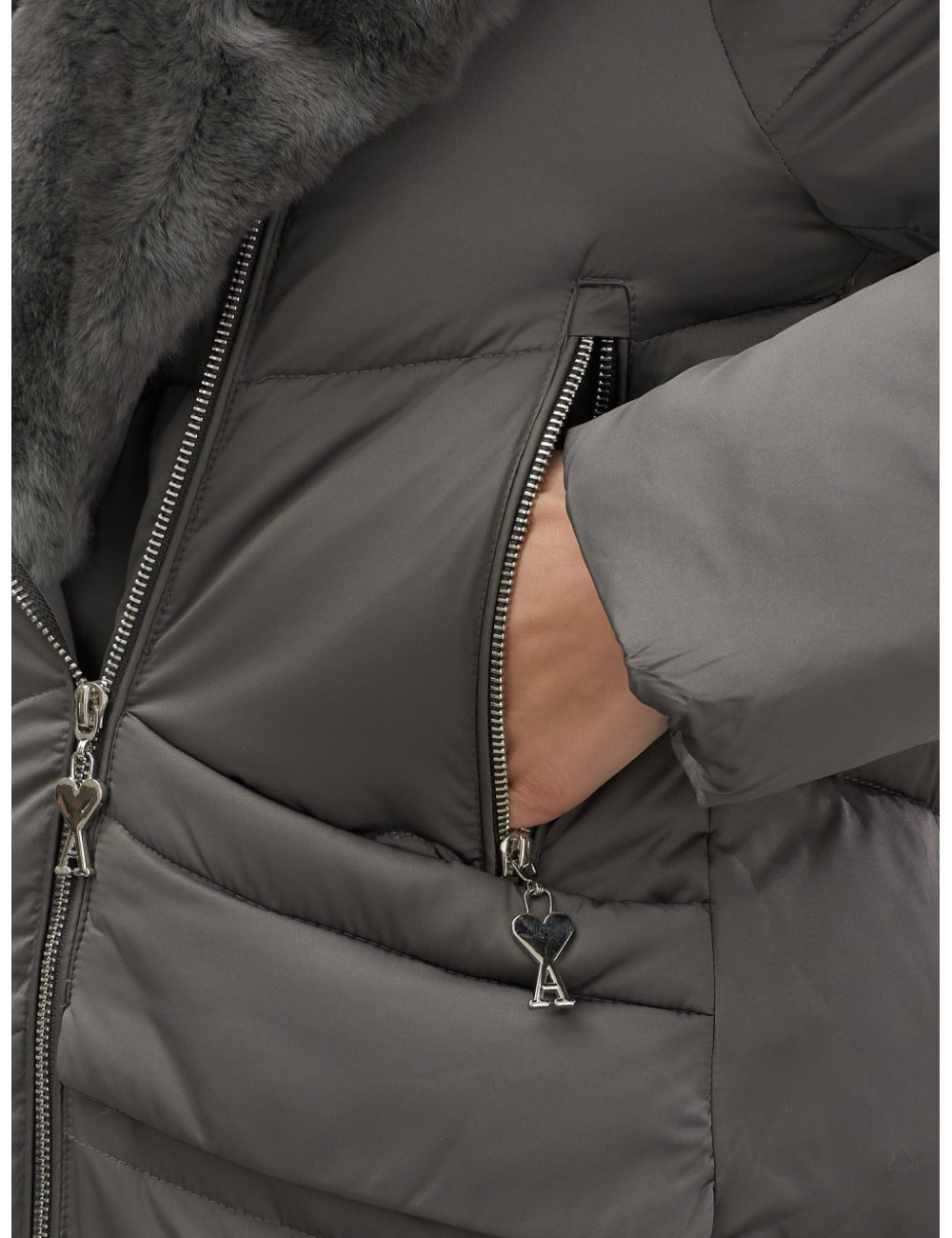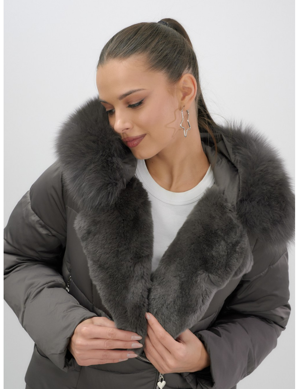 Тёмно-серый утеплённый пуховик с мехом и капюшоном