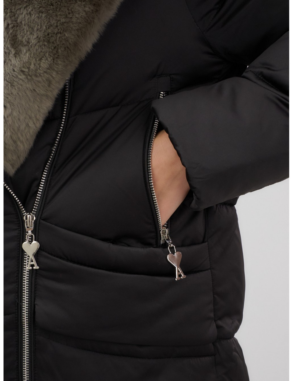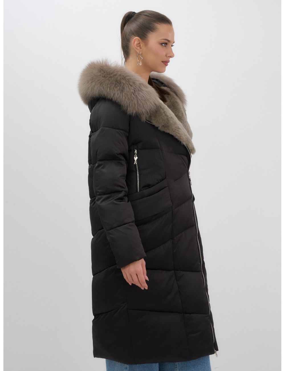 Утеплённый двубортный пуховик с мехом и капюшоном, чёрный