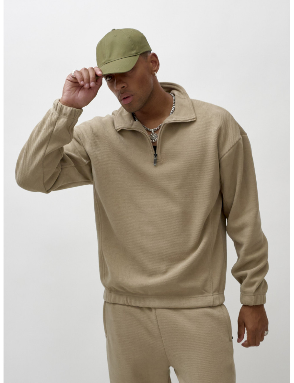 Худи с отложным воротником и спущенными плечами обеспечивает комфорт и свободу движений. Воротник-стойка на молнии не только добавляет стильный акцент, но и защищает от ветра.