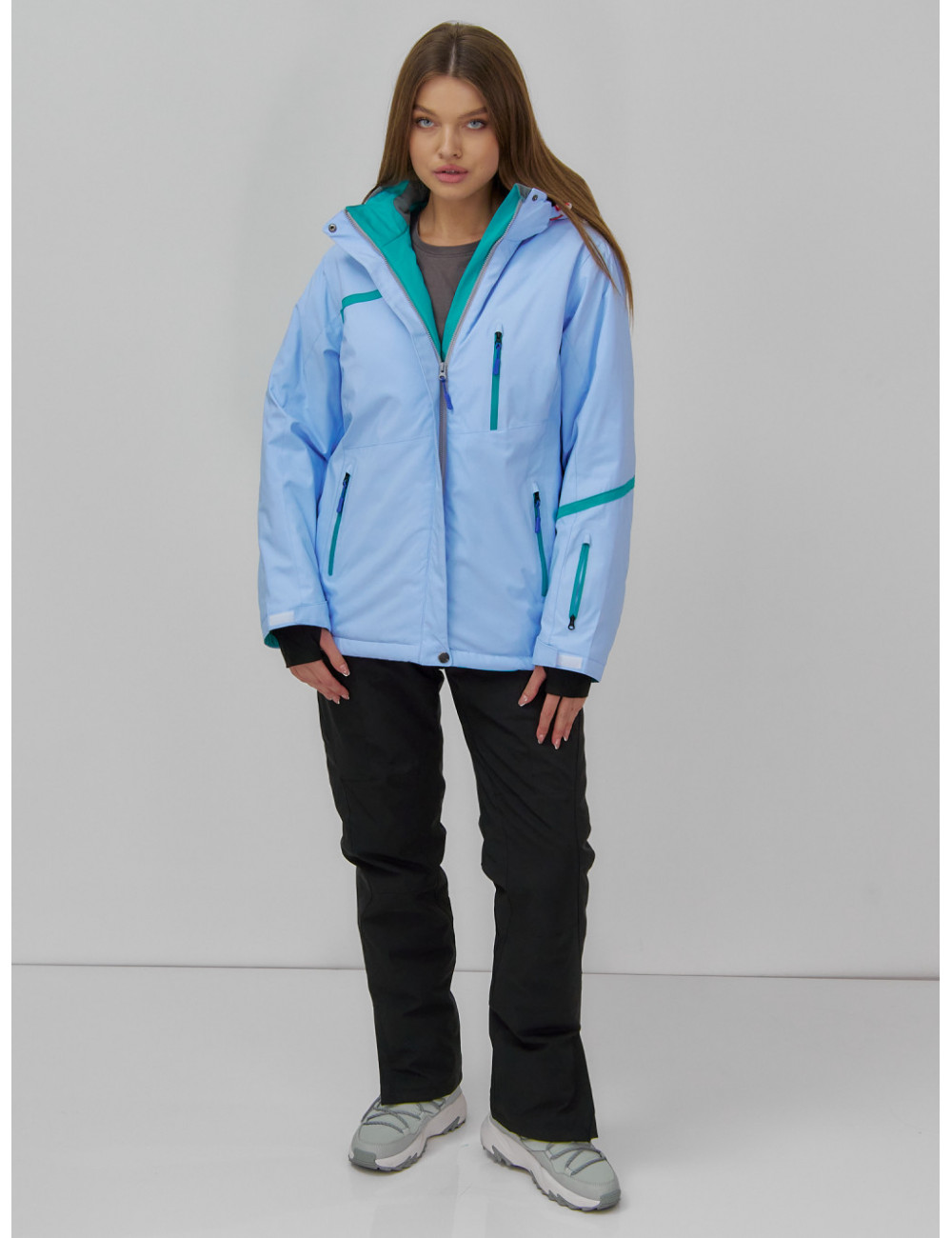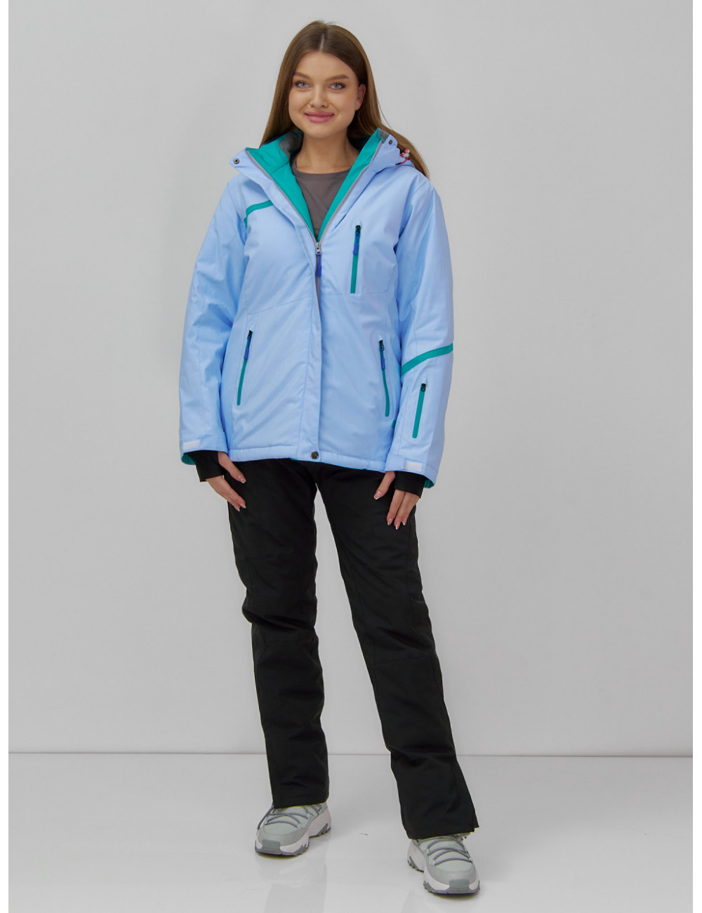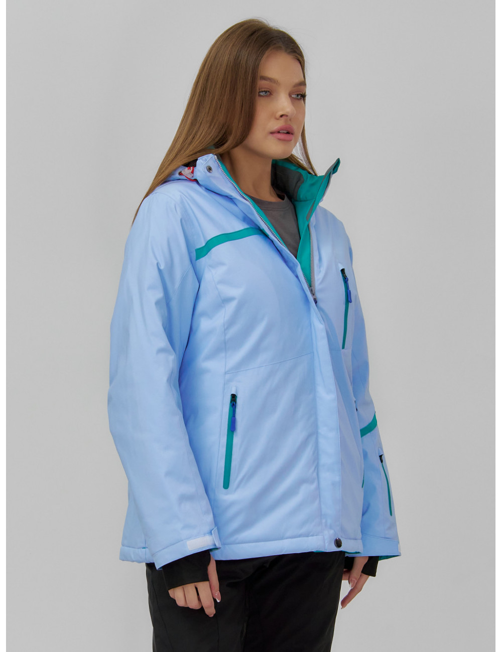 Куртка гармонично сочетается с горнолыжными брюками, термобельём и тёплыми аксессуарами, такими как шапки, перчатки и шарфы. Доставка по Москве и Московской области Женская горнолыжная куртка большого размера, голубая. Зима.