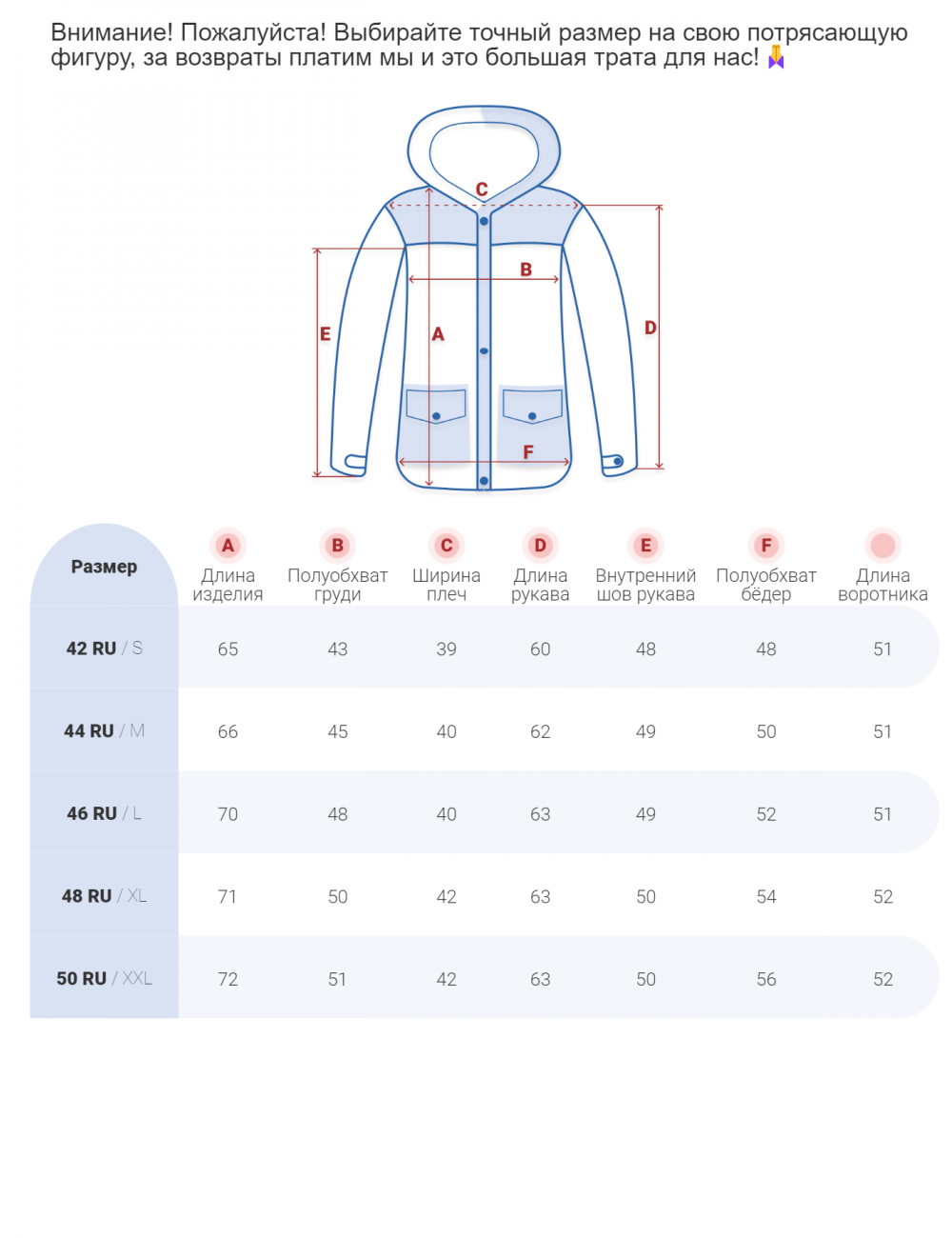 - Длина куртки — измеряется от верхней точки плеча до нижнего края куртки.