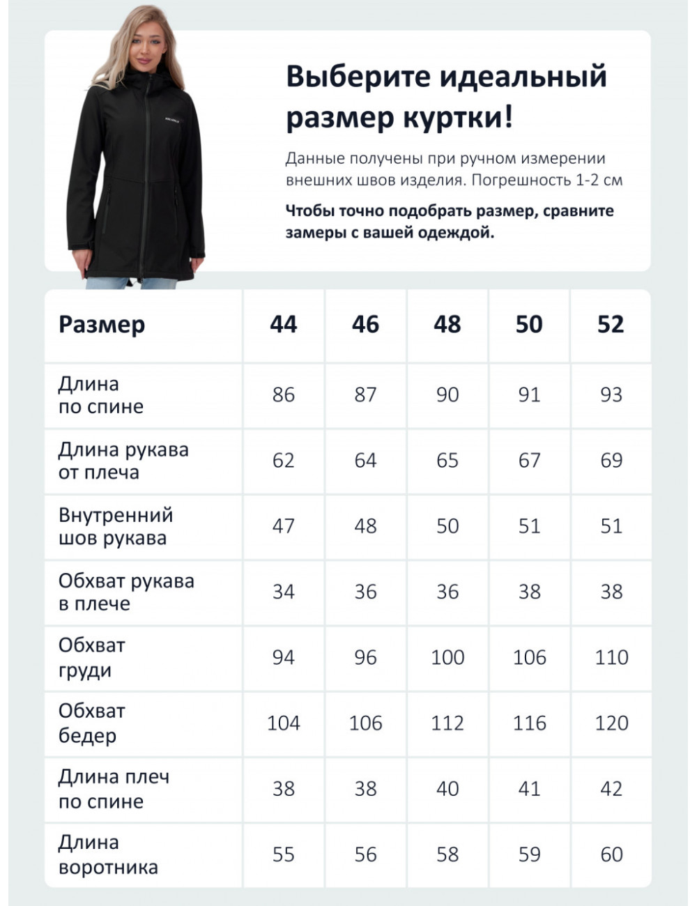 При выборе размера рекомендуется ориентироваться на таблицу размеров, которая учитывает основные параметры (длина изделия по спине, длина рукава, обхват груди и другие). Однако, если у вас есть сомнения, лучше обратиться к консультанту в магазине.