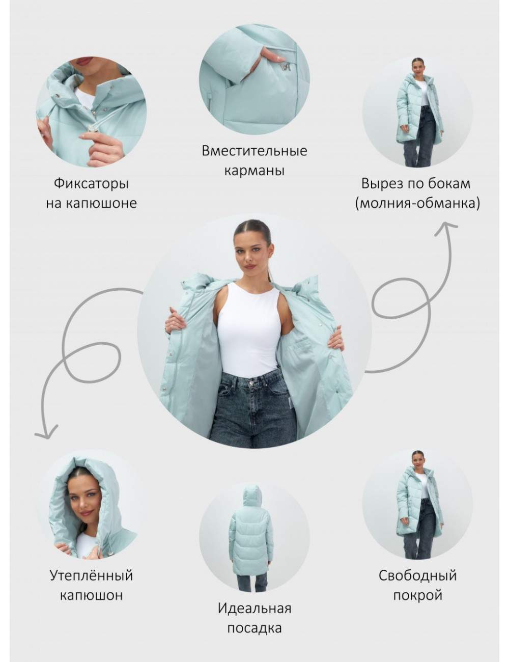 - Длина: средняя длина до колена, что делает куртку практичной и удобной.