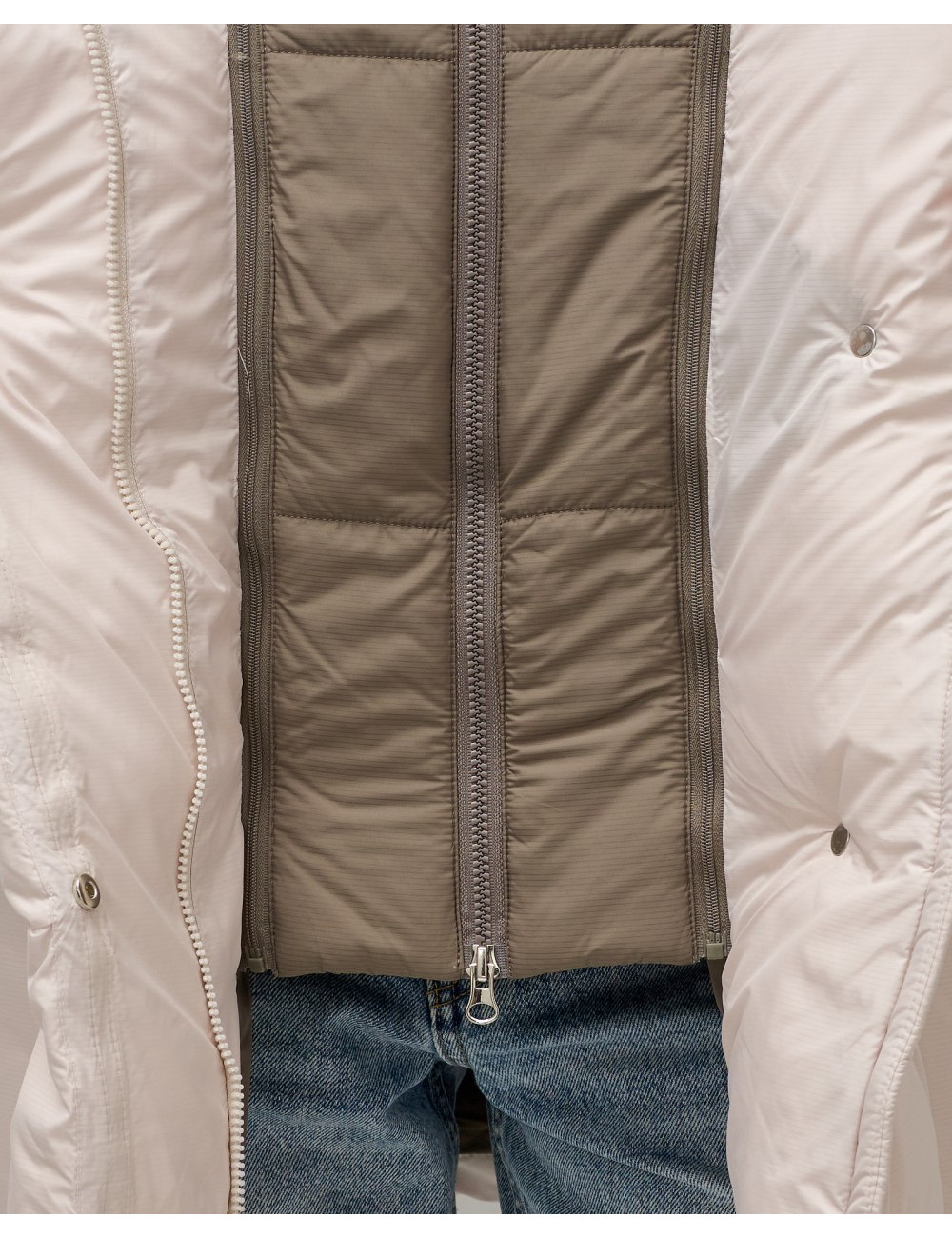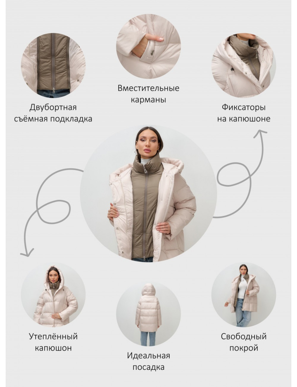 - Функциональность: укороченный подол, внутренние карманы и фиксатор на капюшоне добавляют удобства в повседневной носке. Длинные рукава на манжете и съёмный воротник придают модели дополнительную функциональность.