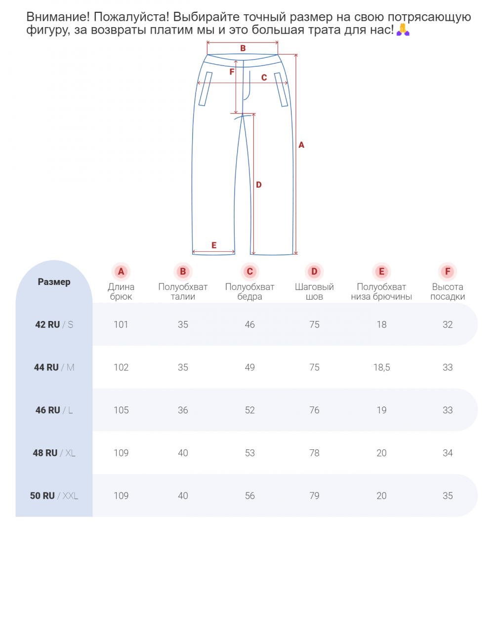 Для выбора идеального размера рекомендуется измерить следующие параметры: длина брюк, полуобхват талии, полуобхват бёдер, шаговый шов, полуобхват низа брючины и высота посадки.